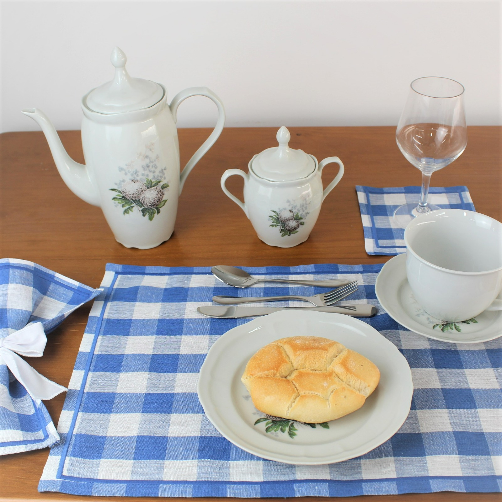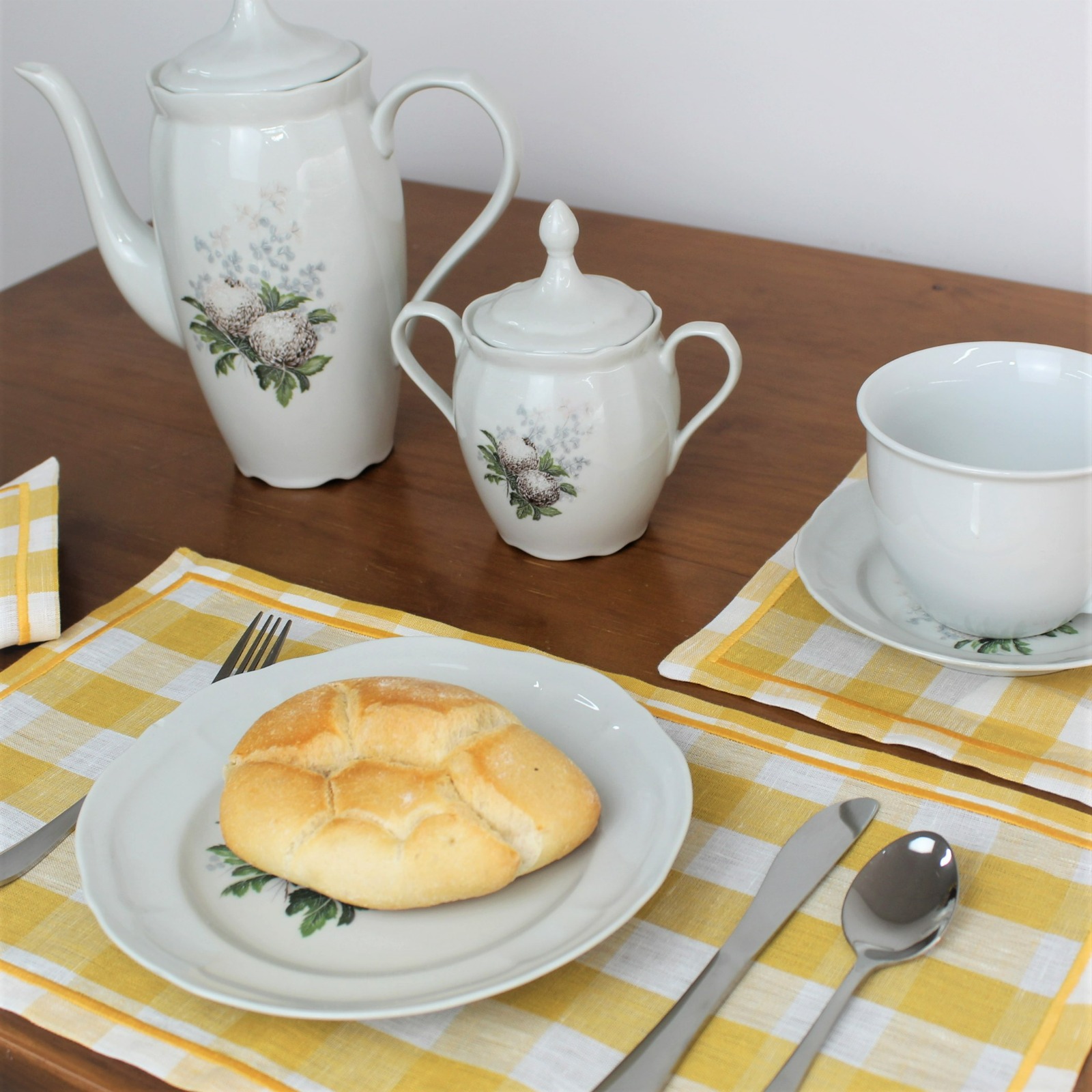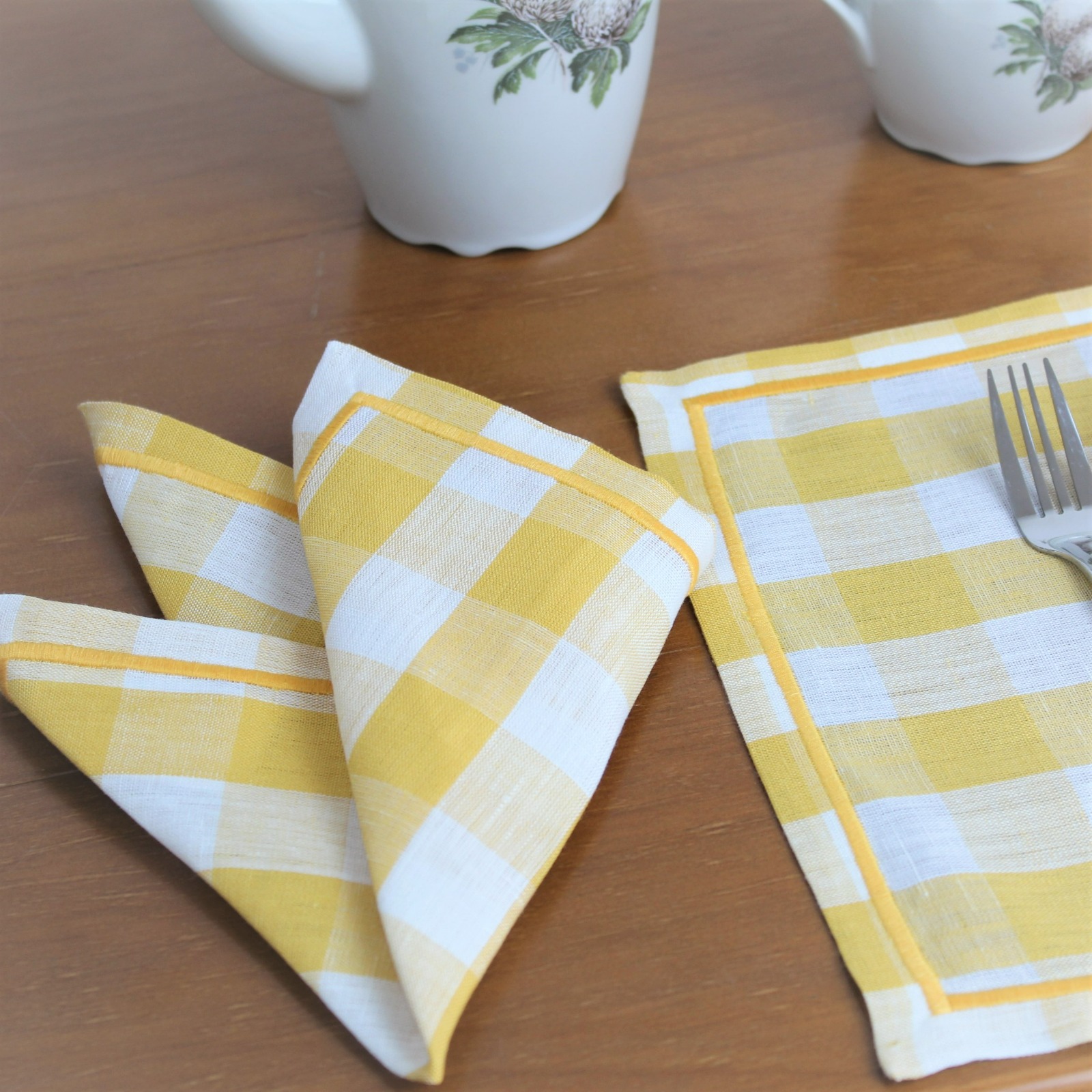 Individual de mesa e guardanapo em linho, com acabamento de rolinho.