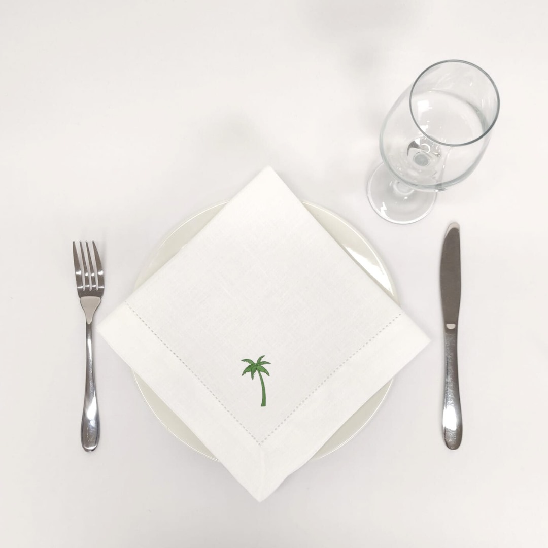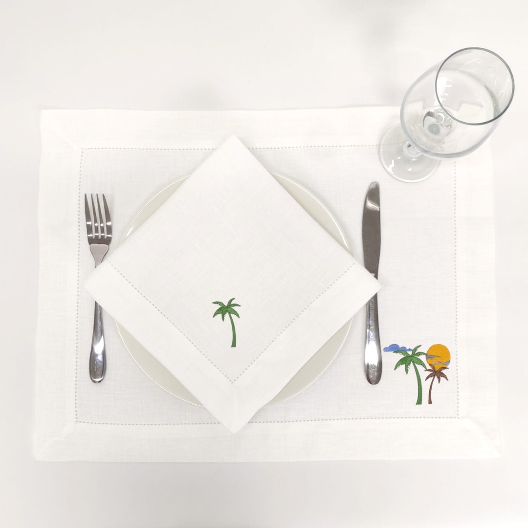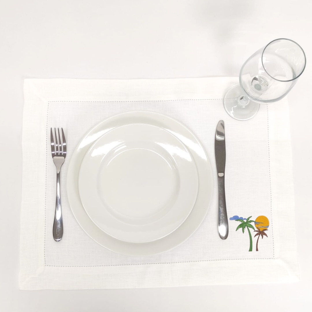 Individual e Guardanapo em linho branco com bordado e acabamento em ponto aberto.