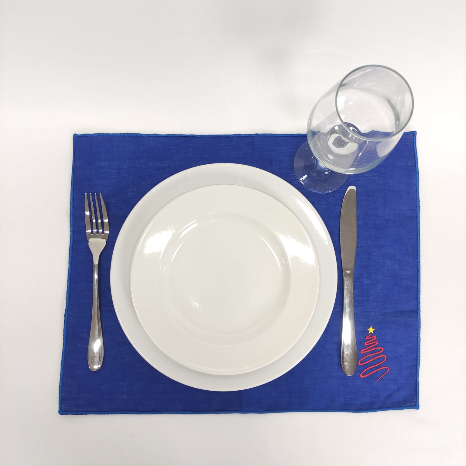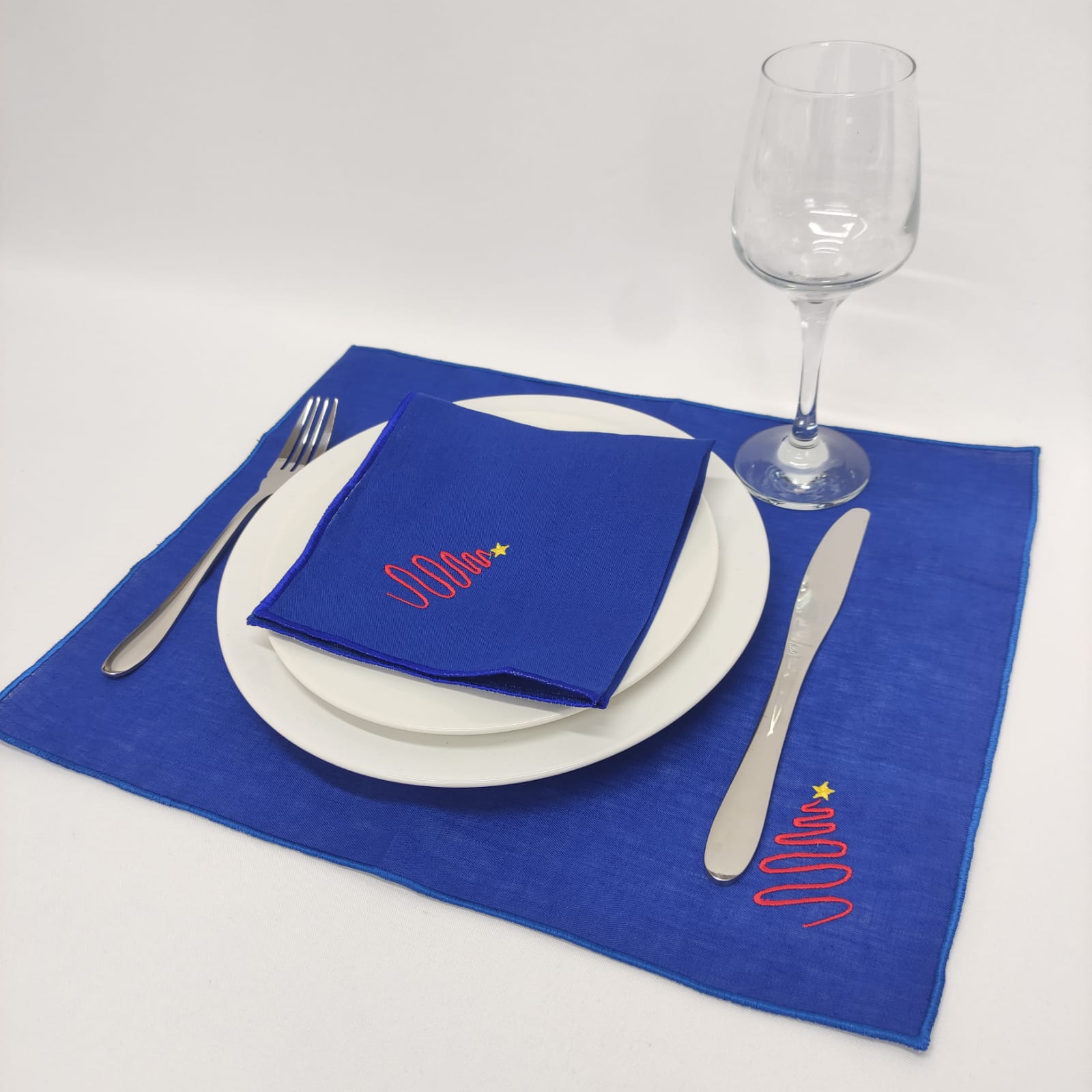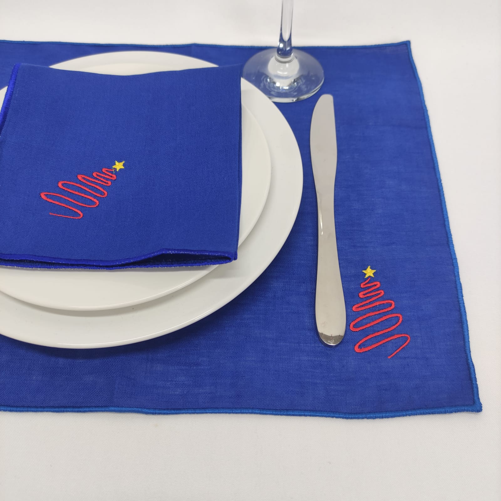 Individual e guardanapo em linho azul com acabamento rolinho na mesma cor e bordado alusivo ao natal.