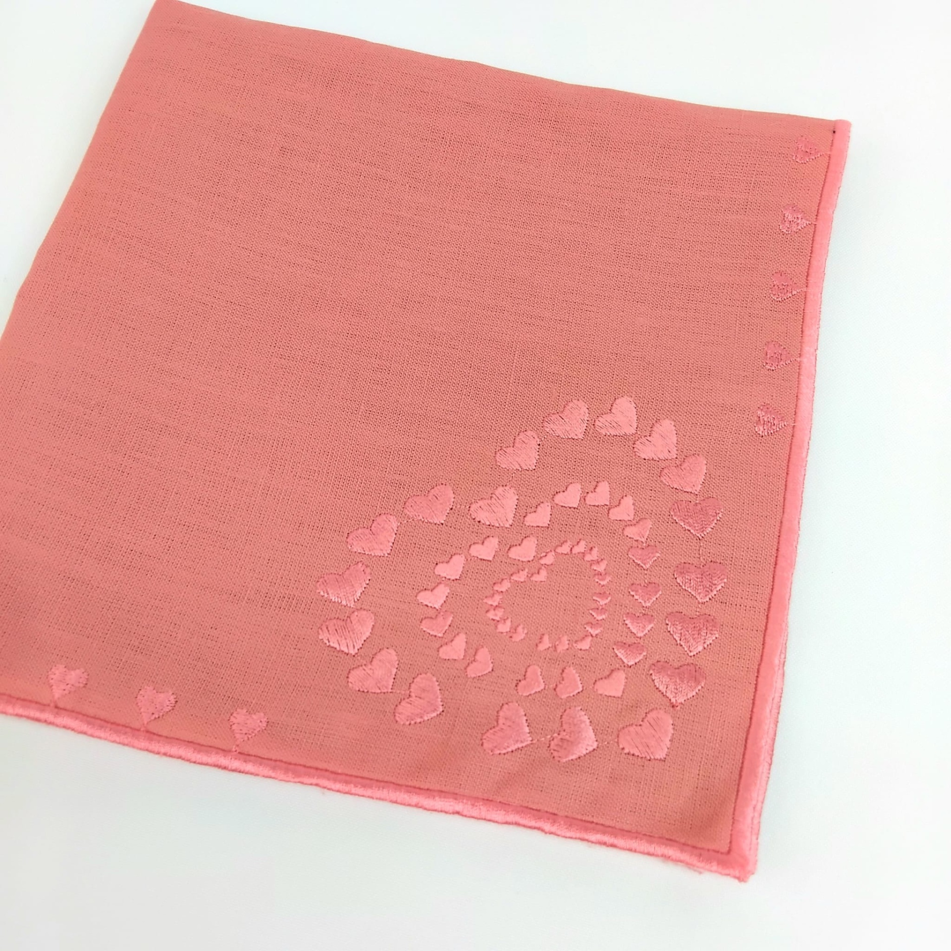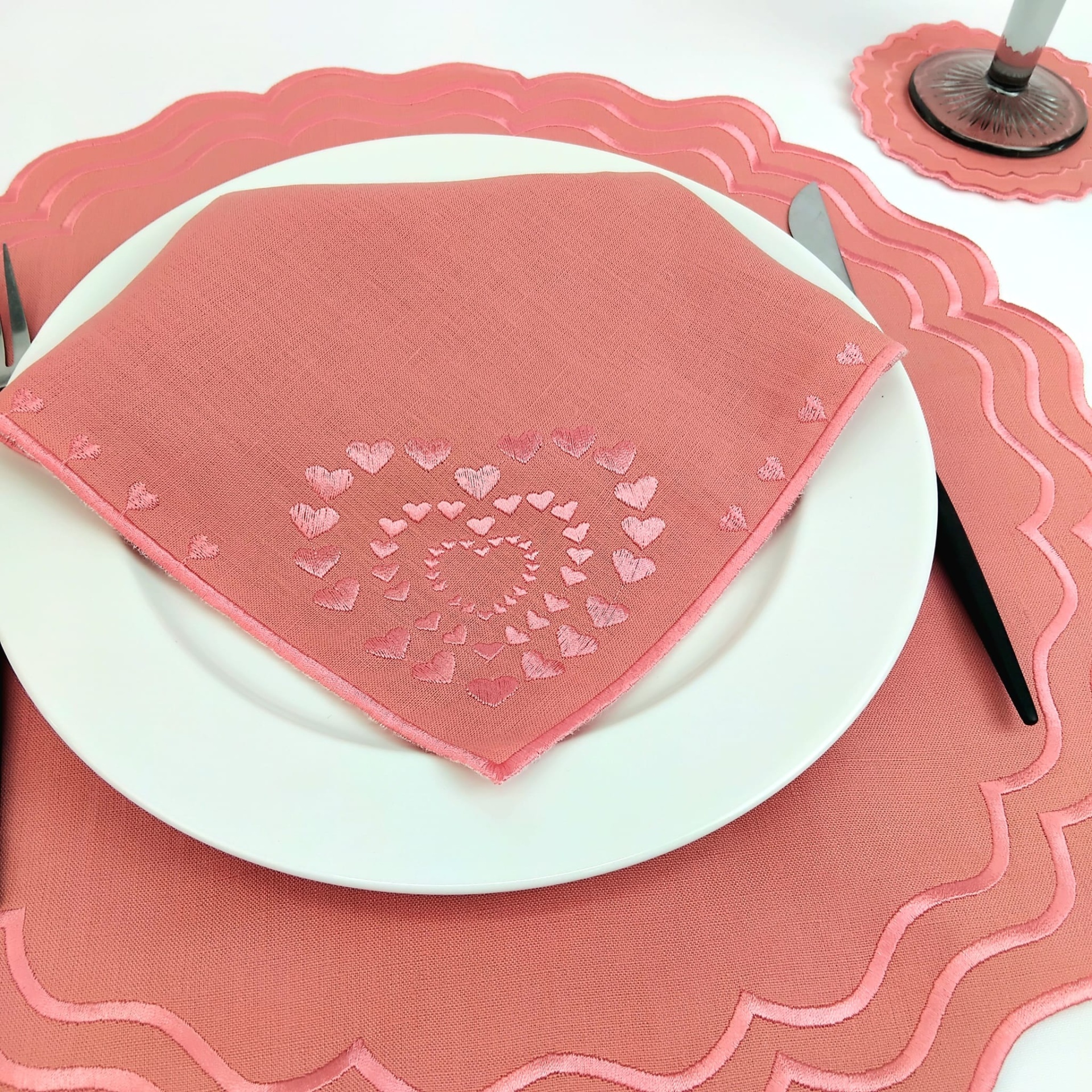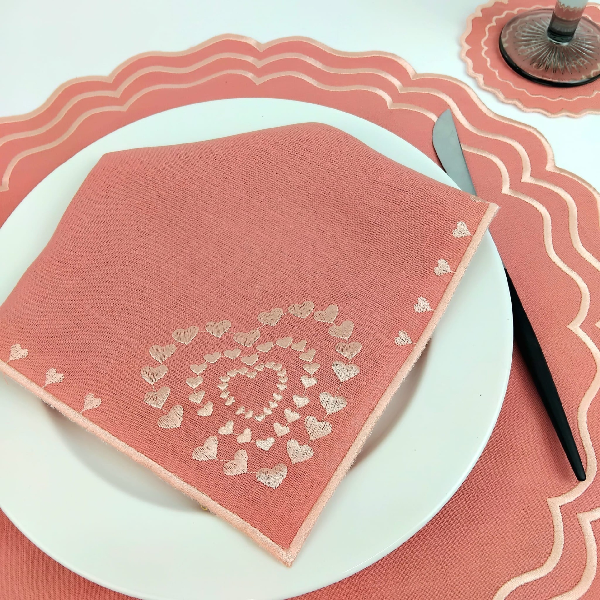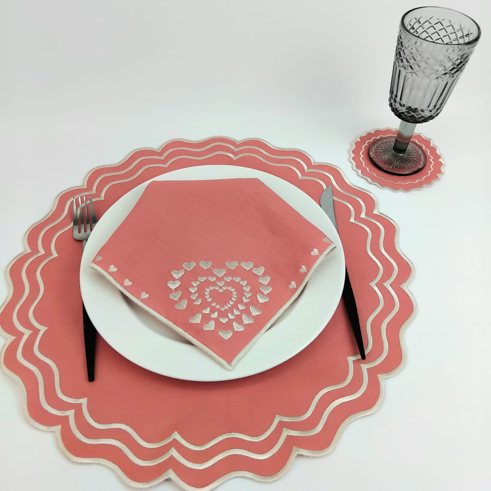 Individual, guardanapo e base de pão/copo em linho tom salmão. Guardanapo com bordado corações. Acabamento de rolinho á cor do bordado.
