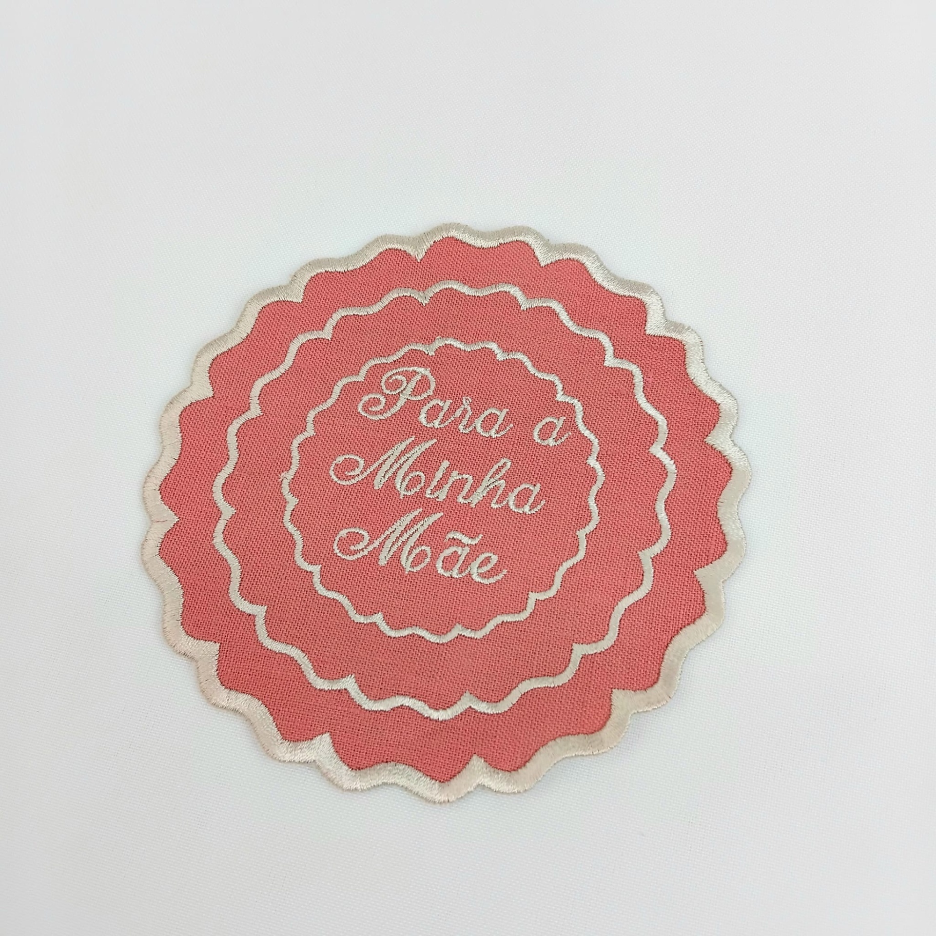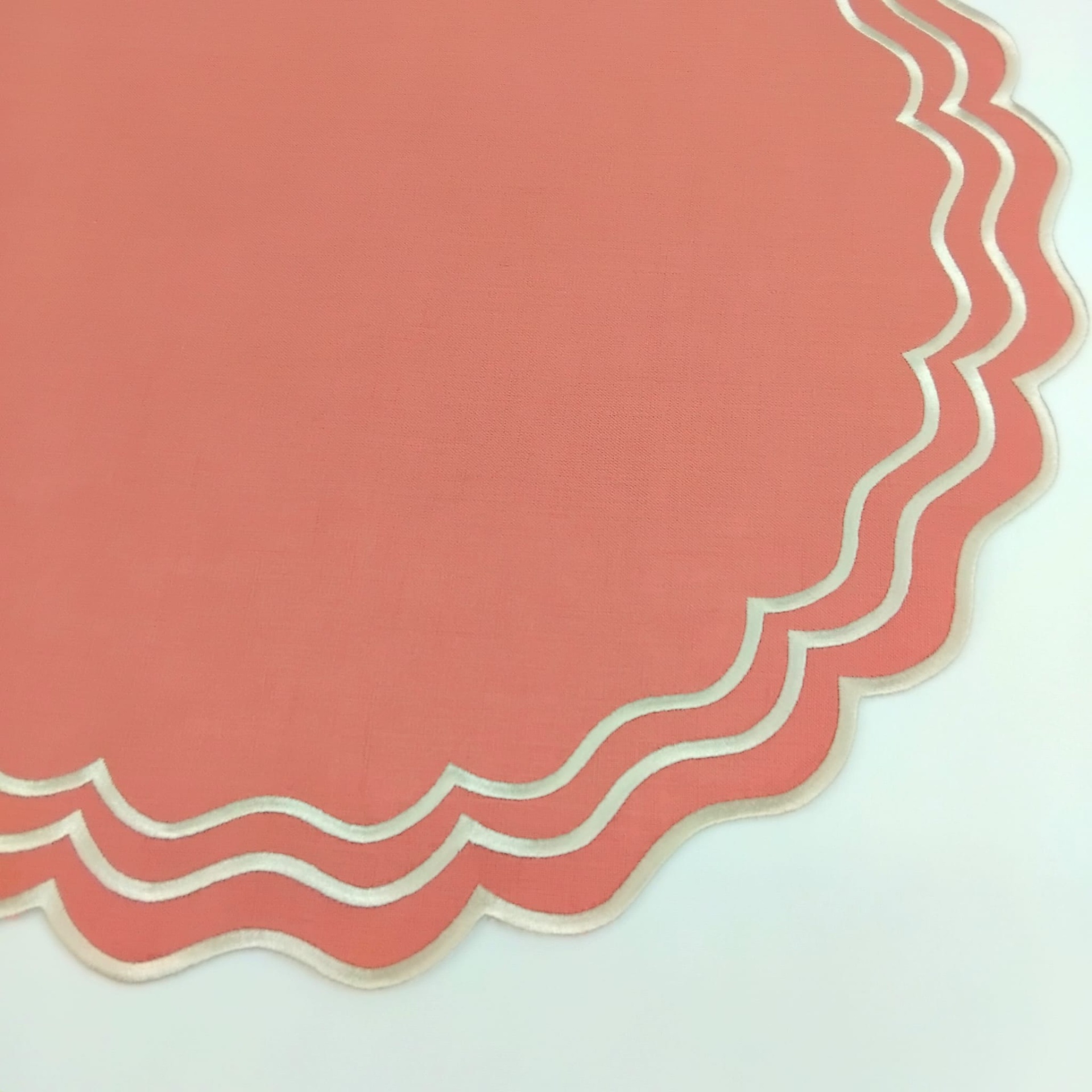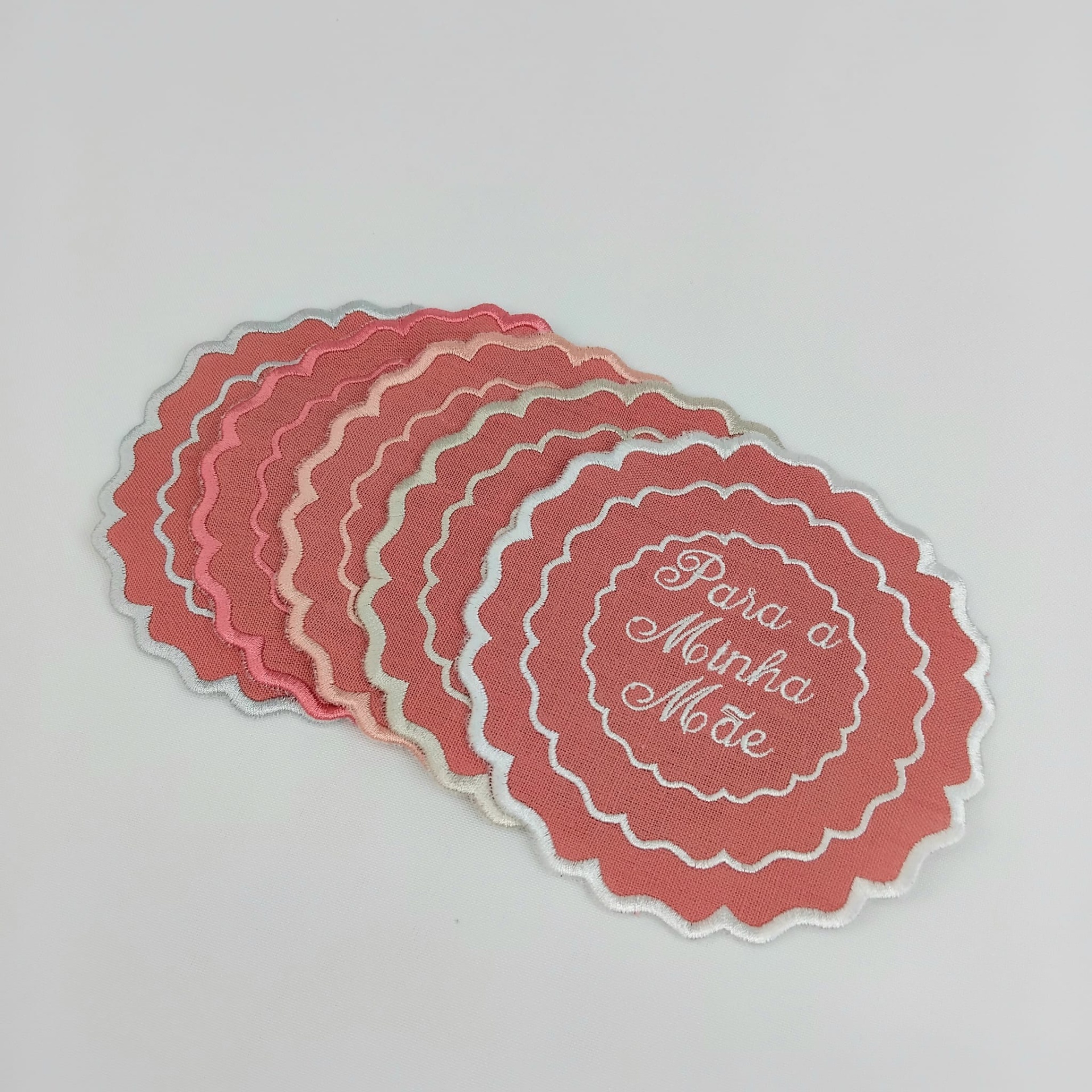 Individual, guardanapo e base de pão/copo em linho tom salmão. Guardanapo com bordado corações. Acabamento de rolinho á cor do bordado.