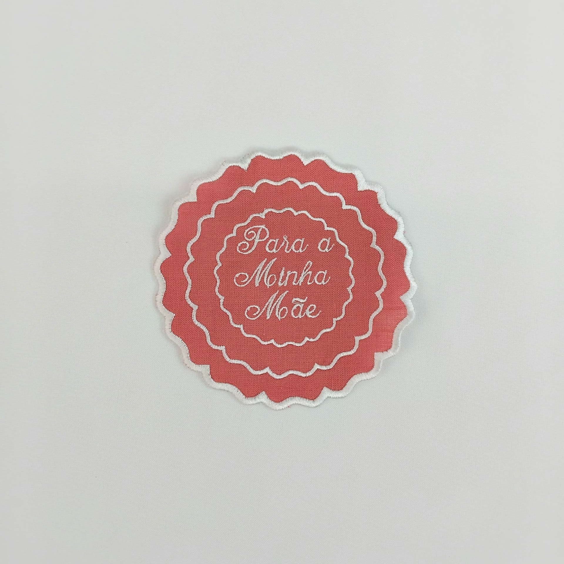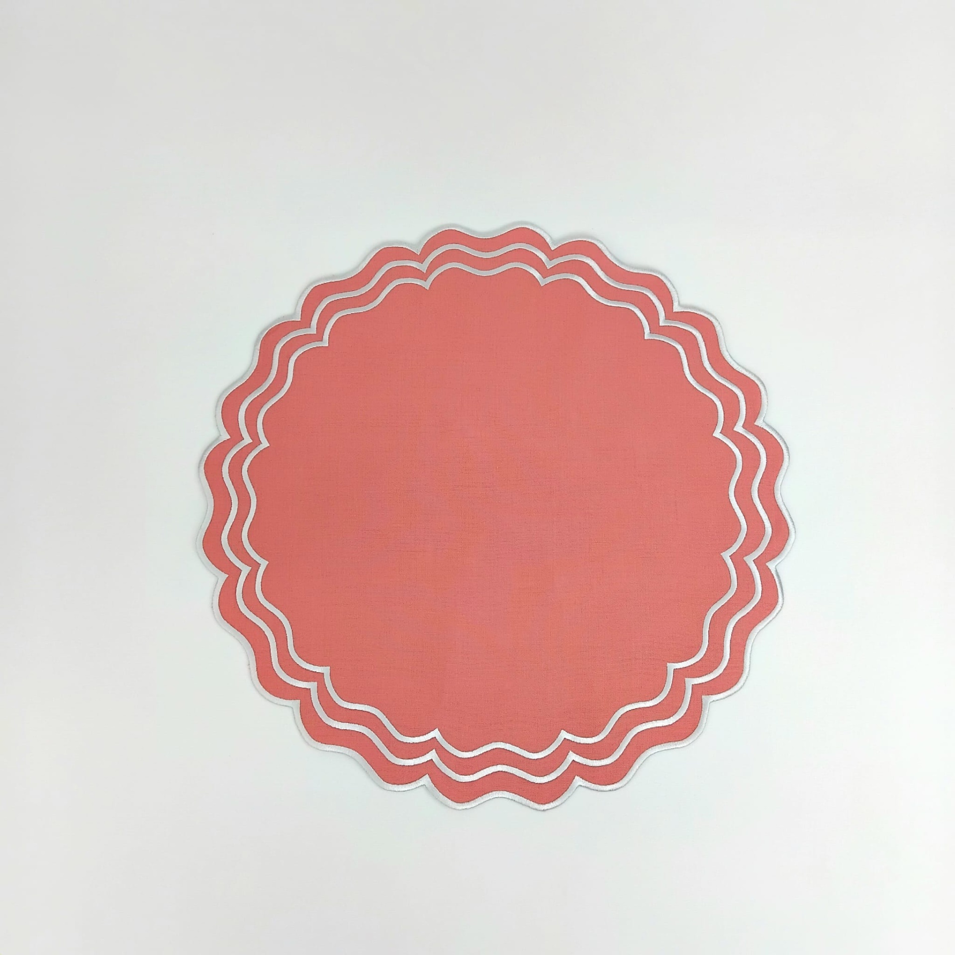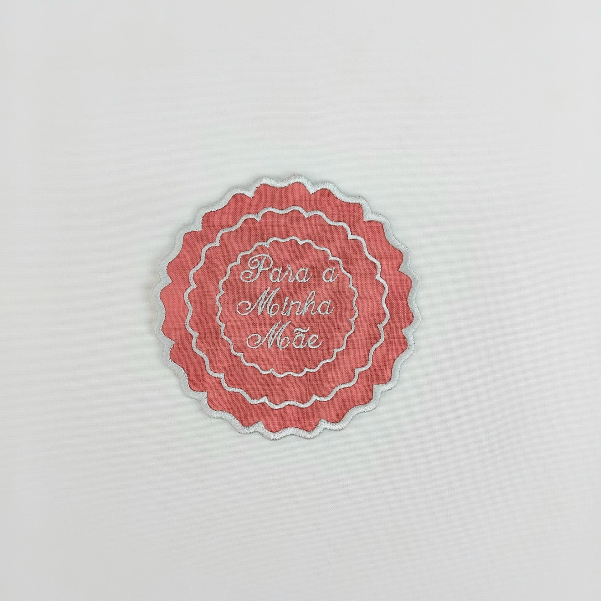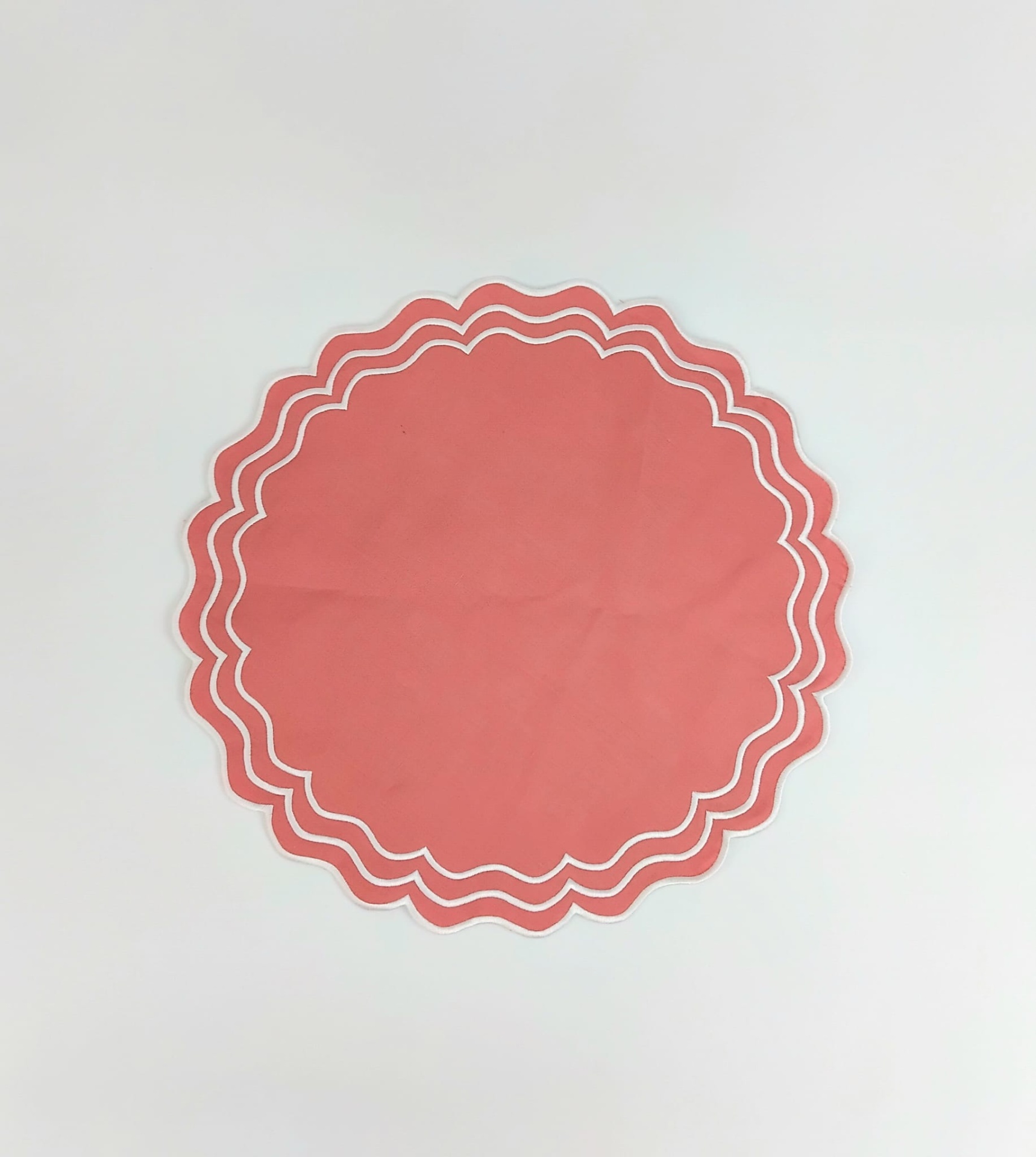 Individual, guardanapo e base de pão/copo em linho tom salmão. Guardanapo com bordado corações. Acabamento de rolinho á cor do bordado.