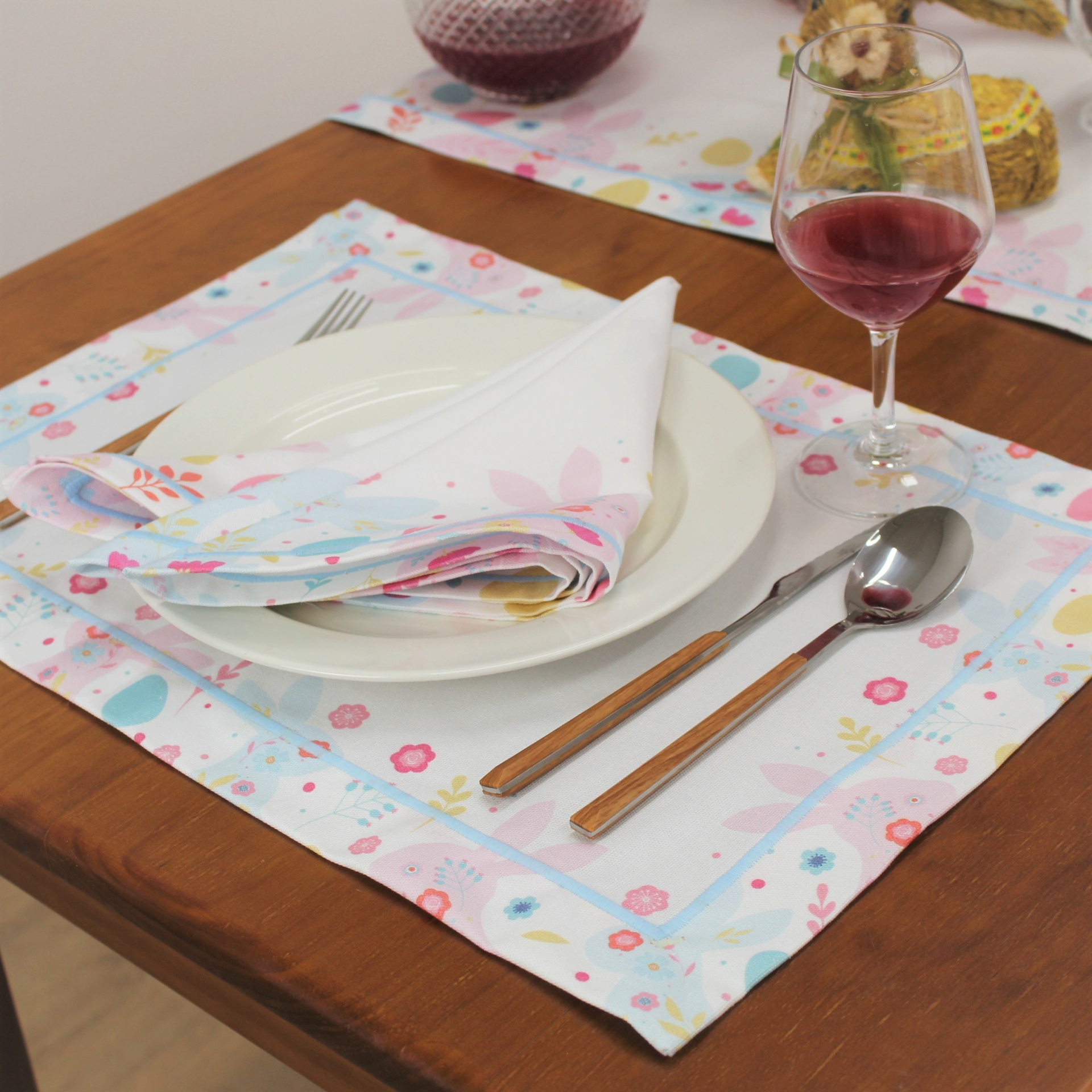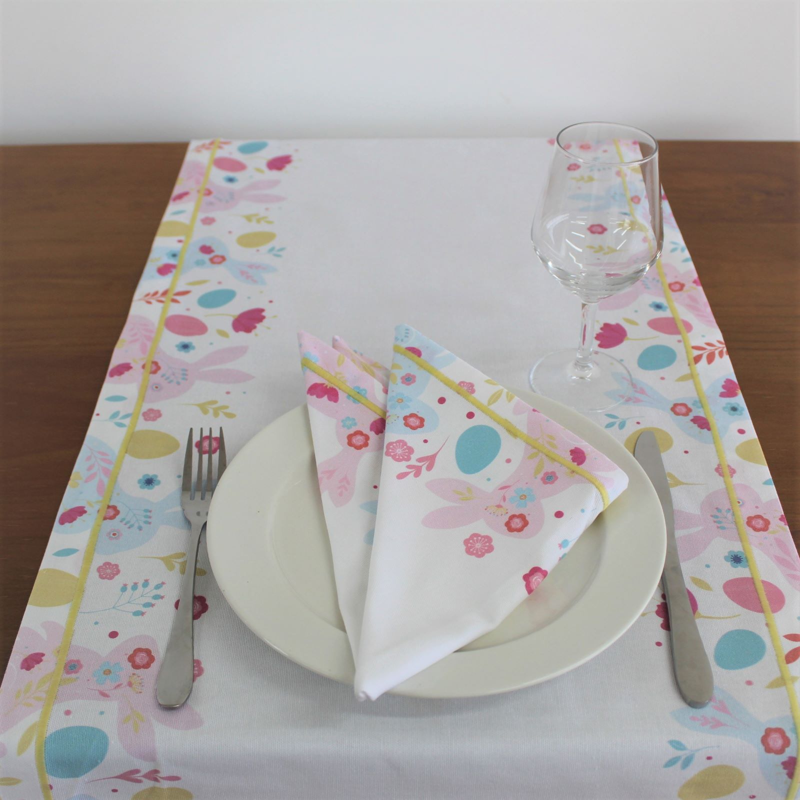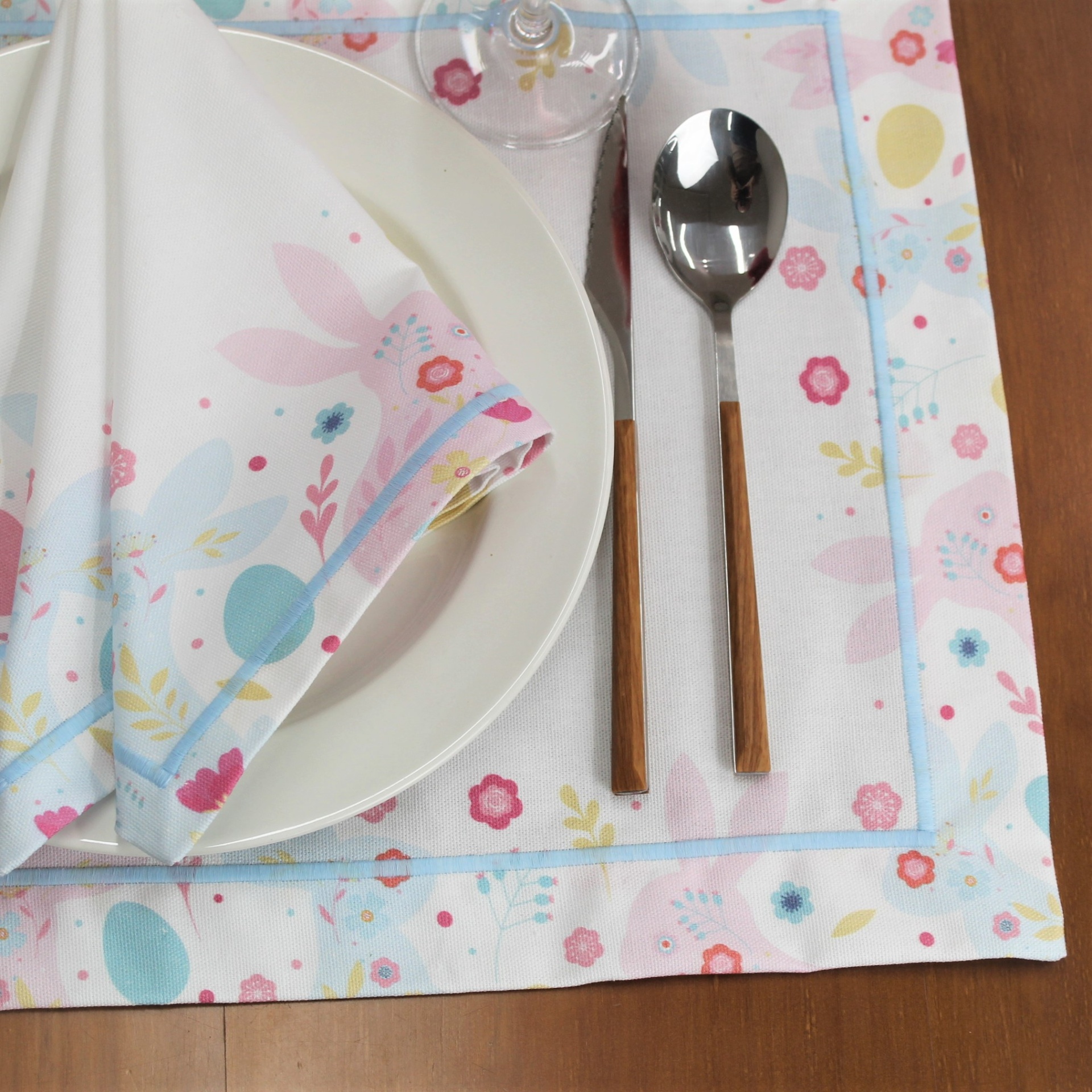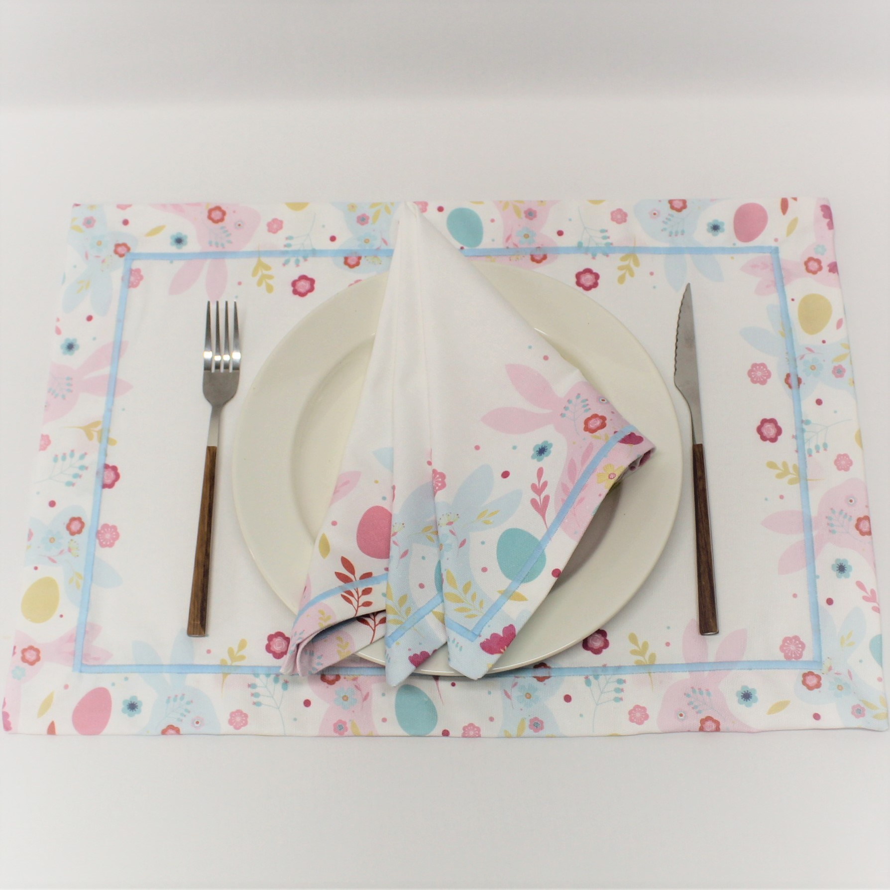 Individual de mesa, guardanapo e caminho de mesa em algodão com estampado Digital do Coelho da Páscoa e com rolinho em azul a toda a volta.