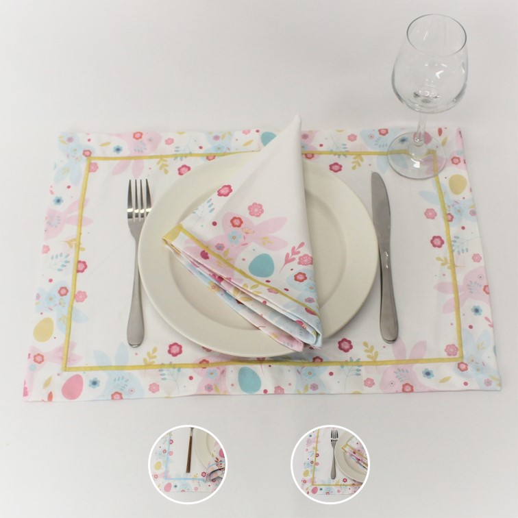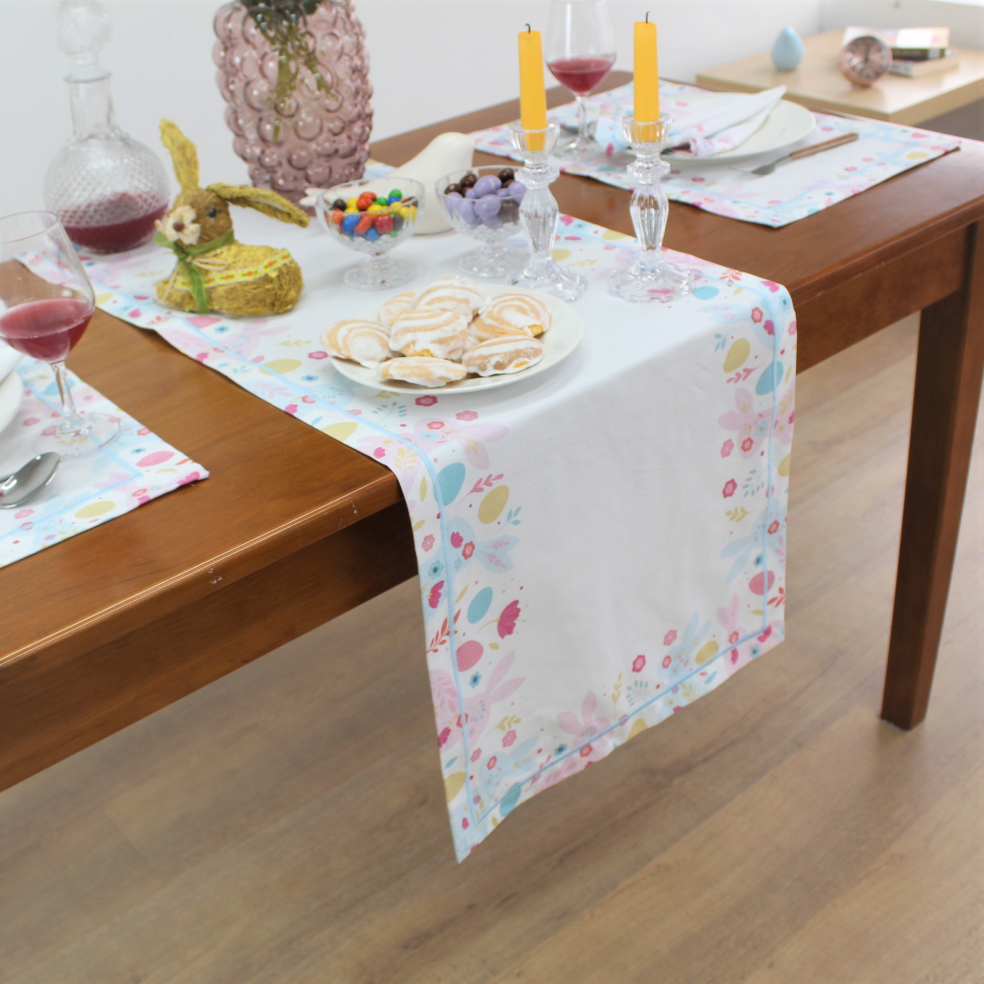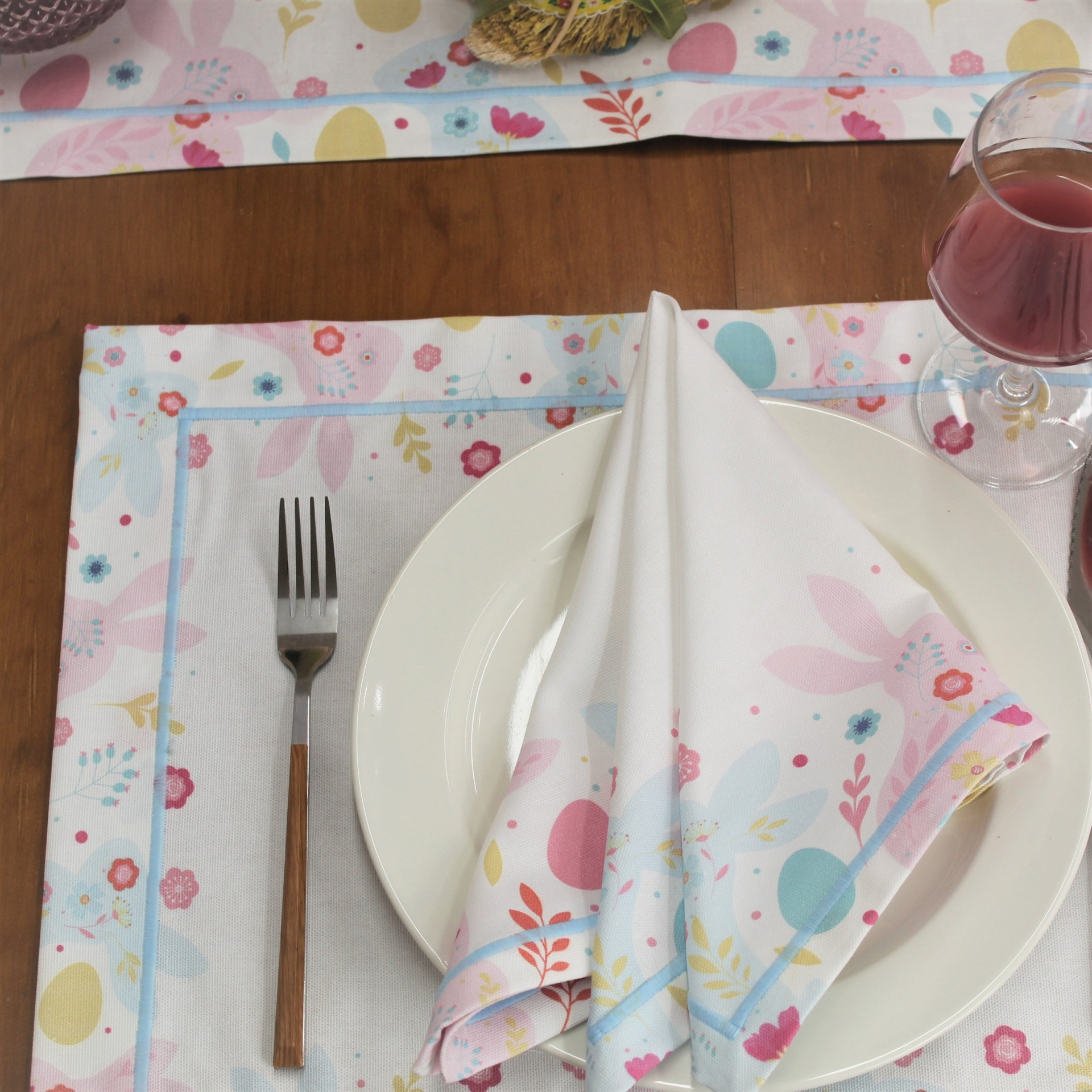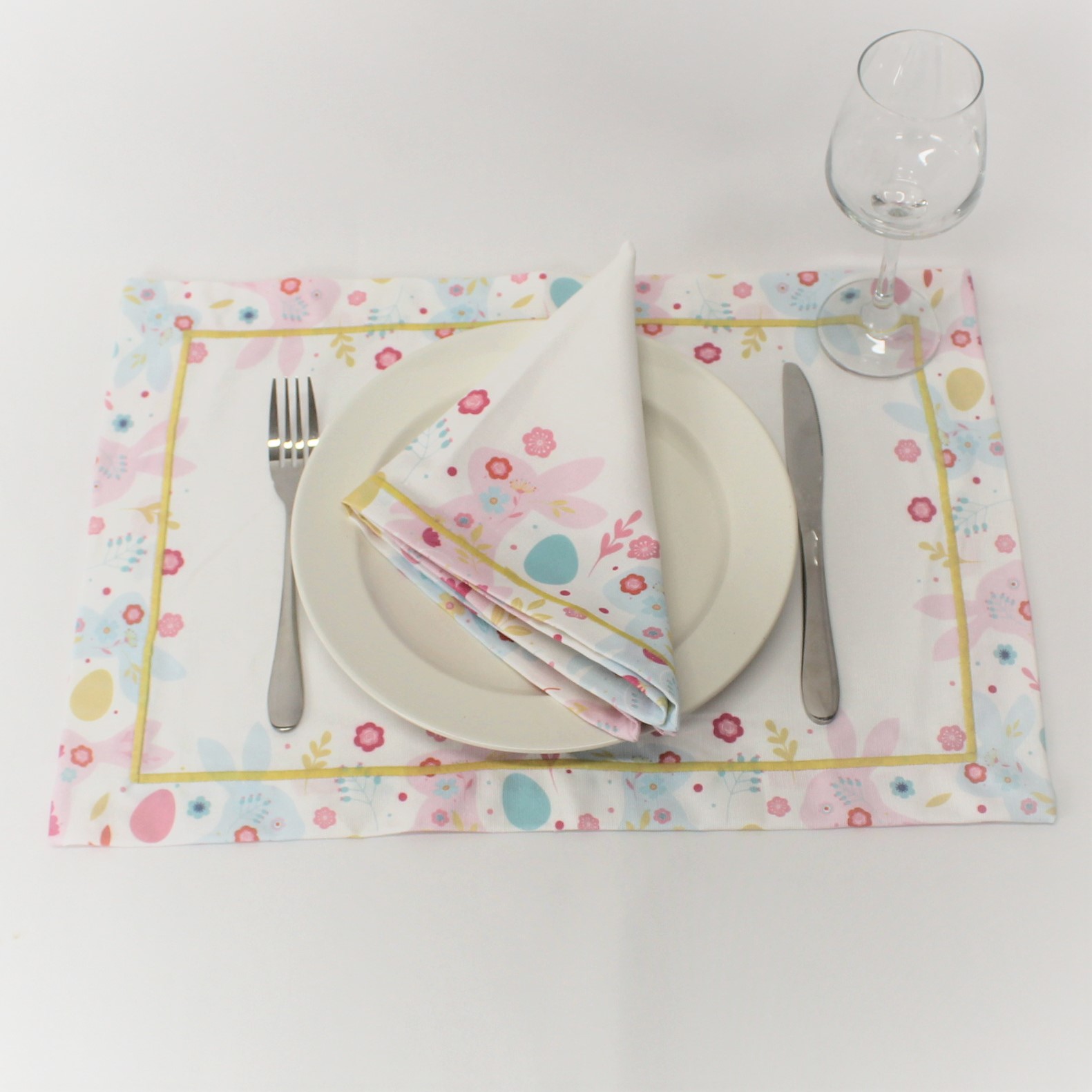 Individual de mesa, guardanapo e caminho de mesa em algodão com estampado Digital do Coelho da Páscoa e com rolinho em azul a toda a volta.