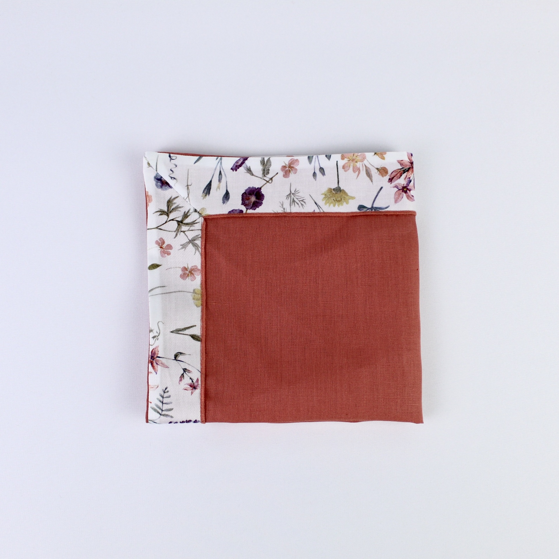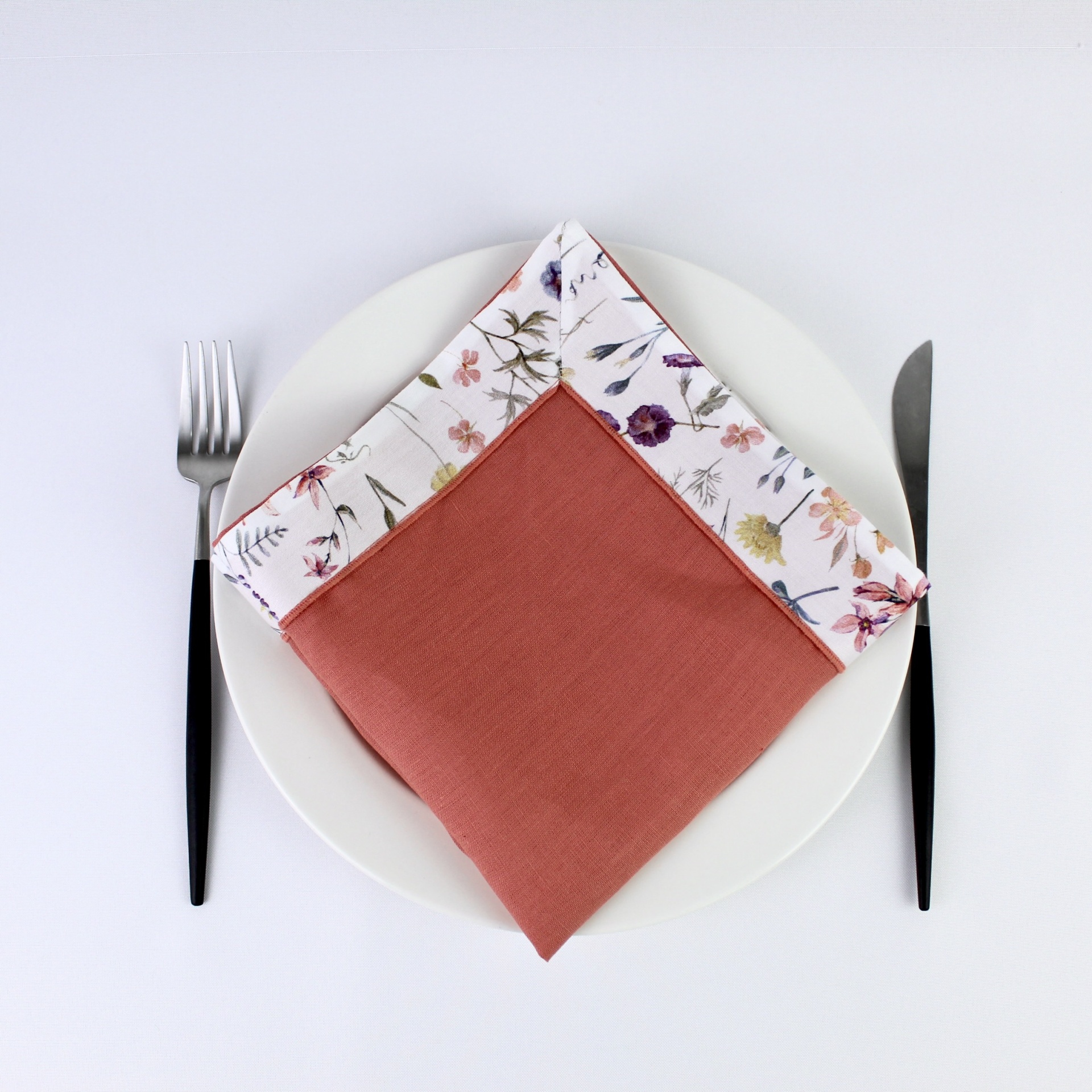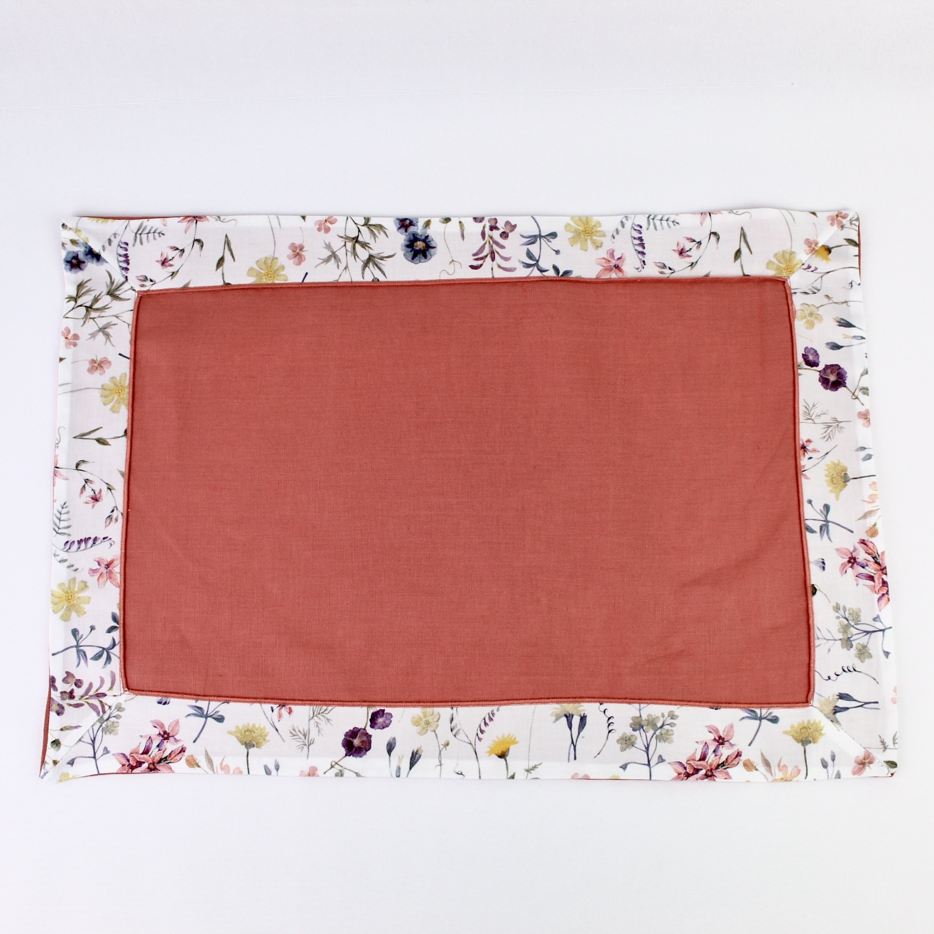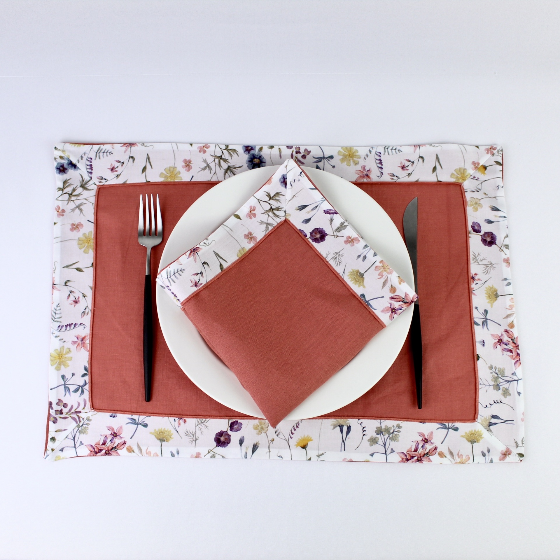 Individual e guradanapo em linho com estampado florido. Detalhe da bainha em rolinho a condizer.