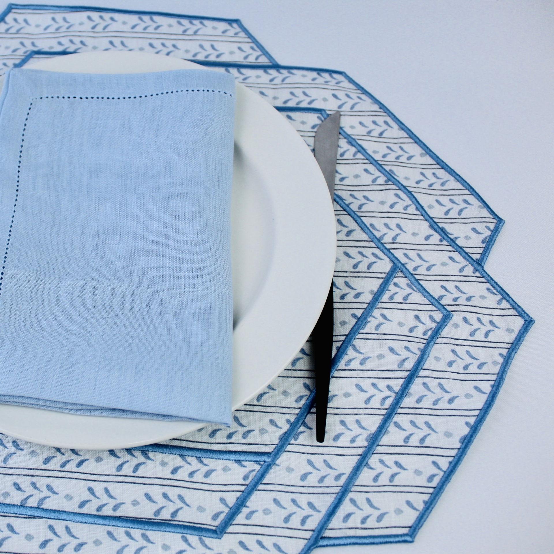 Individual em linho com estampado florido, acabamento de rolinhos azul.