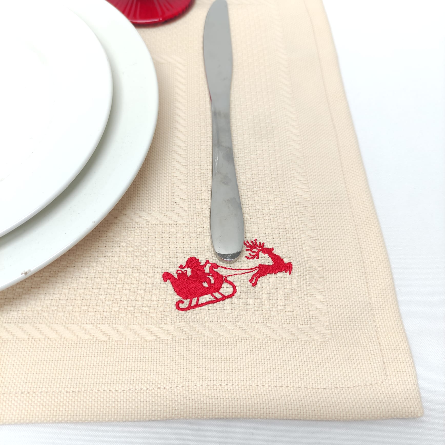 Individual em algodão de tons bege, com acabamento em bainha inglesa e bordado natalício