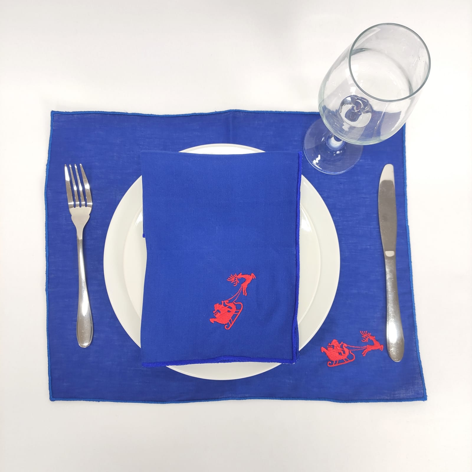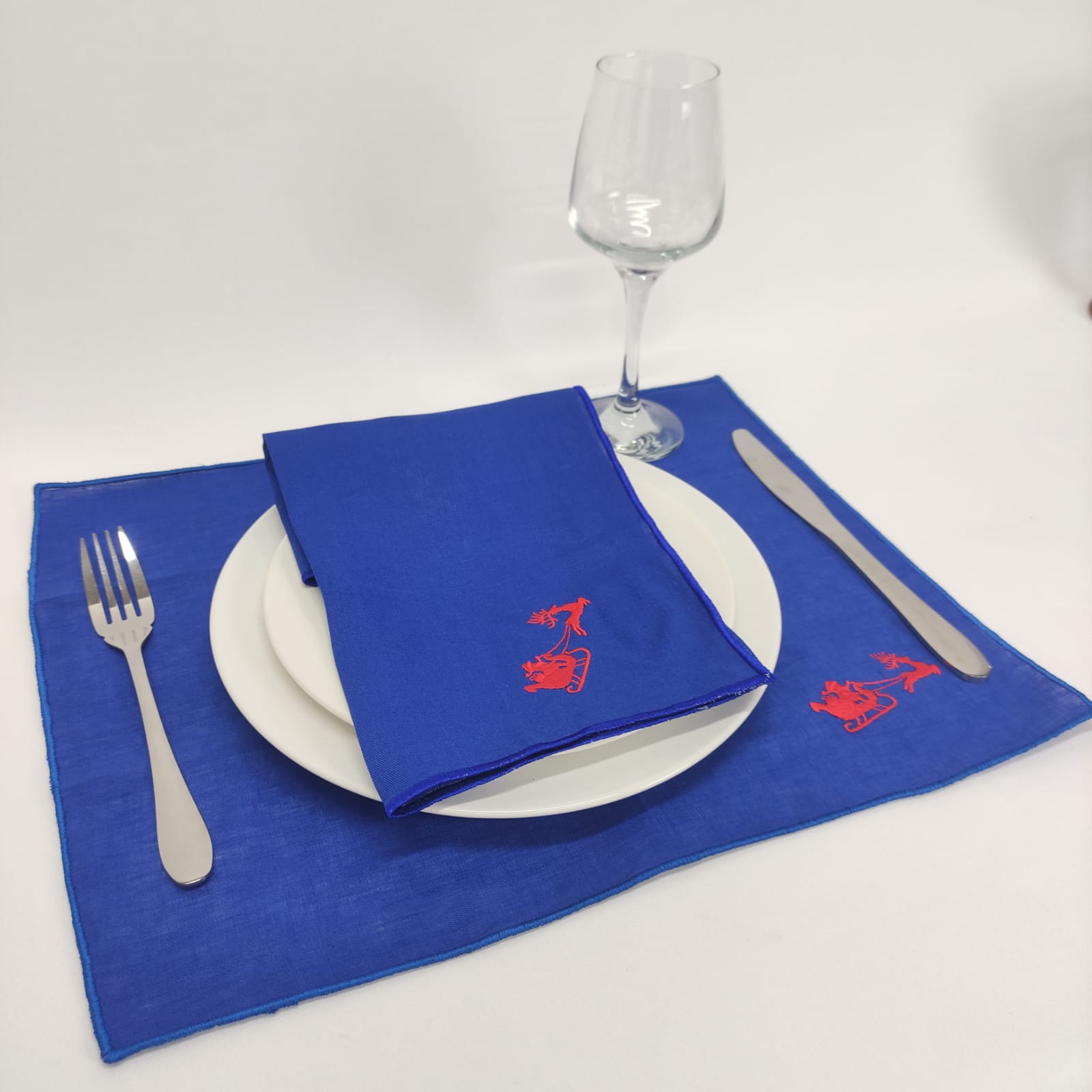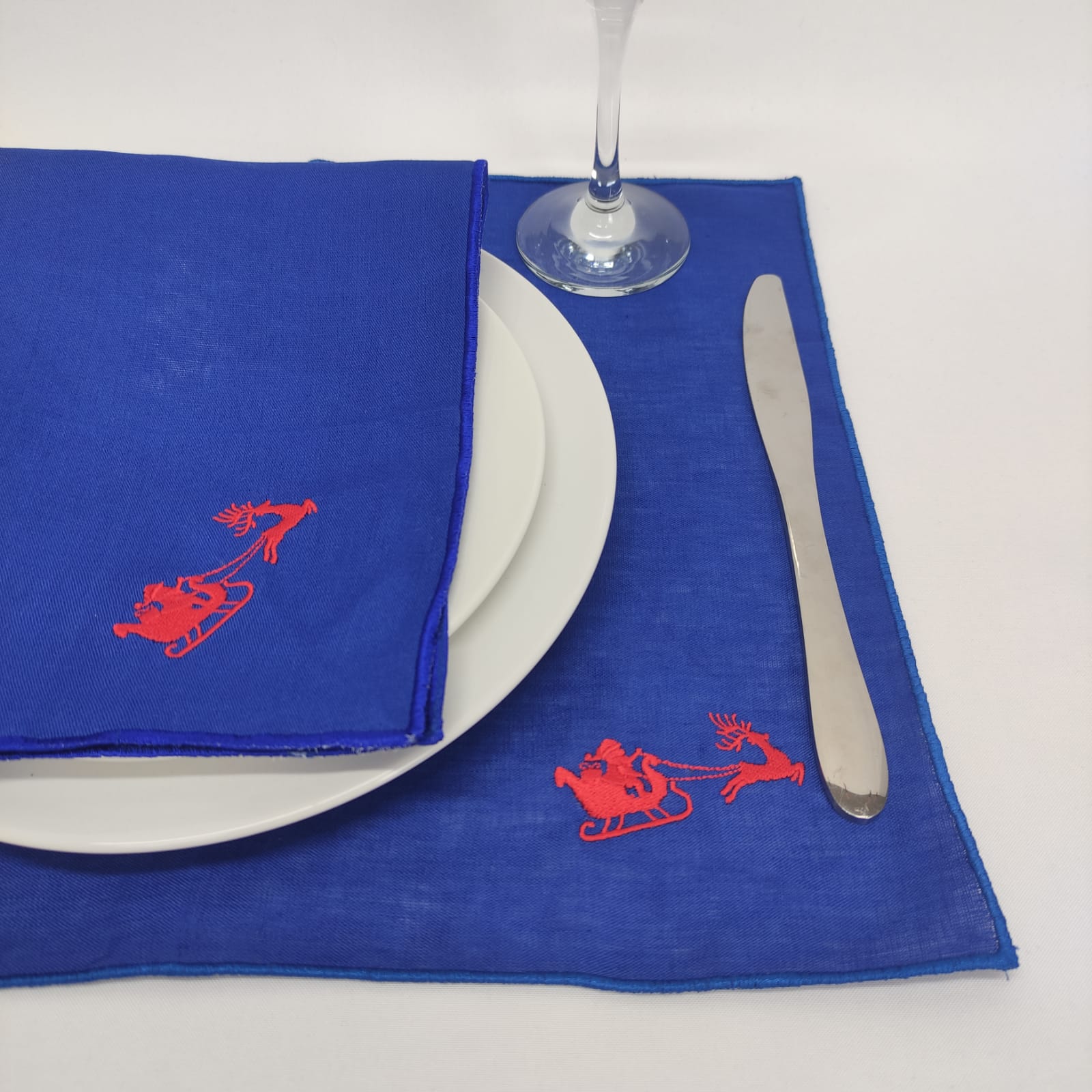Individual e guardanapo em linho azul com acabamento rolinho na mesma cor e bordado alusivo ao natal.