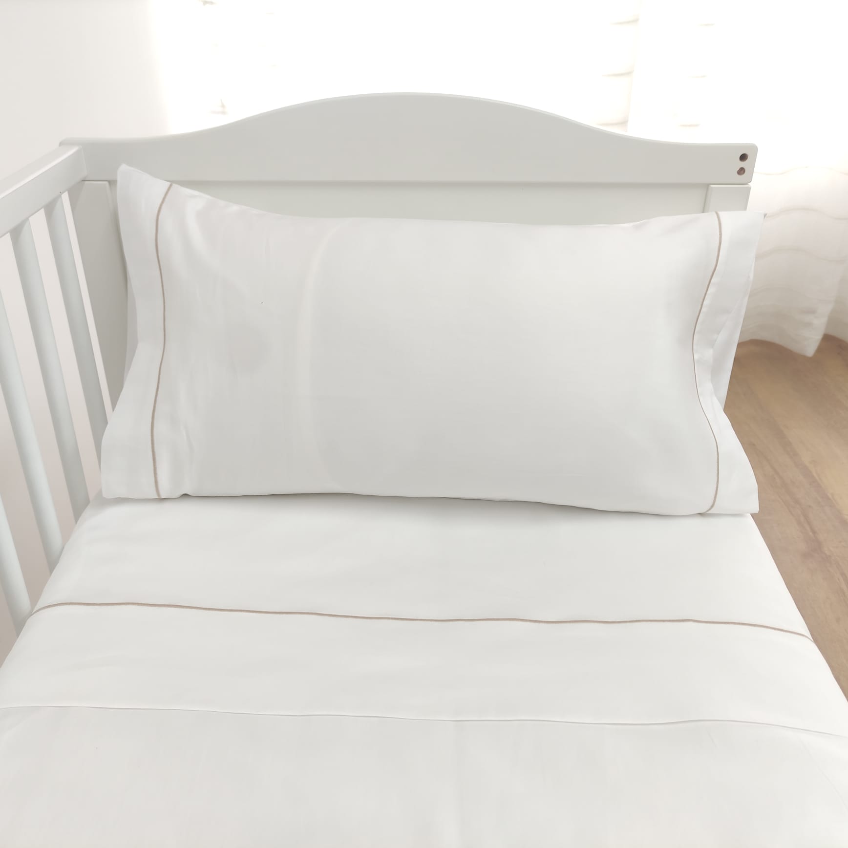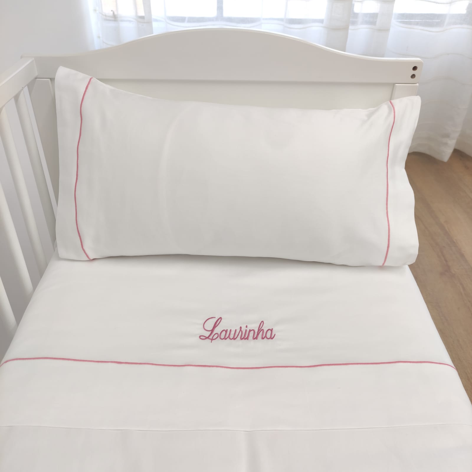 Jogo de lençóis em algodão, com pormenor de rolinho e possibilidade de personalização
