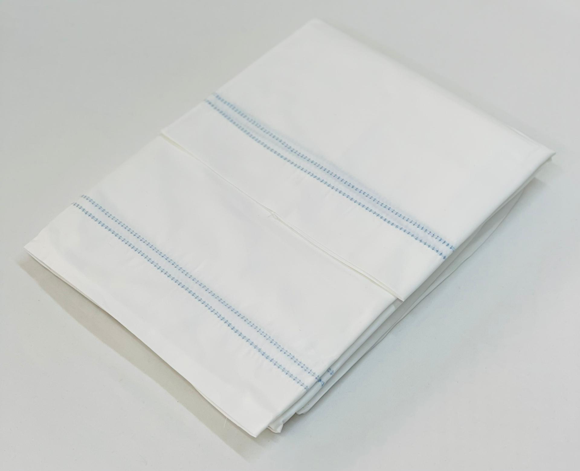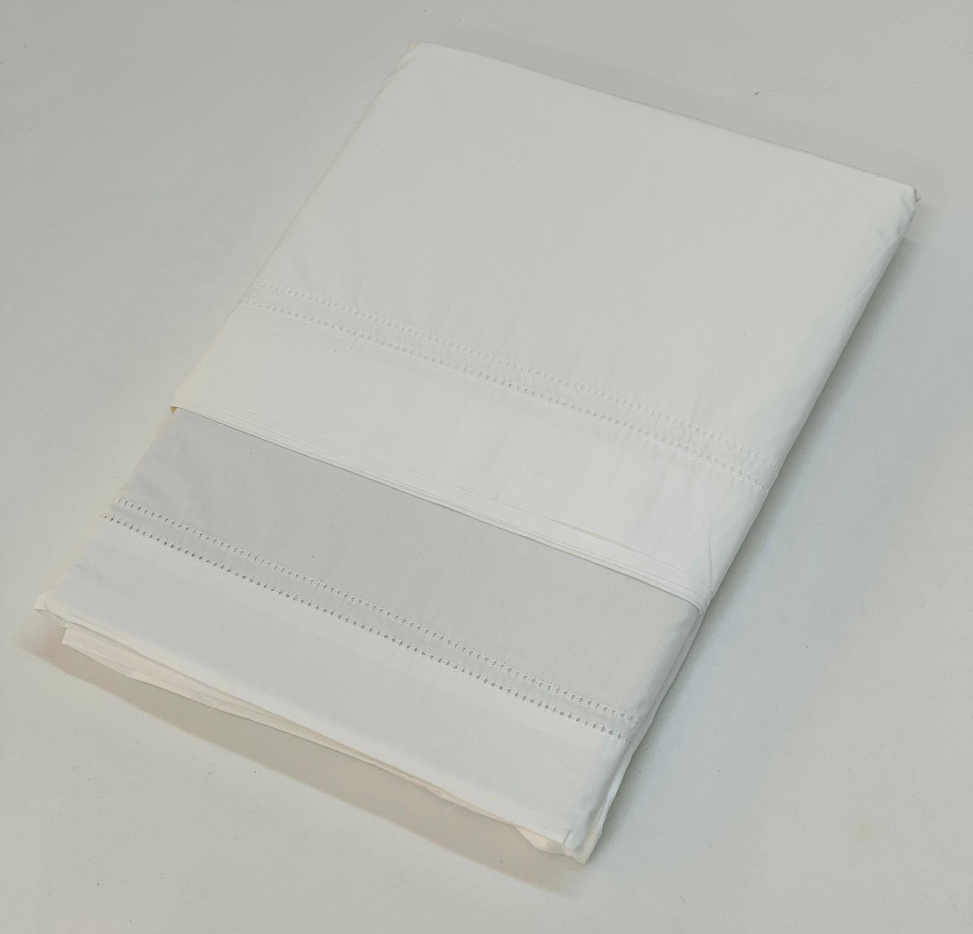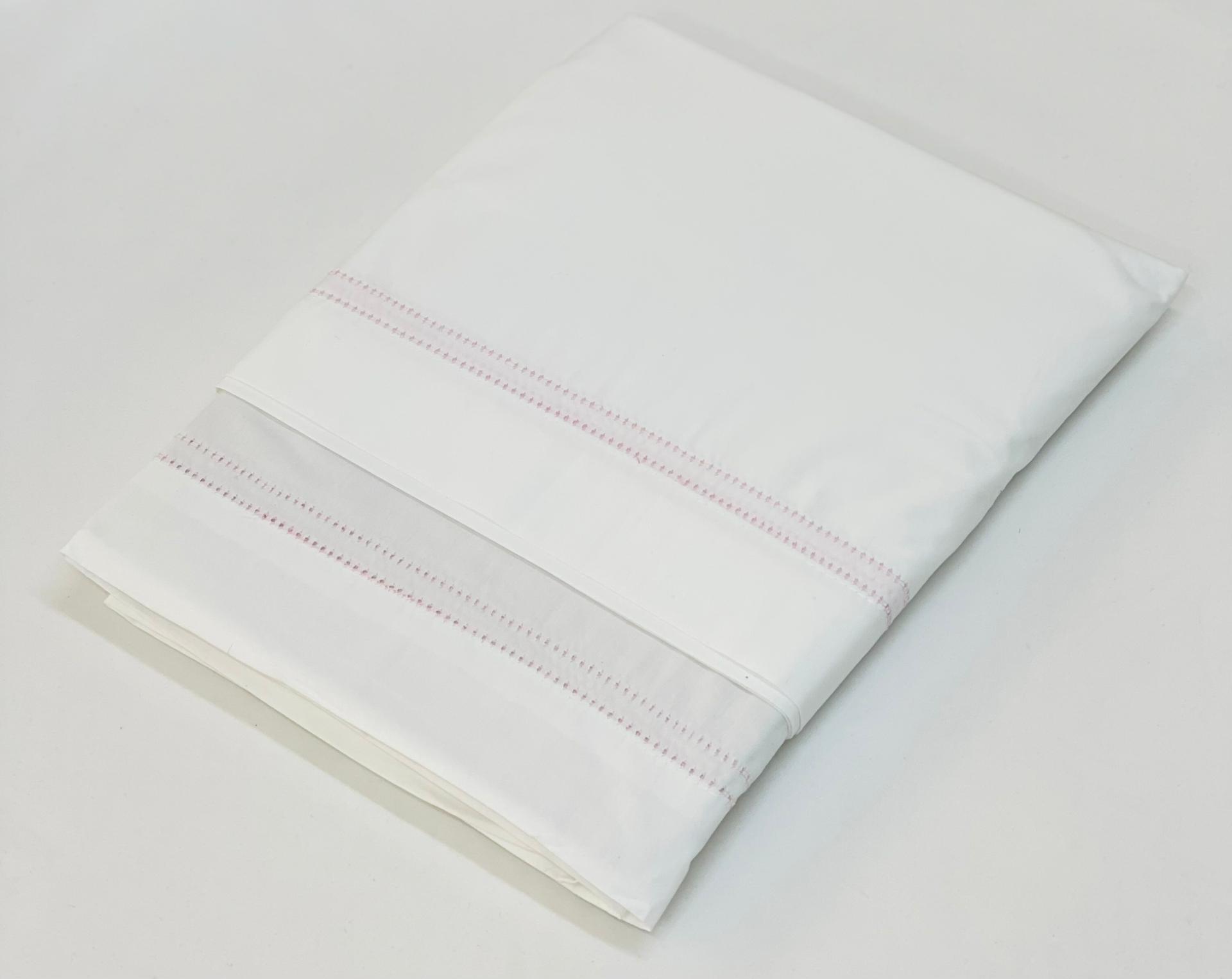 Jogo de lençóis de algodão. Modelo com lençois na cor branco com duplo ponto aberto nas cores: branco, rosa, azul, verde e bege.