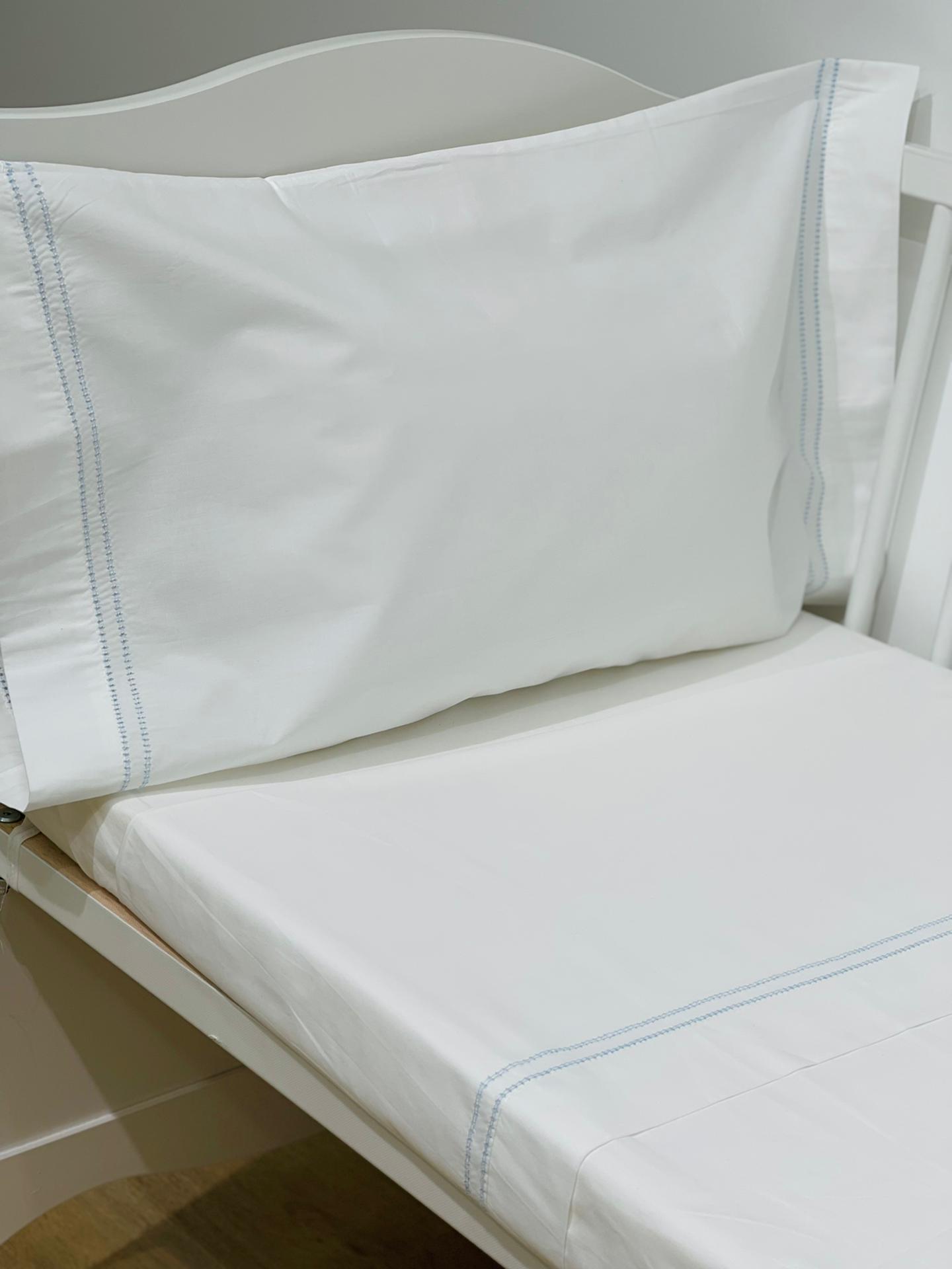 O lençol de baixo é ajustável ao colchão, com elástico a toda a volta para melhor adaptação e suporte. Lençol de cima e fronha com o duplo ponto aberto.