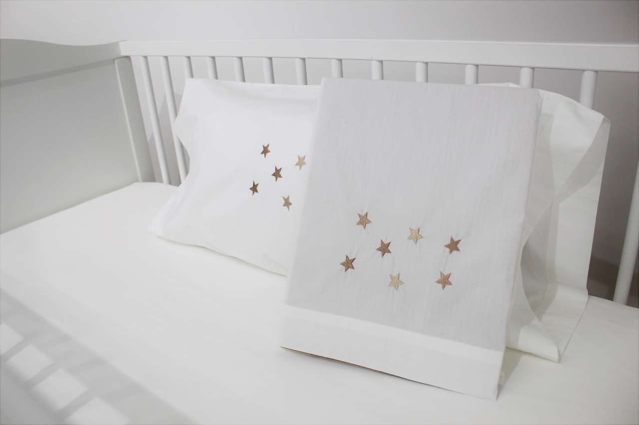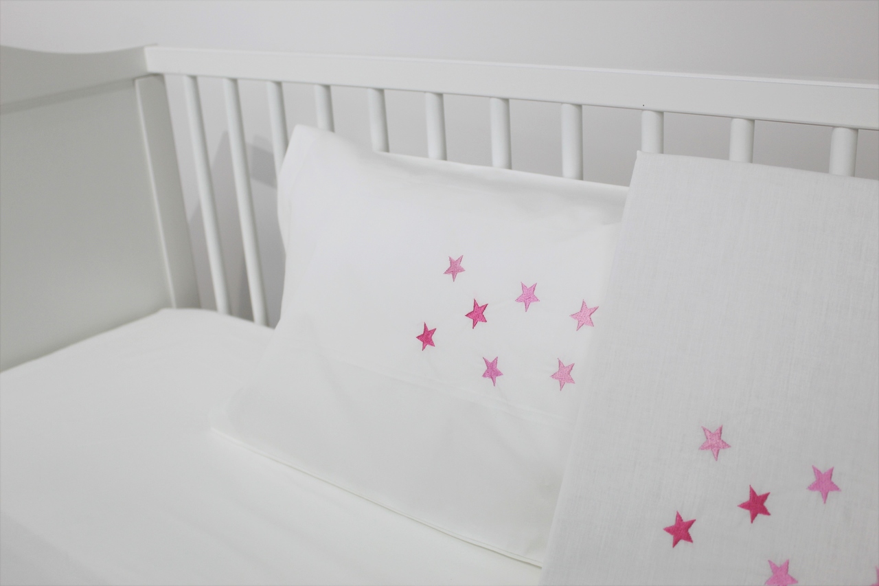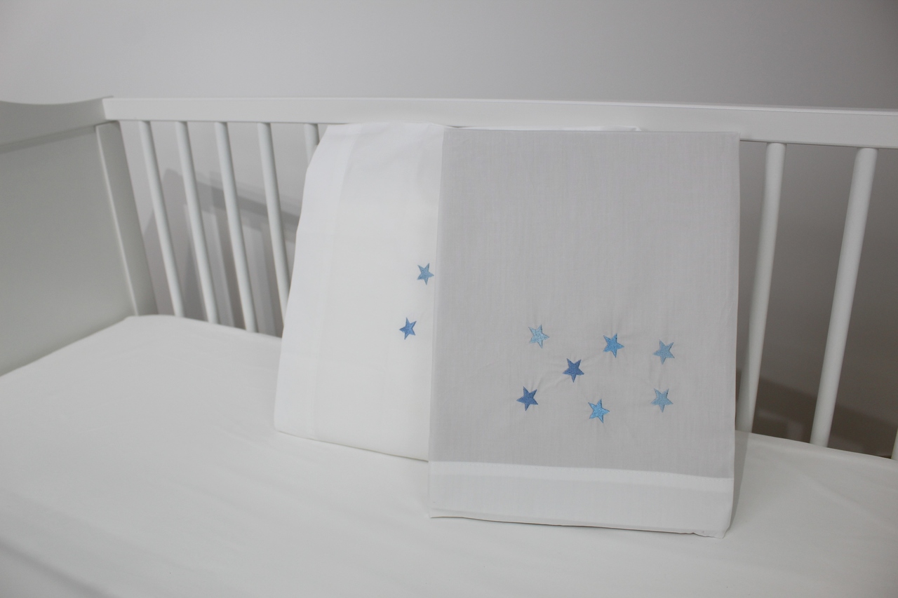 Jogo de lençóis algodão. Modelo branco com opção de bordado de estrelas azul, castanho e rosa.