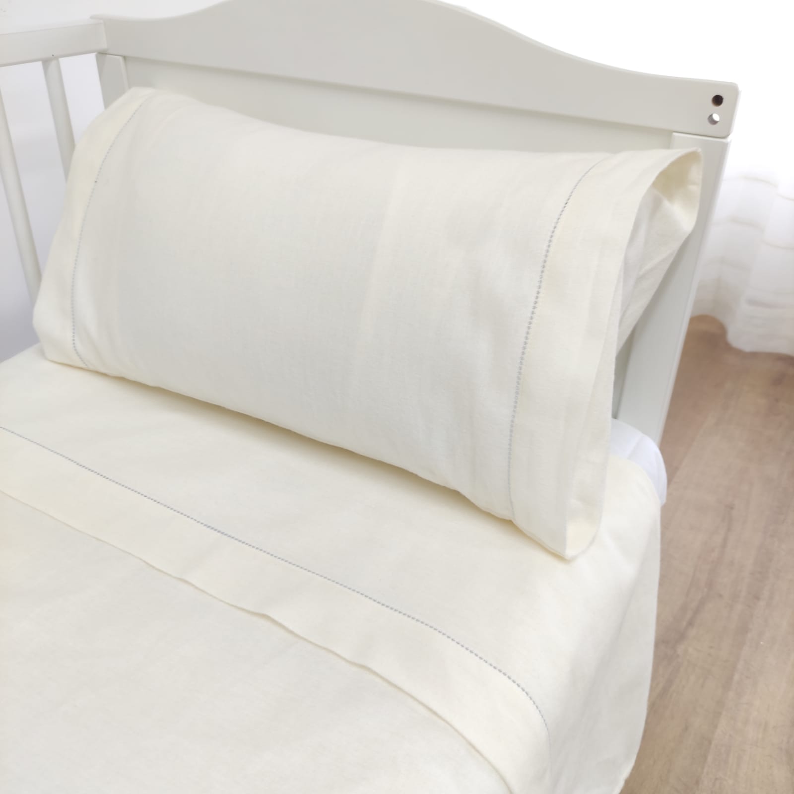 Jogo de cama em flanela pérola com pormenor de ponto aberto colorido. Disponível em azul, bege e rosa