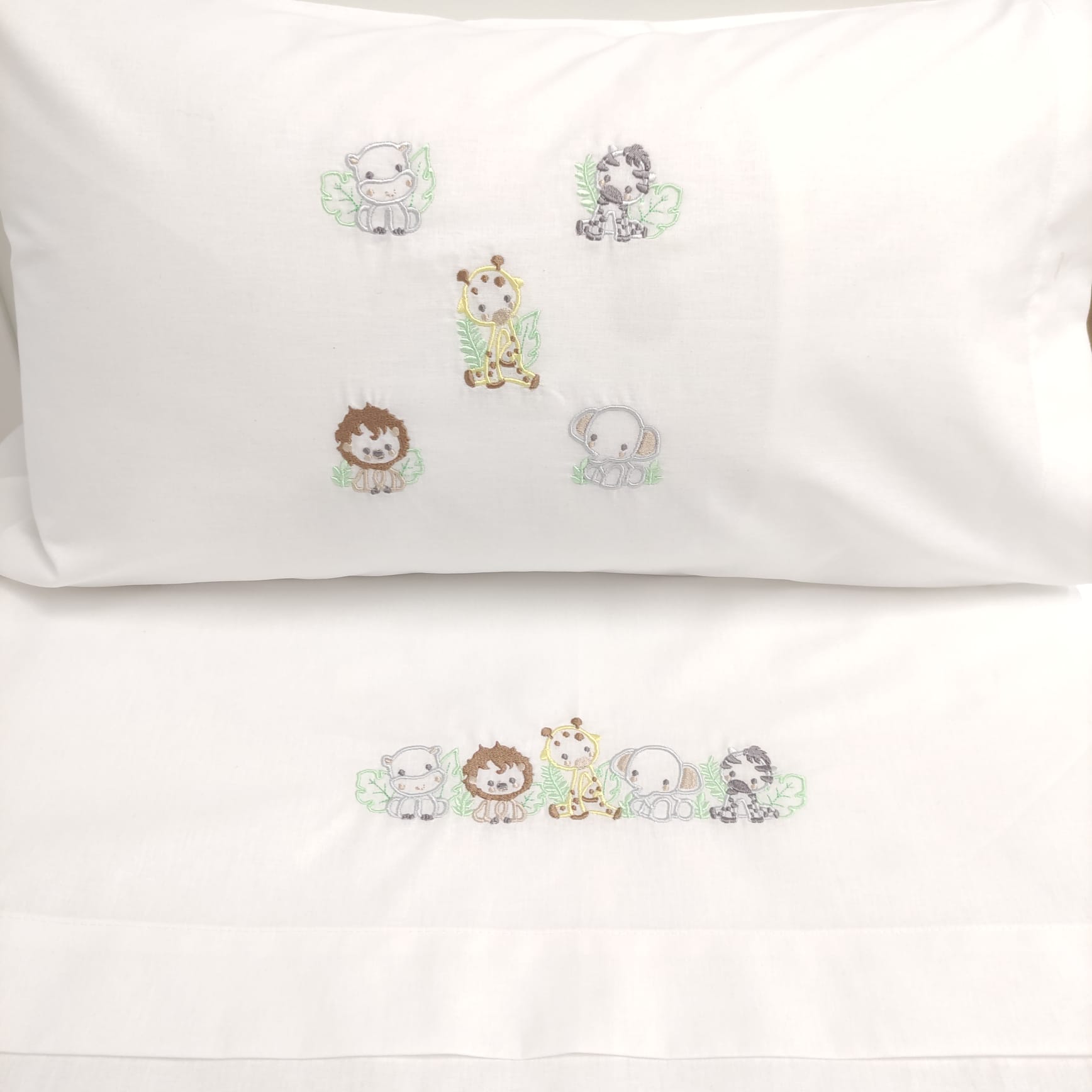 Jogo de Lençóis Bebé Selva, com bordado de animais e fabricado em material macio e confortável, para proporcionar conforto, segurança e bem-estar aos mais pequenos.