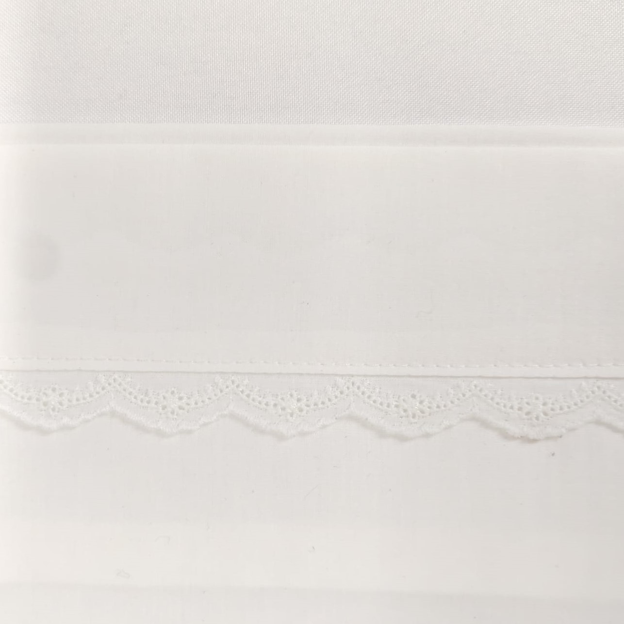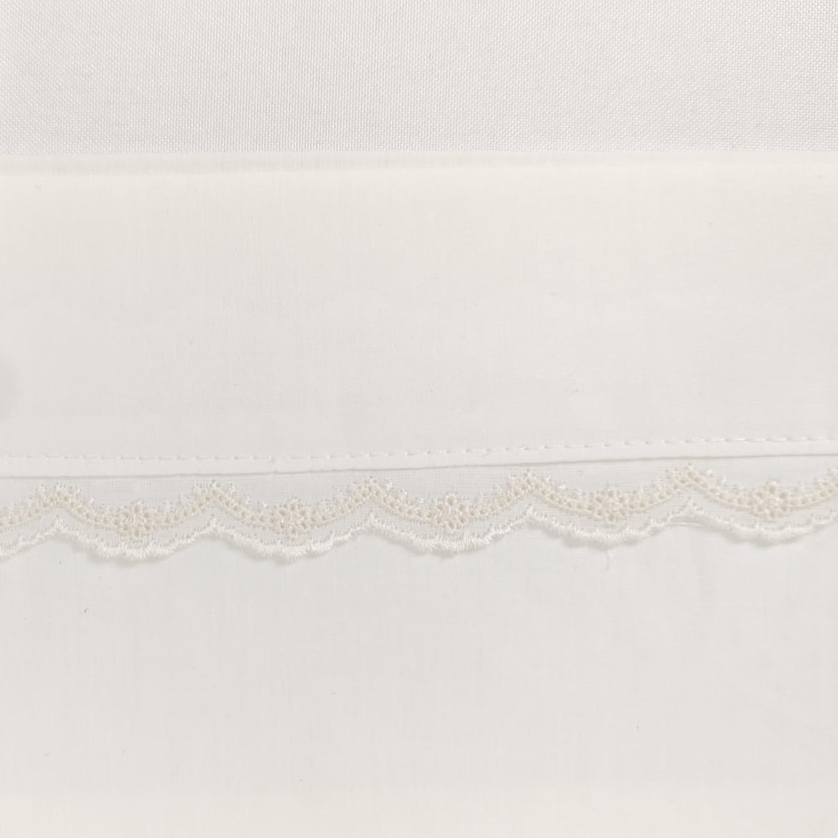Jogo de lençóis em algodão com pormenor de renda no lençol de cima e na fronha da almofada. Possui um elevado poder de conforto e durabilidade.