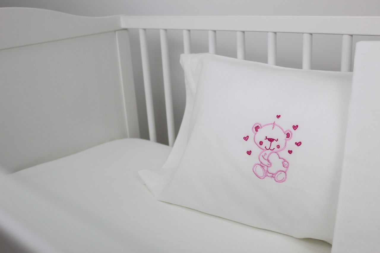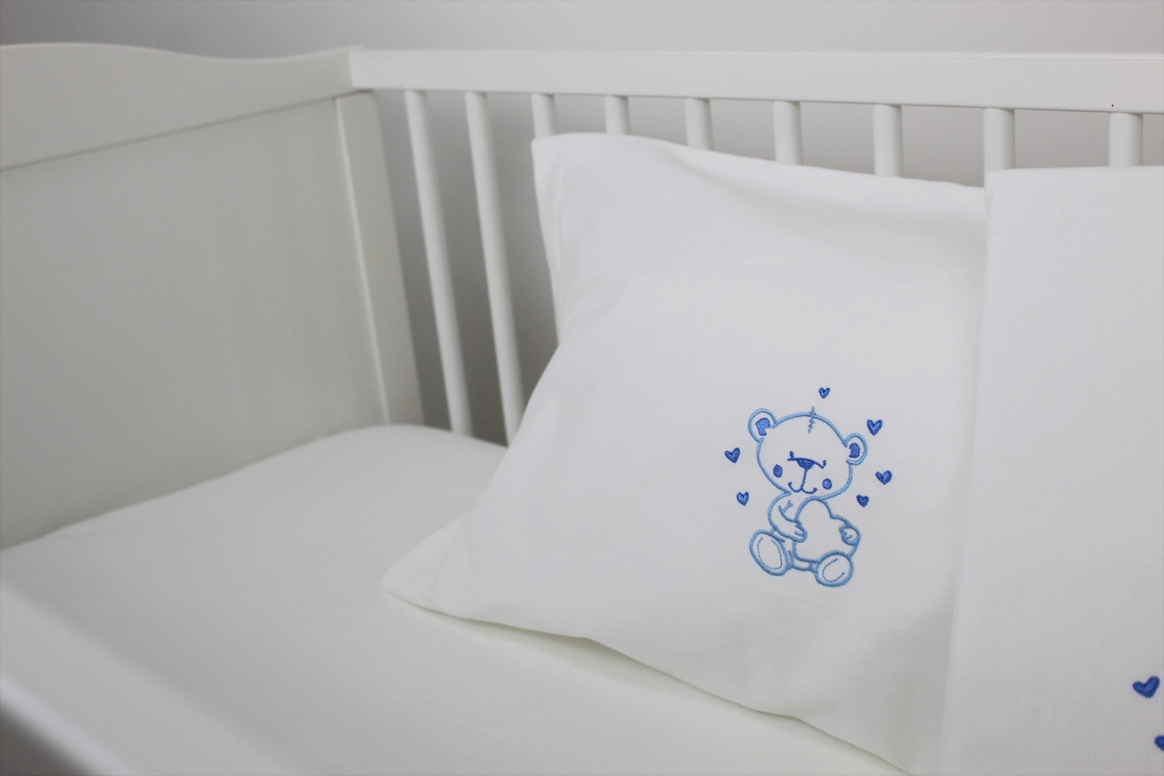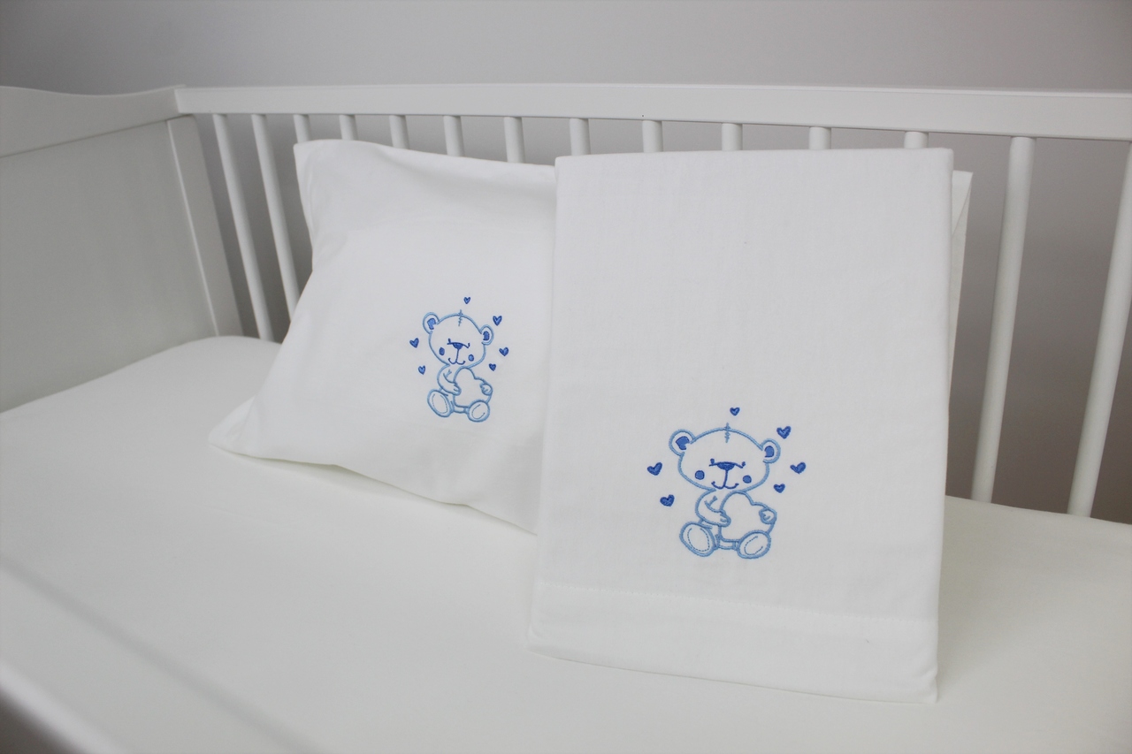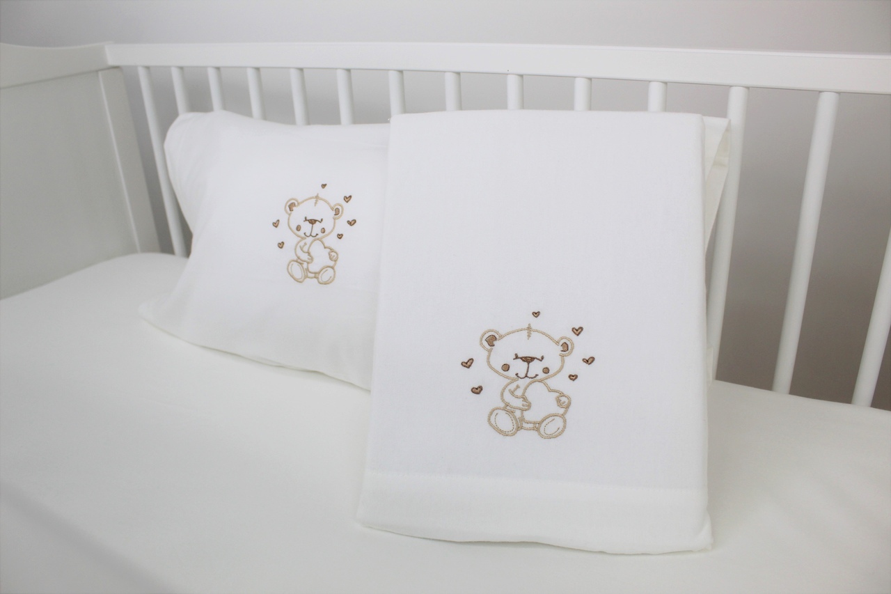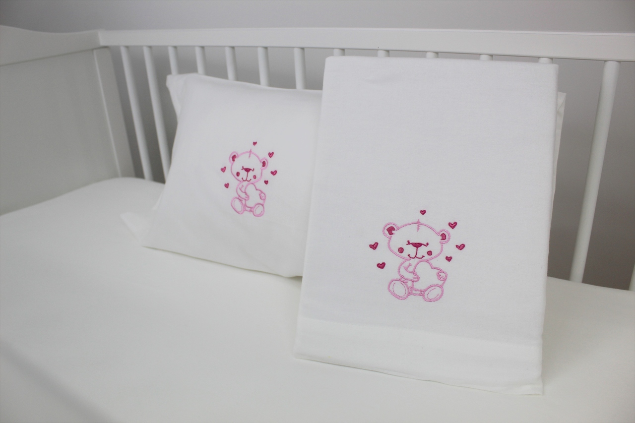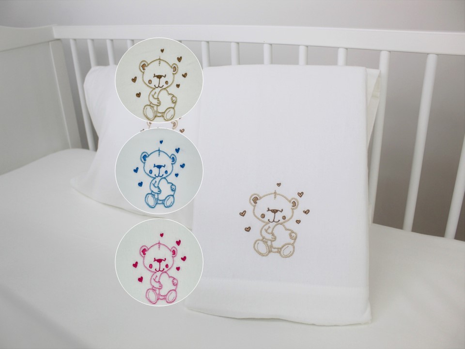 Jogo de lençóis flanela de algodão. Modelo pérola com bordado de ursinho e corações coloridos.