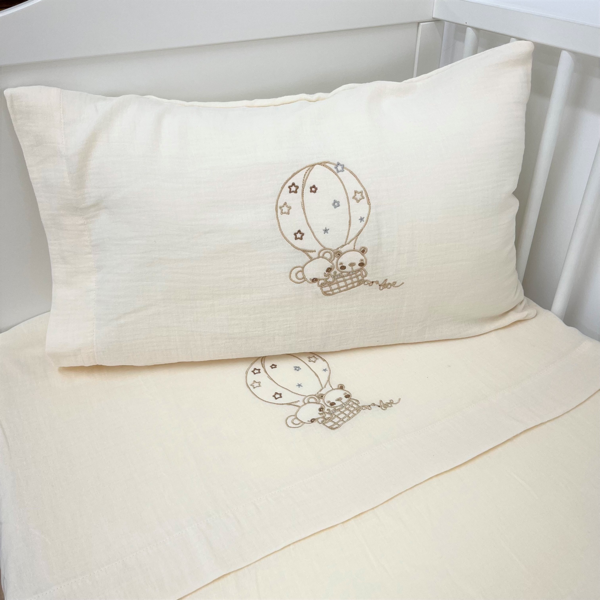 Berço (60x120cm)- 1 lençol de cima (100x170cm) + 1 lençol de baixo (60x120cm) + 1 fronha de almofada (35x55cm)