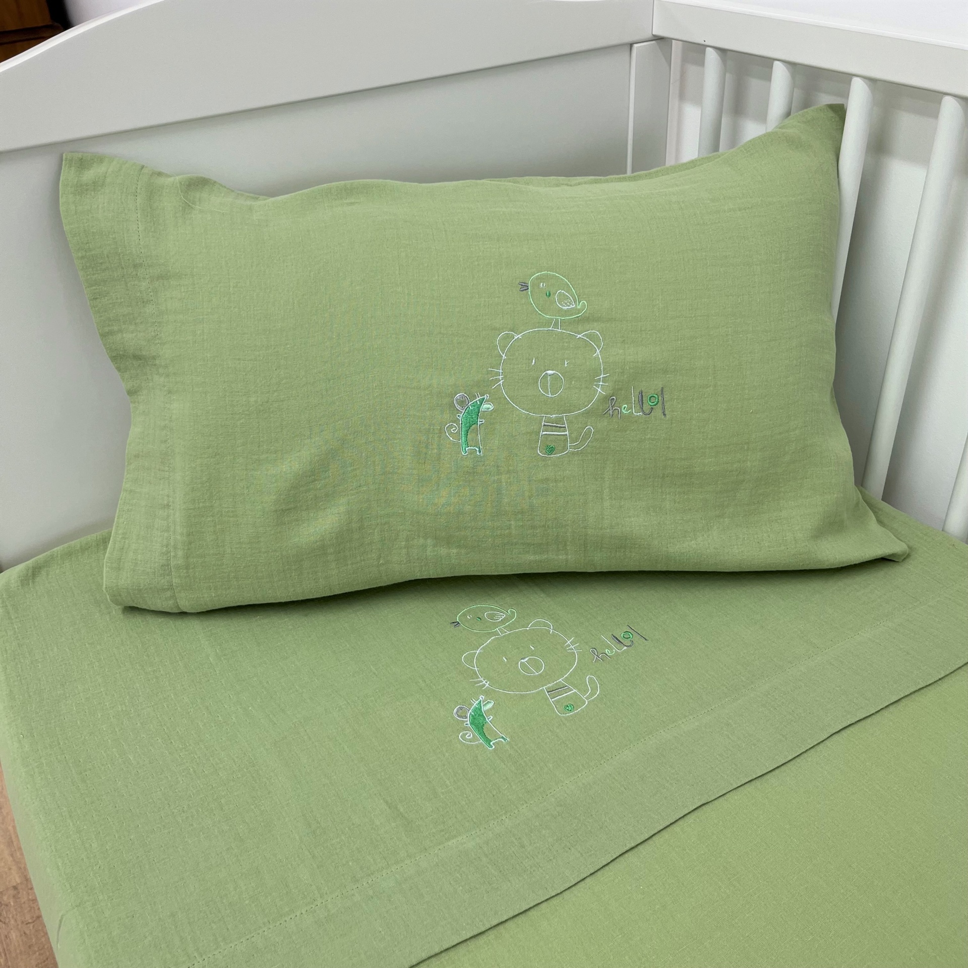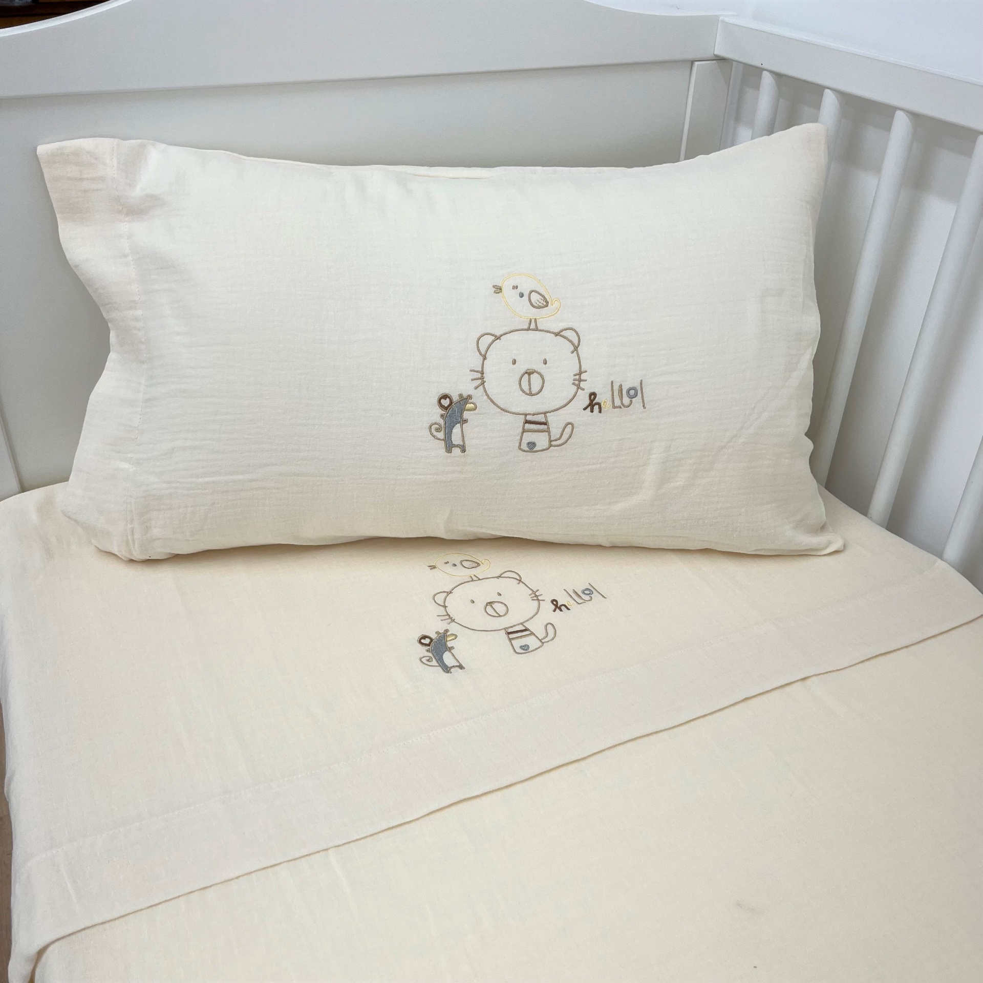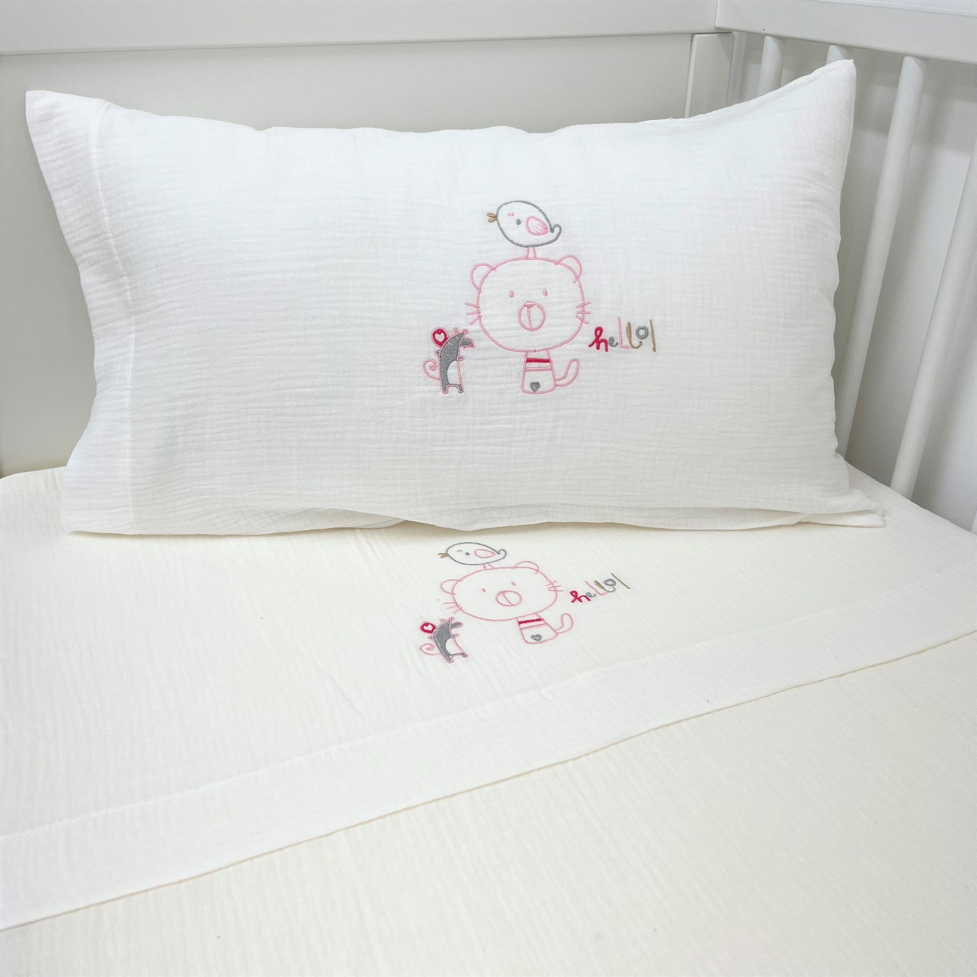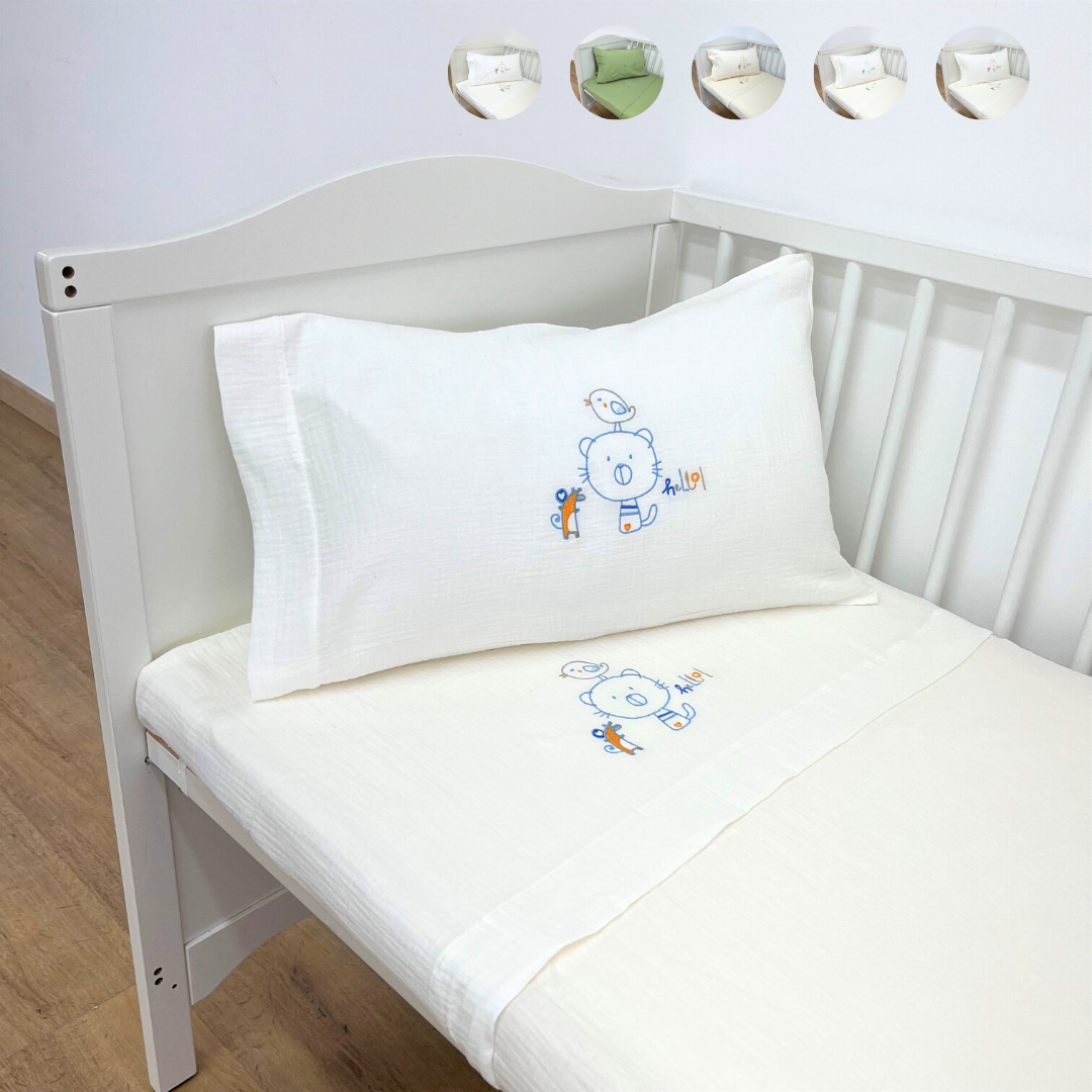 Berço (60x120cm)- 1 lençol de cima (100x170cm) + 1 lençol de baixo (60x120cm) + 1 fronha de almofada (35x55cm)
