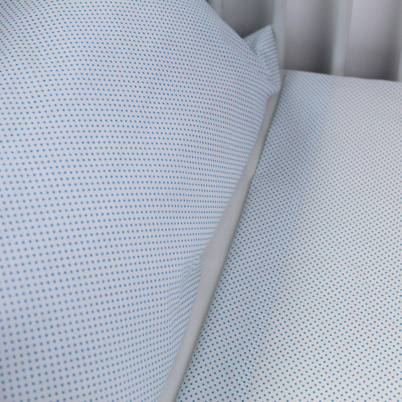 Jogo de Cama em algodão estampado de pintinhas azuis, jogo ultrasuave é apresentado em uma linda caixa decorativa com frente transparente para que se possa ver em detalhado o conjunto.