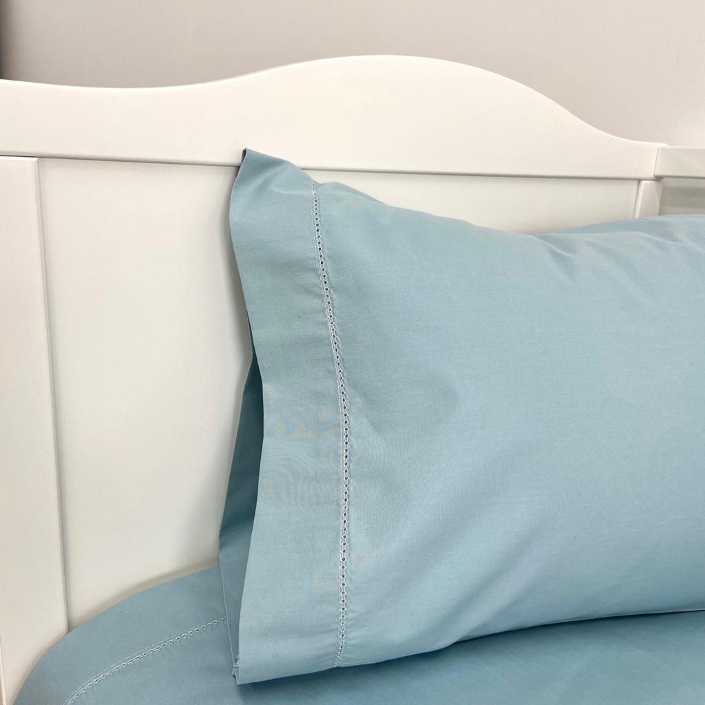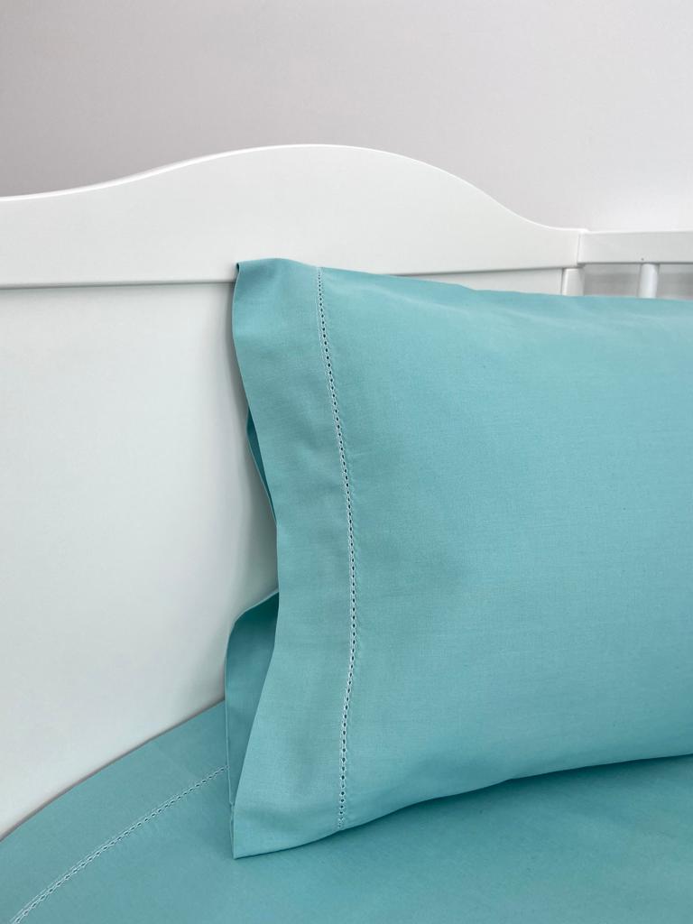 Jogo de lençóis 100% algodão. Modelo em várias cores, com detalhe de 1 ponto aberto no lençol de cima e fronha de almofada.