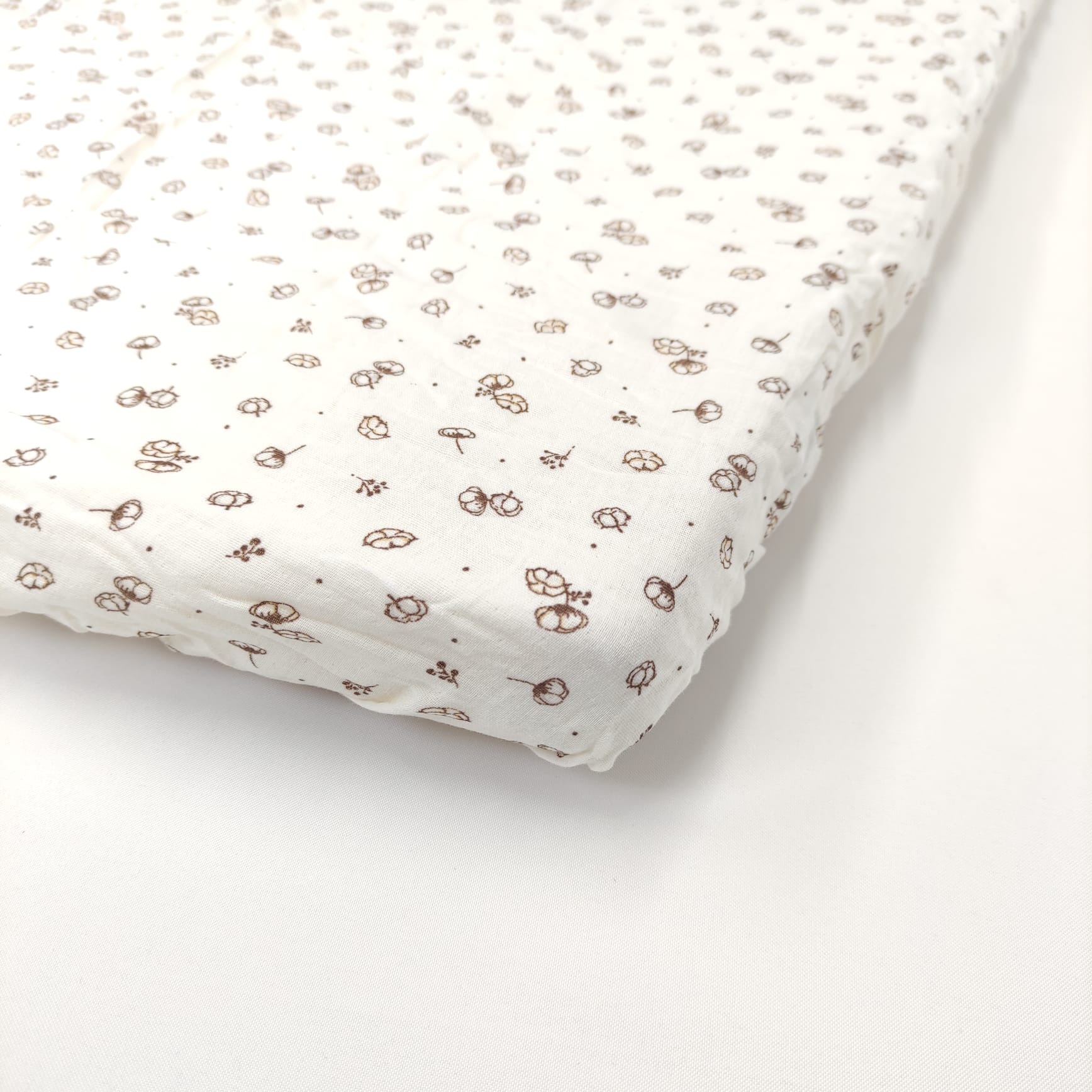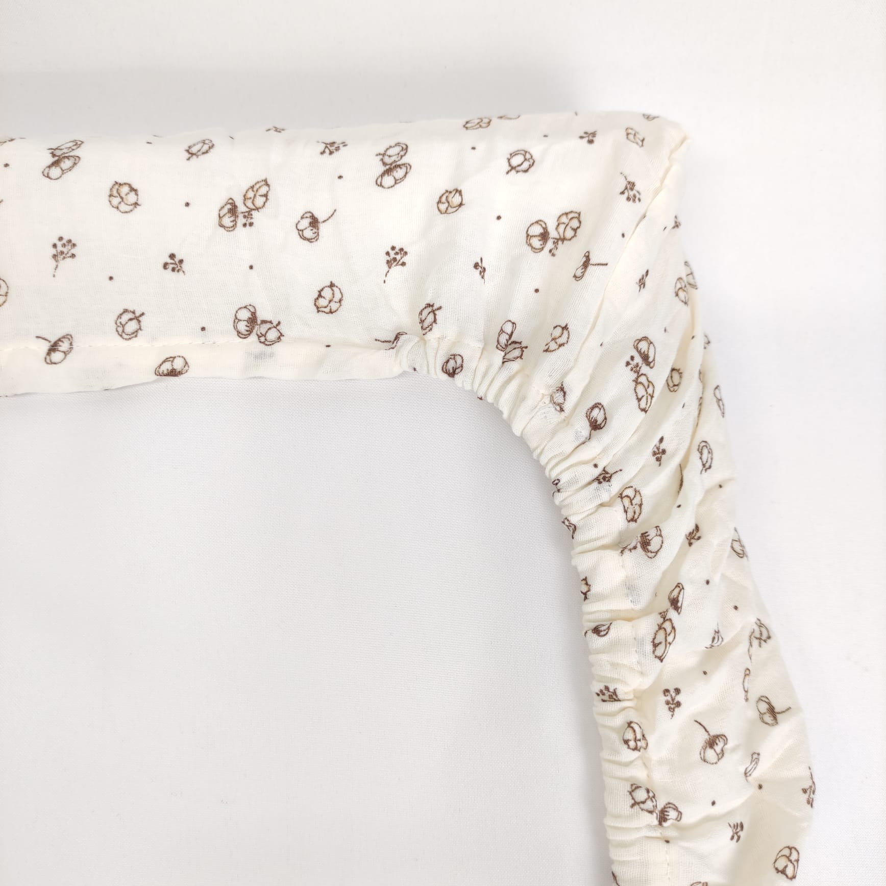 Lençol de baixo ajustável Bebé Flor de Algodão, em musselina e com padrão de flores de algodão, perfeito para garantir o aconhego dos mais pequeninos.