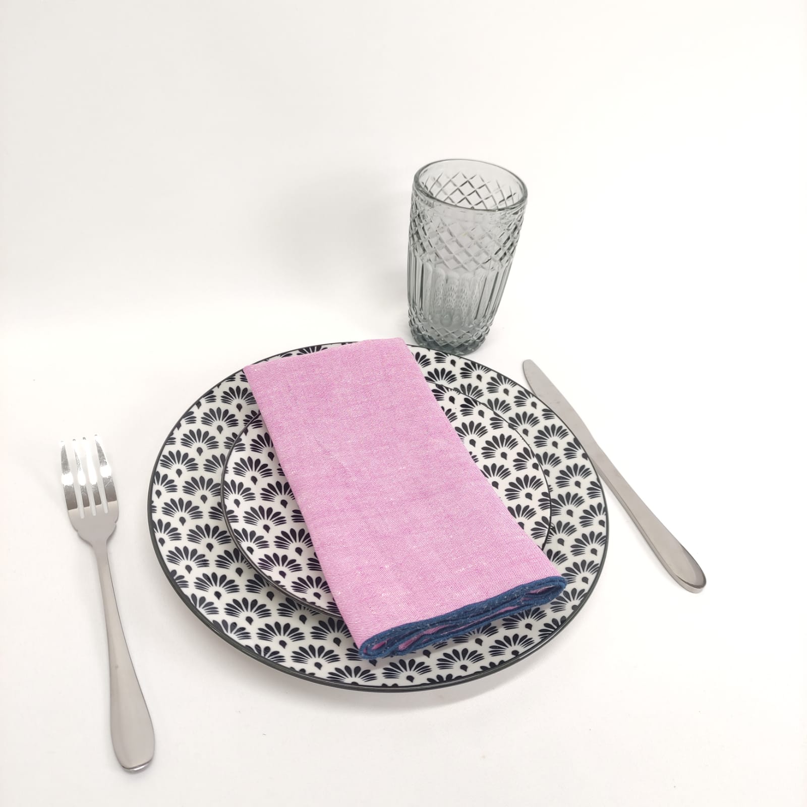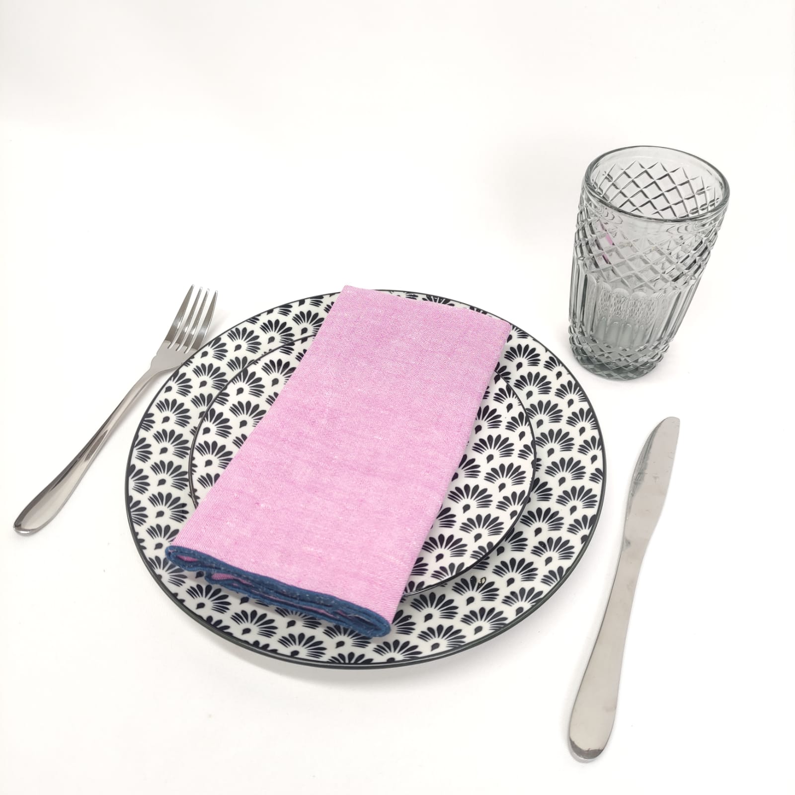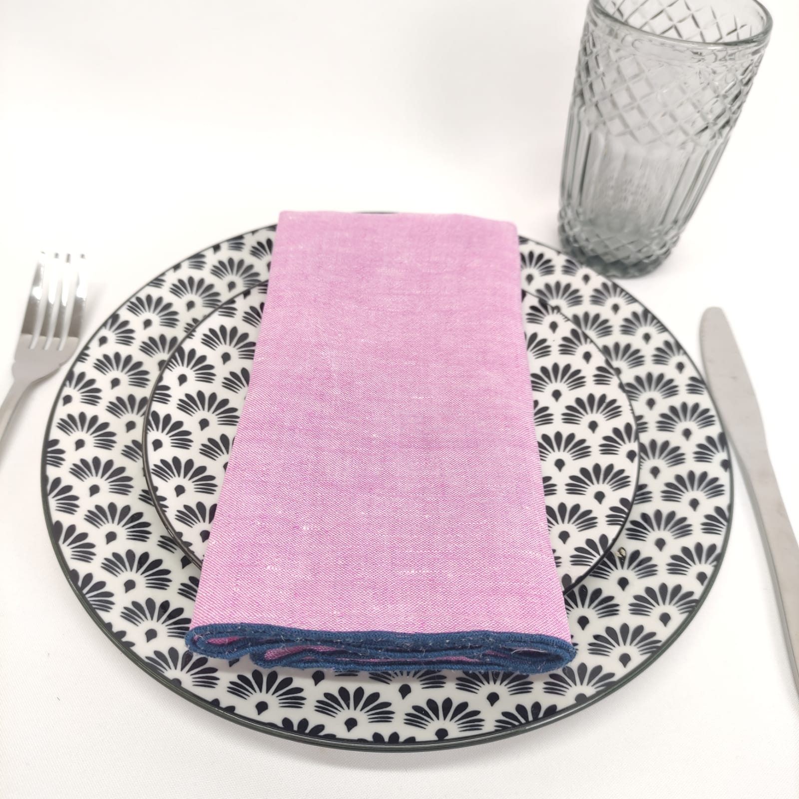 Guardanapo em linho rosa, ideal para adiconar um toque moderno à sua mesa. Acabamento de rolinho em azul escuro.