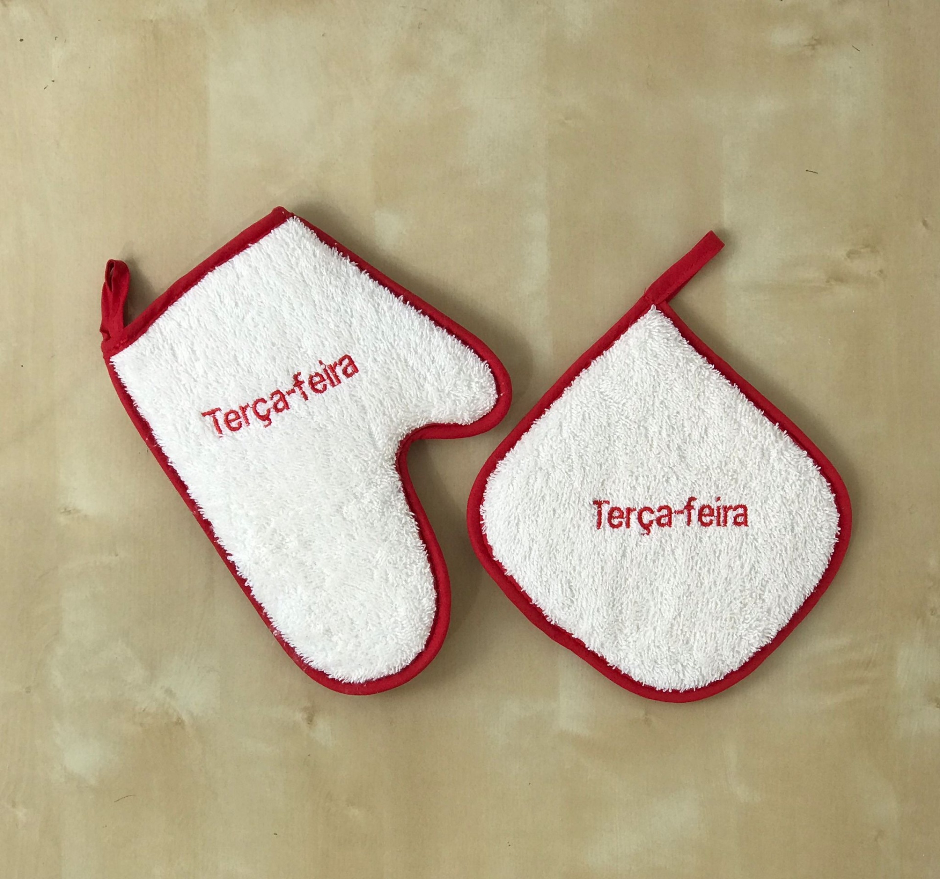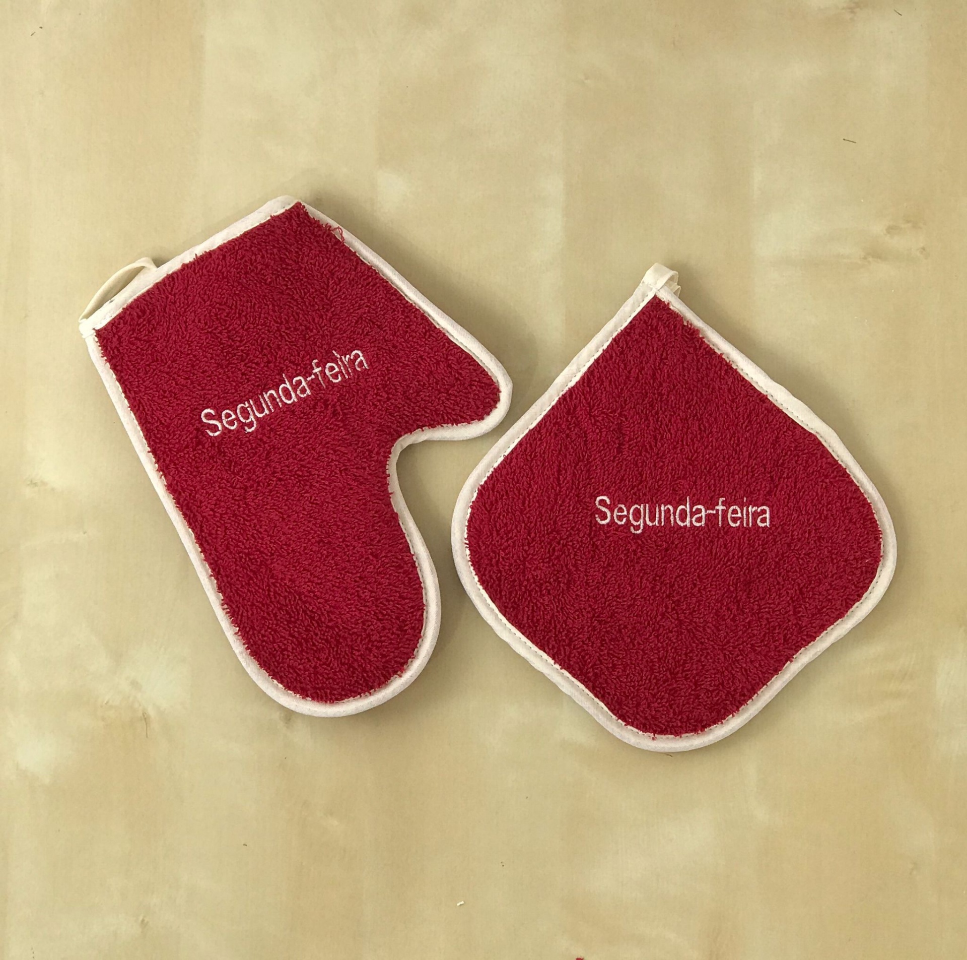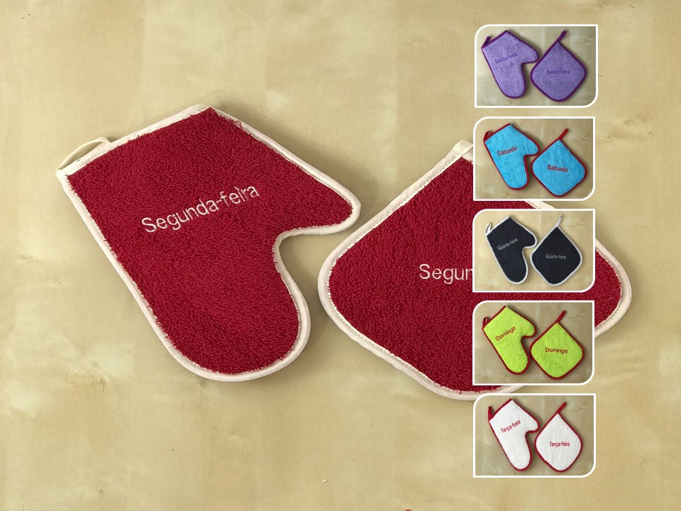 Luvas e Pegas de felpo com bordado dias da semana.