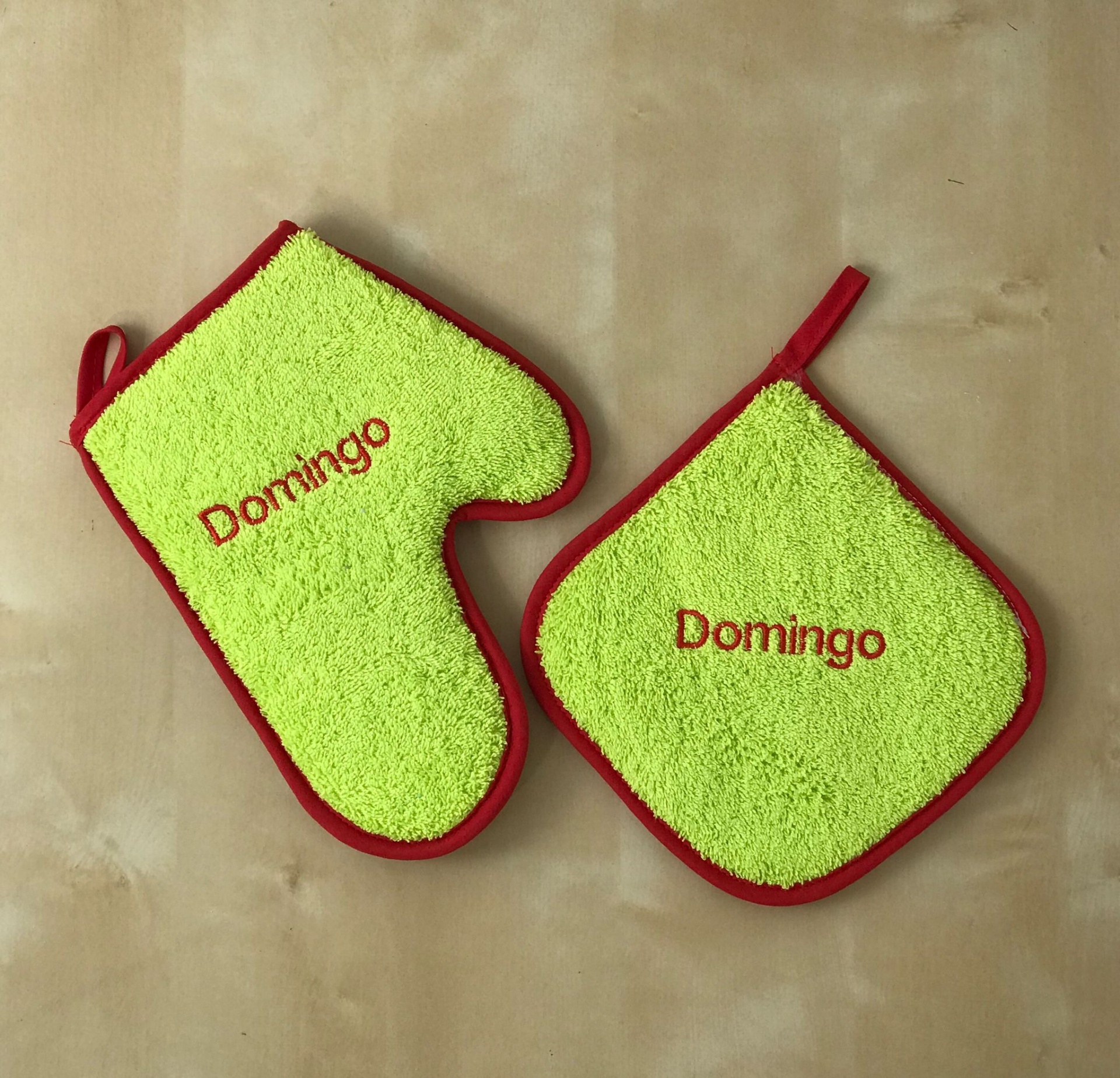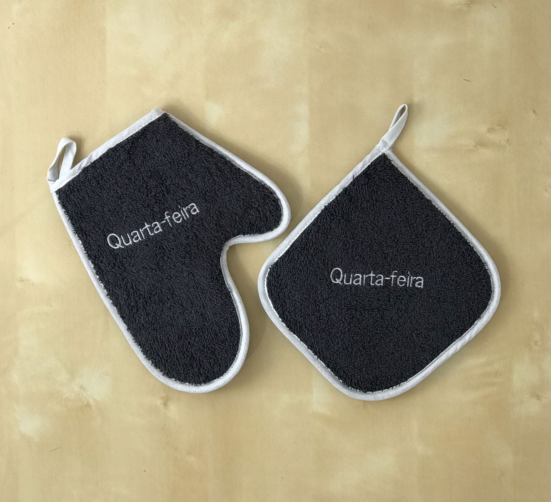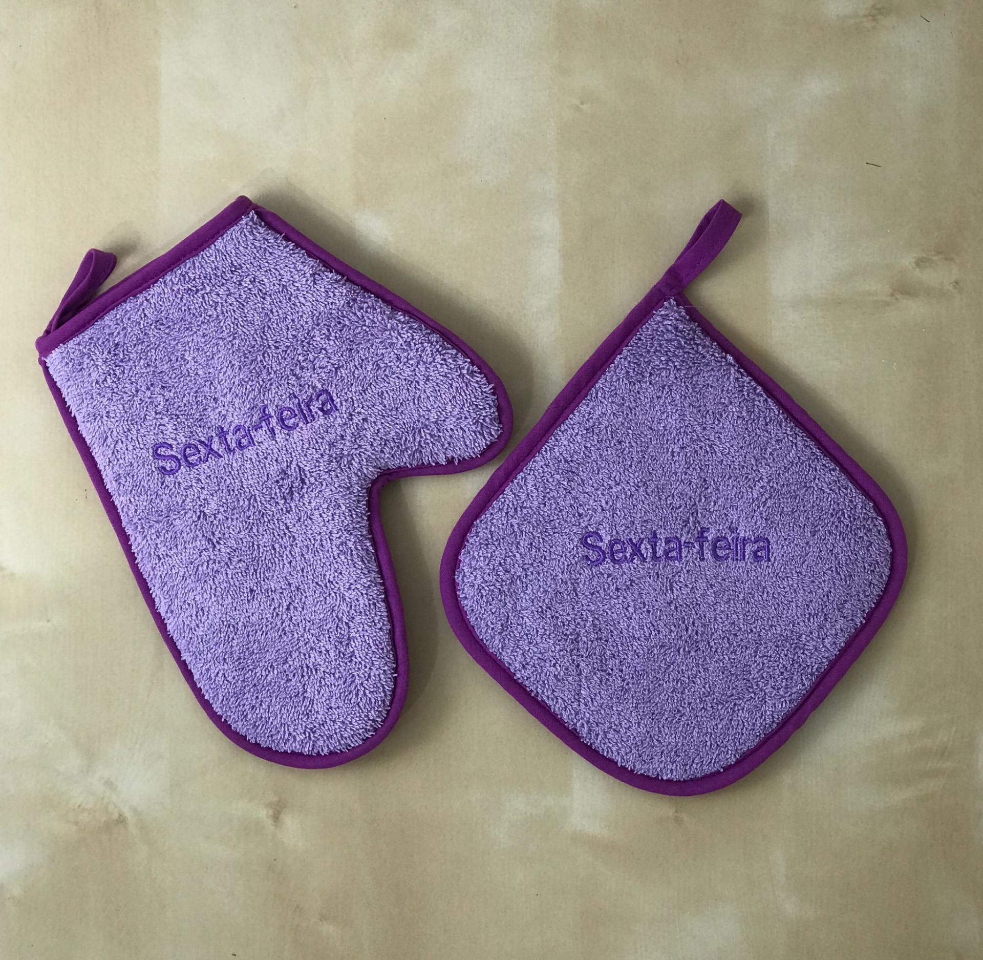 Luvas e Pegas de felpo com bordado dias da semana.