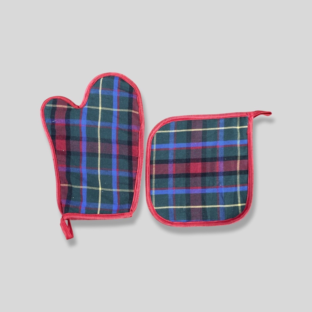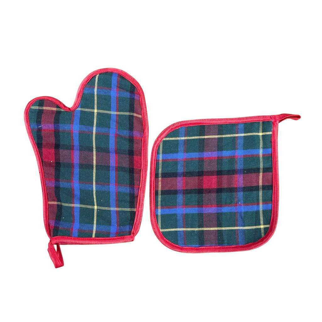 Luvas e Pegas de tecido com remate de bainha colorida.