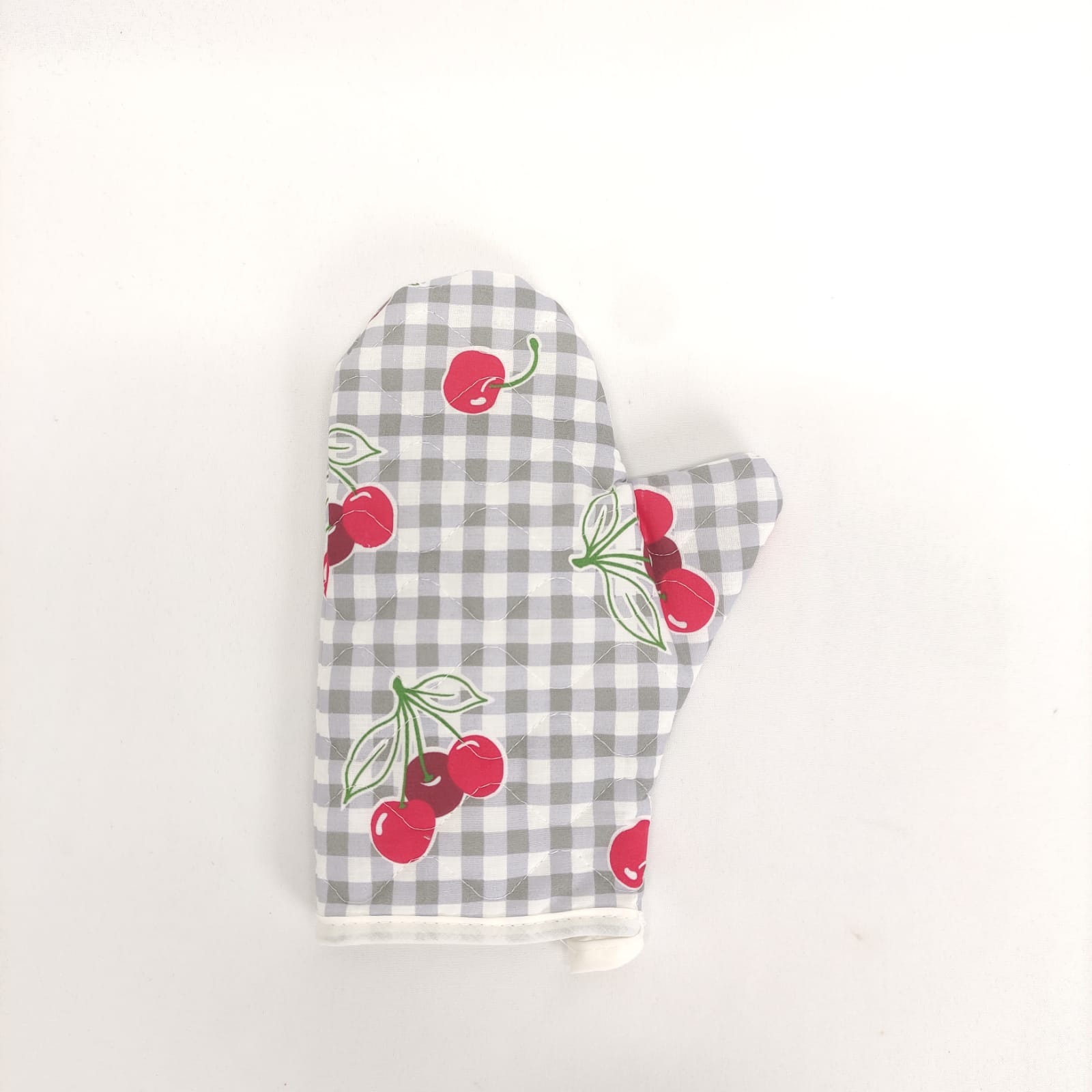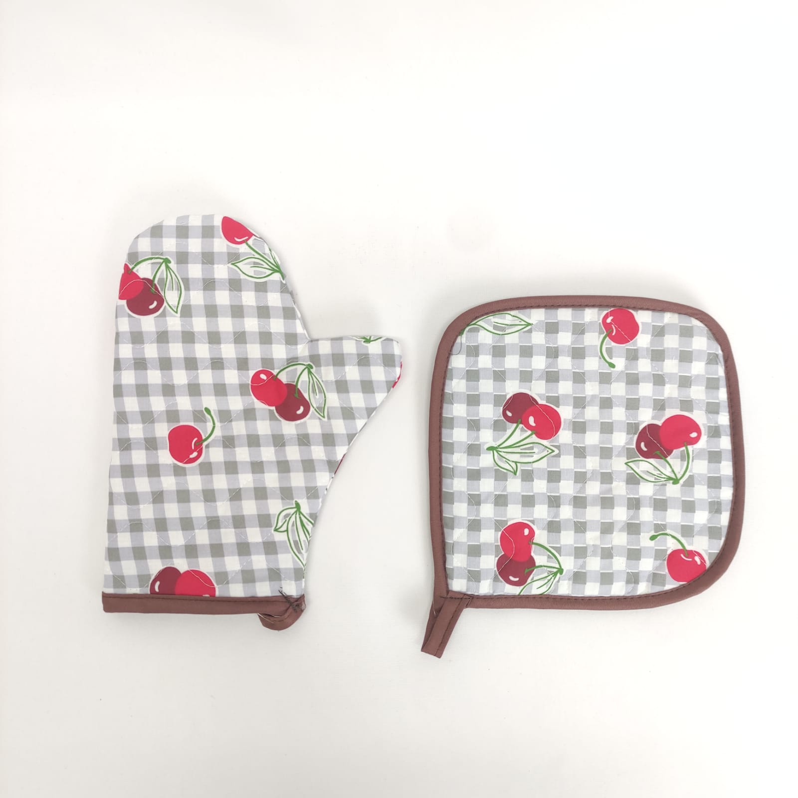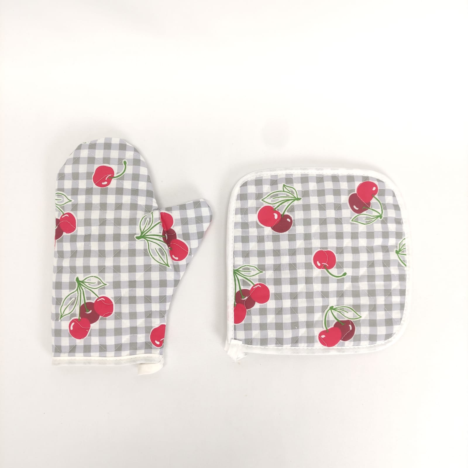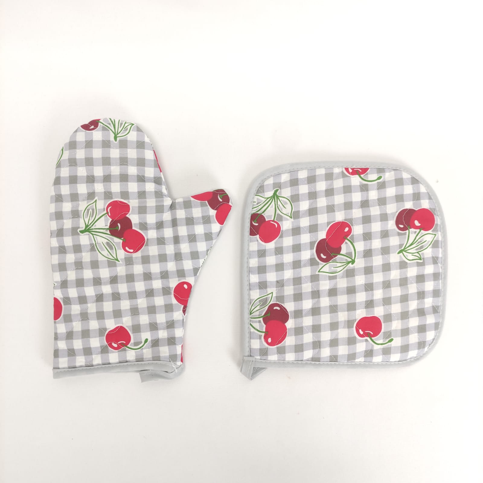 Pega e Luva com padraõ de cerejas, em algodão e acolchoado para maior seguridade e conforto.