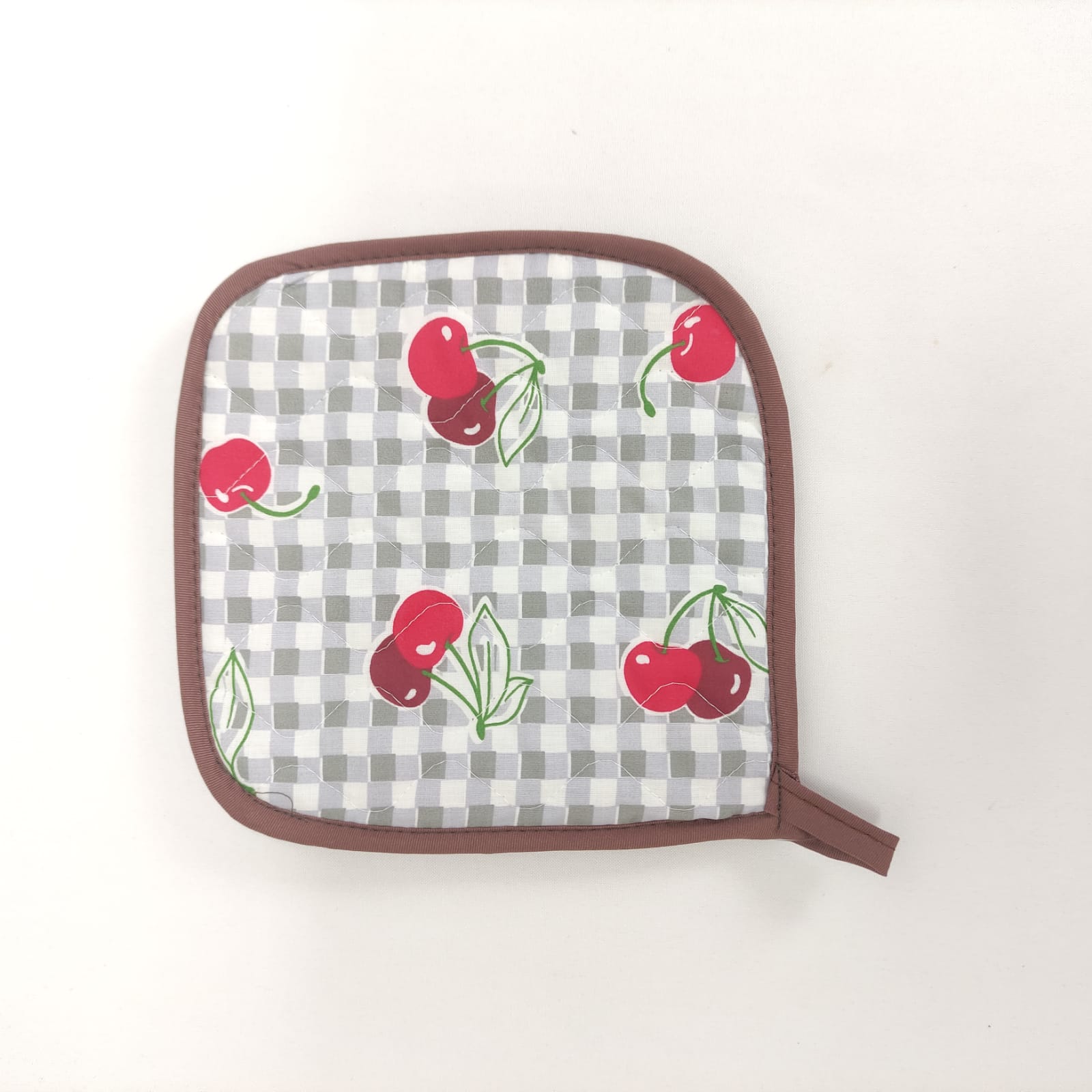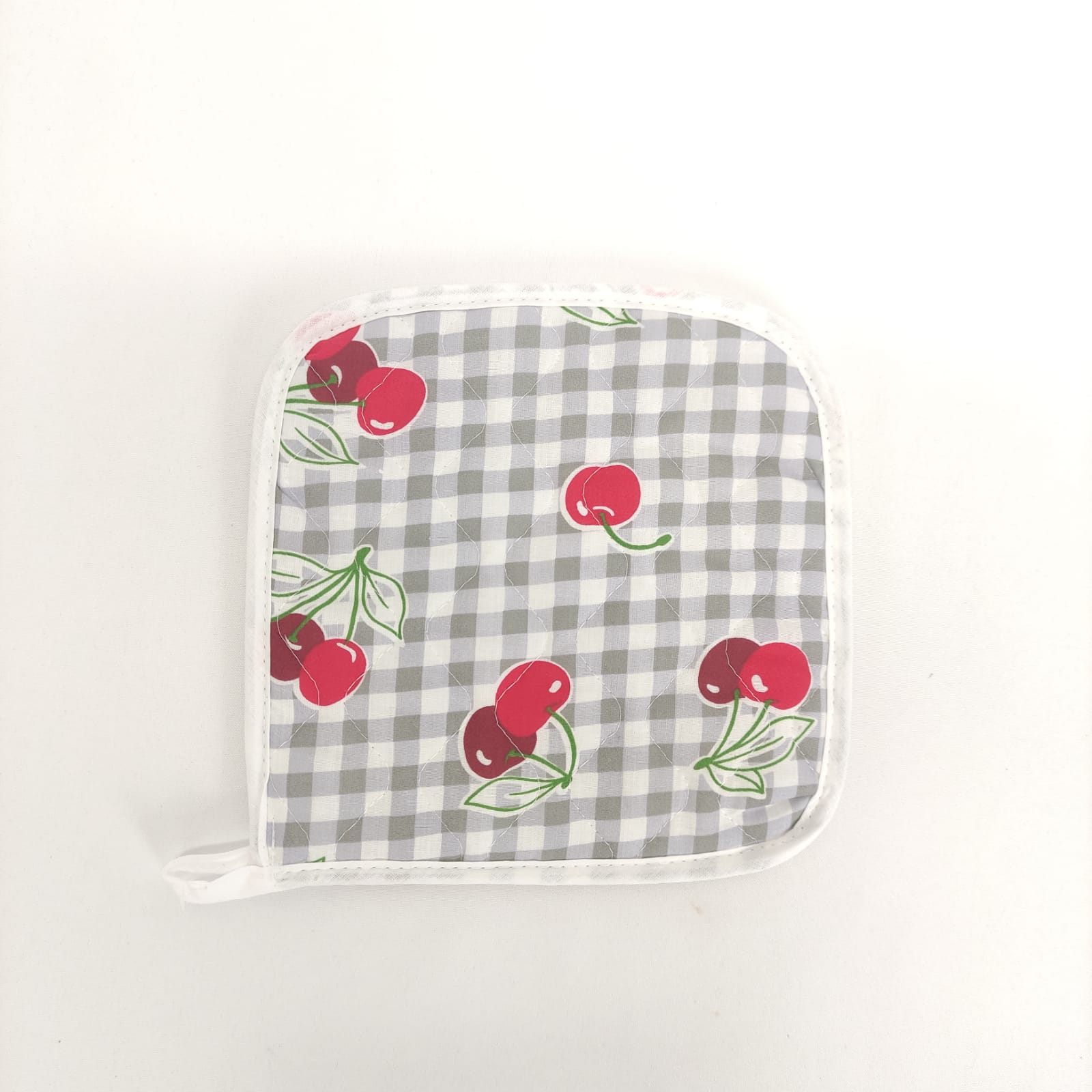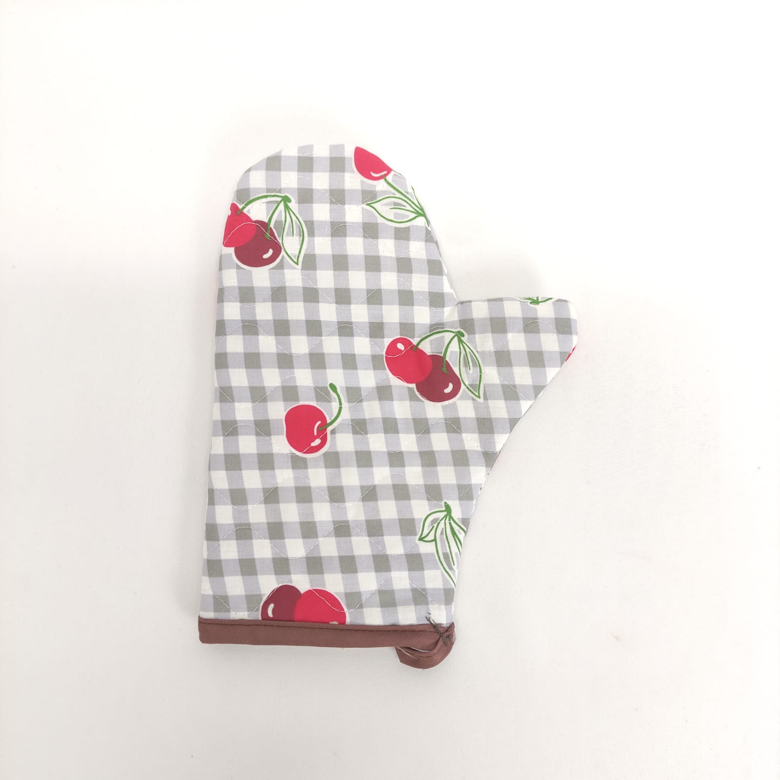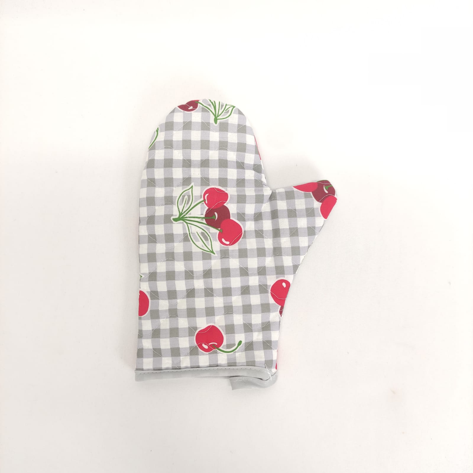 Pega e Luva com padraõ de cerejas, em algodão e acolchoado para maior seguridade e conforto.