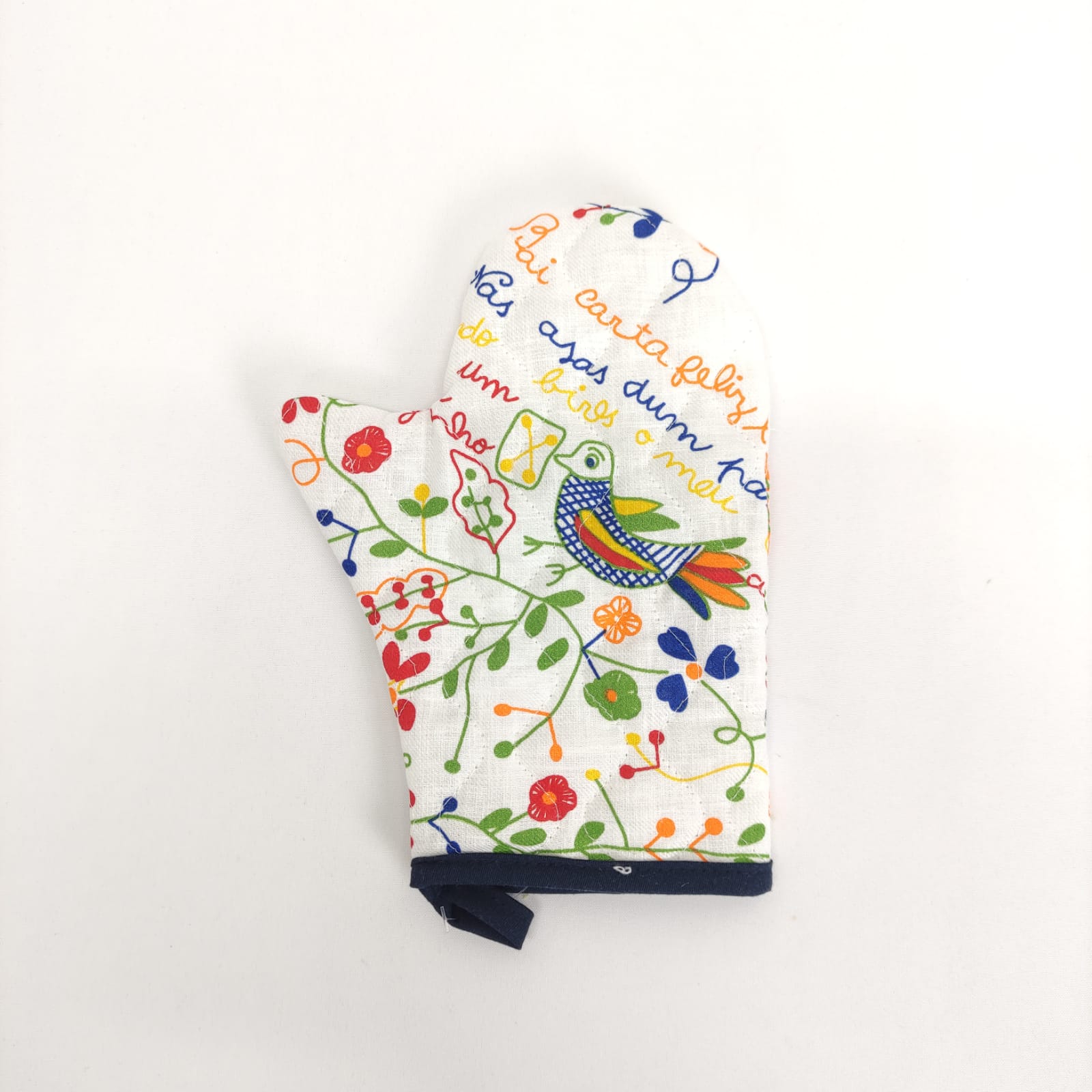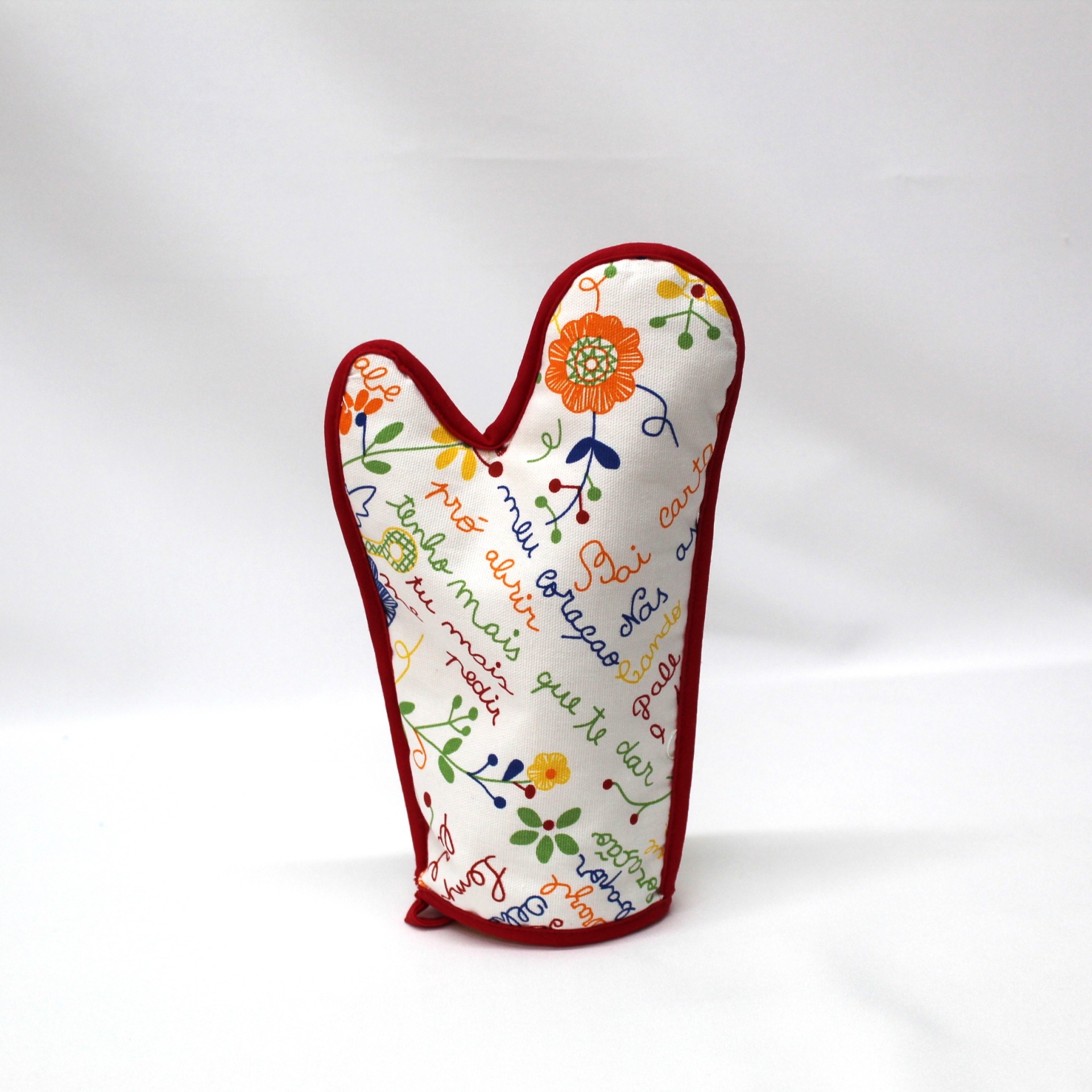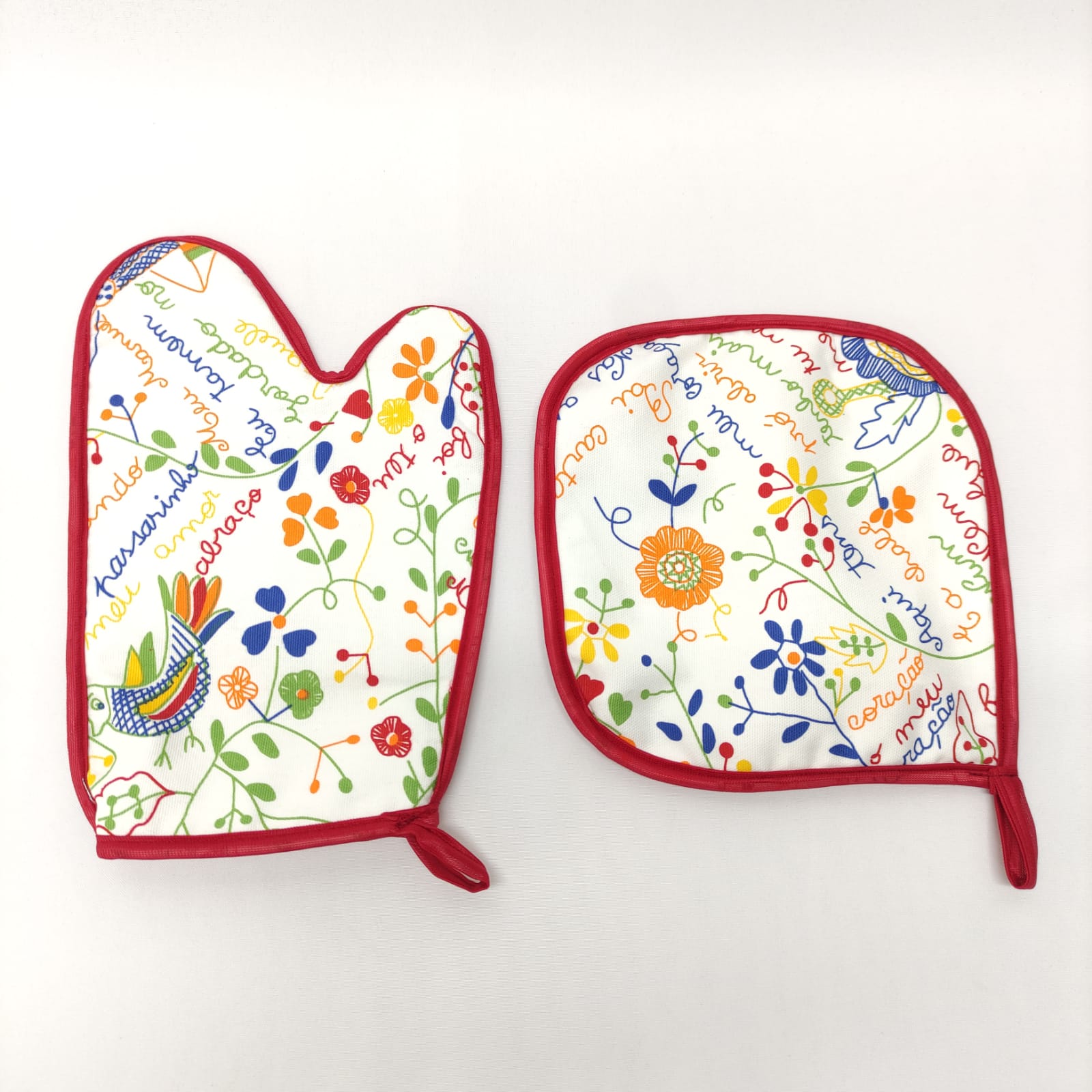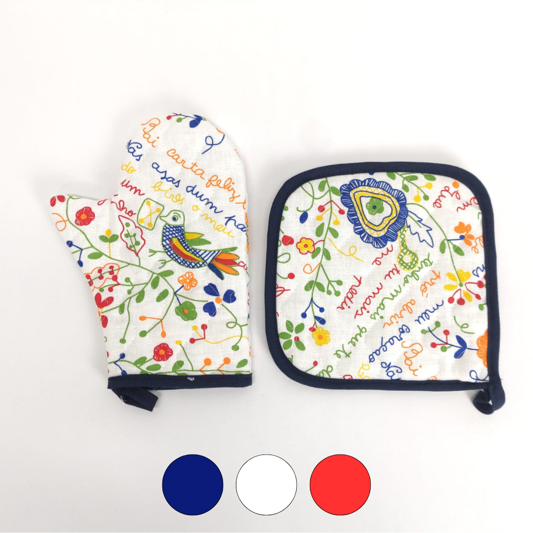 Luva e Pega de cozinha, em tecido estampado "tradicional de Namorados" com remate de bainha colorida.