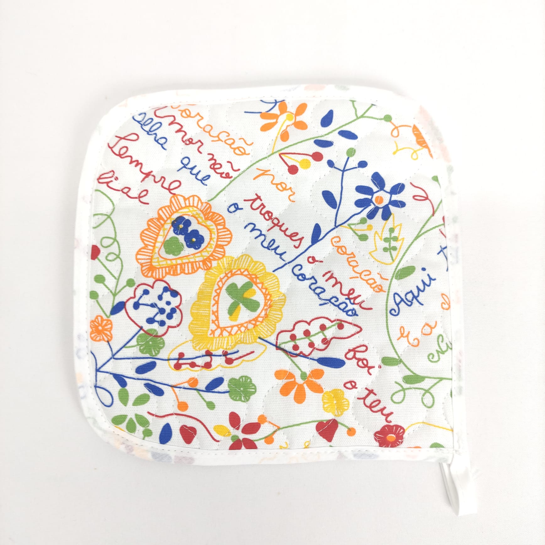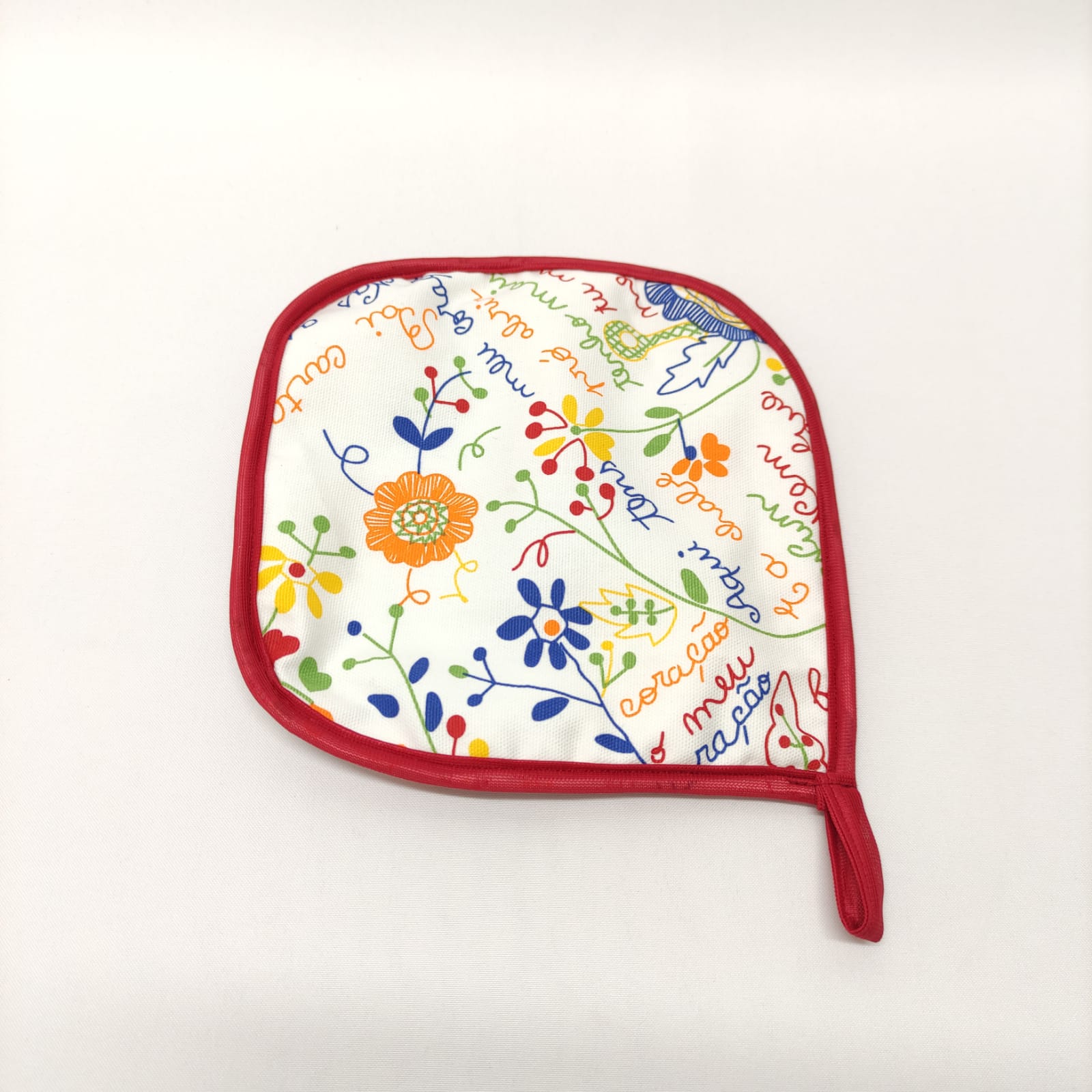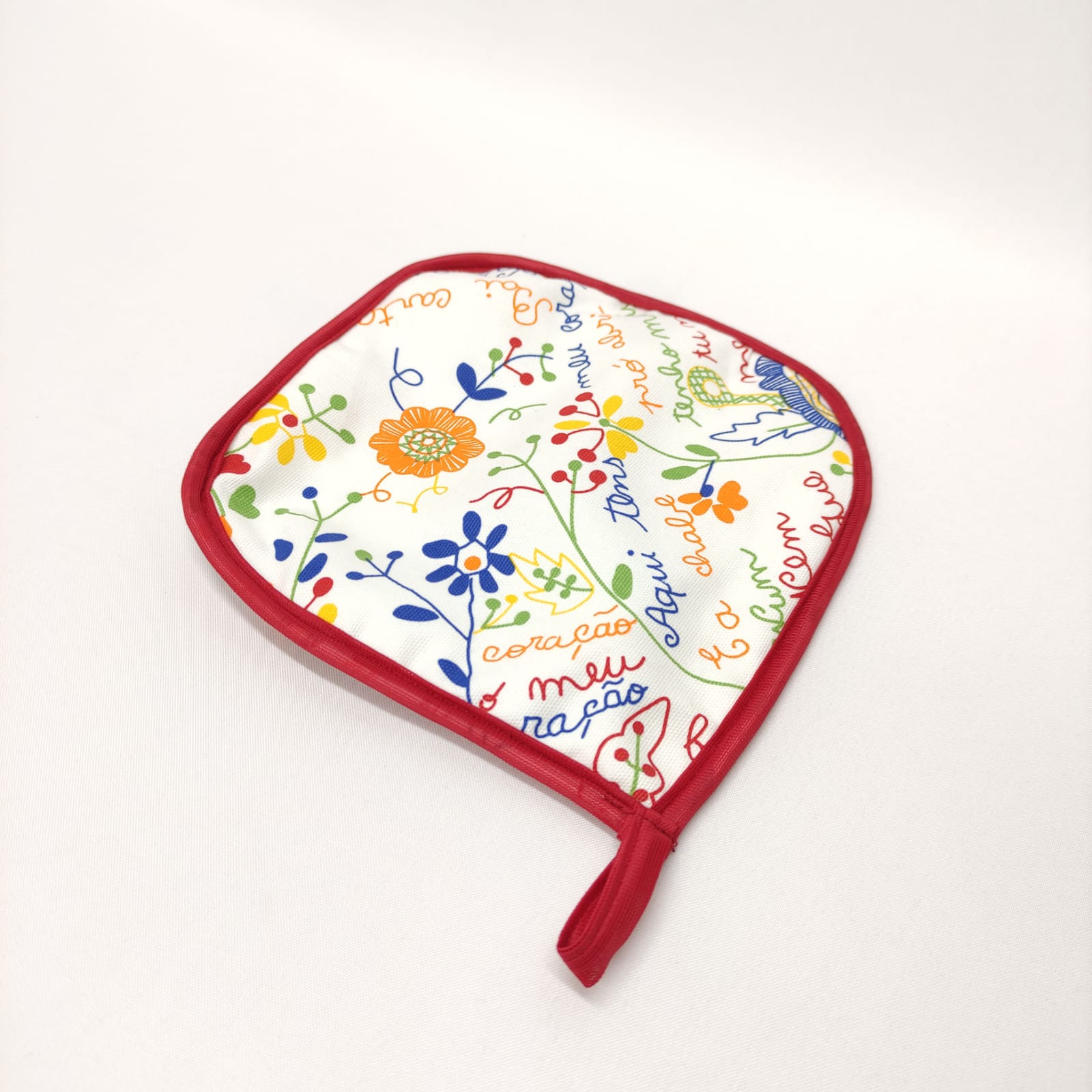 Luva e Pega de cozinha, em tecido estampado "tradicional de Namorados" com remate de bainha colorida.