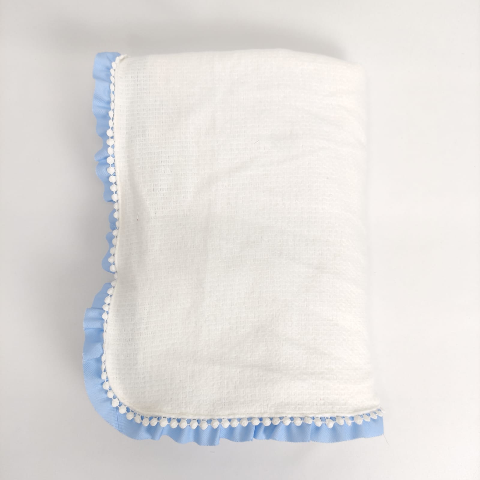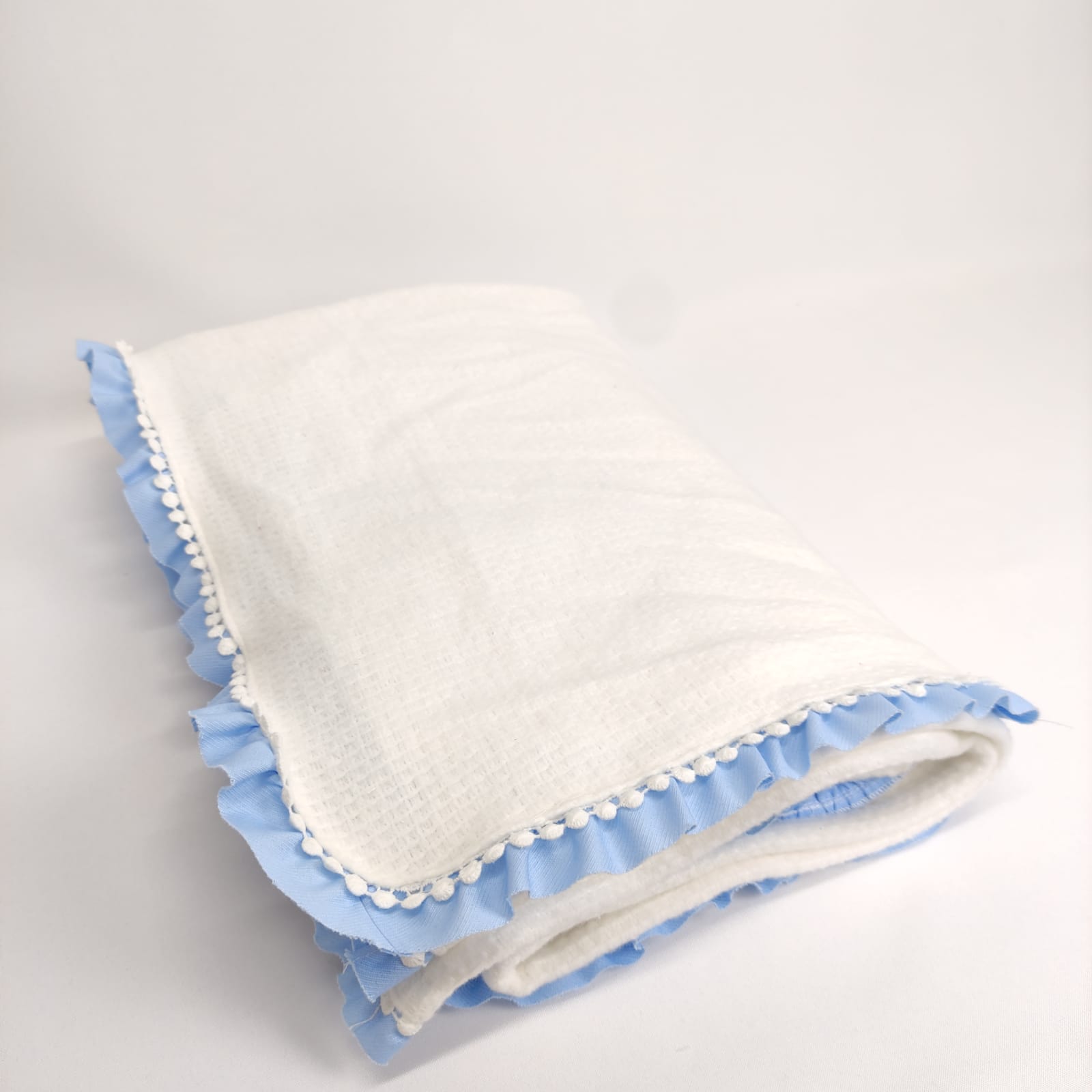 Manta branca com acabamento em folho e renda .