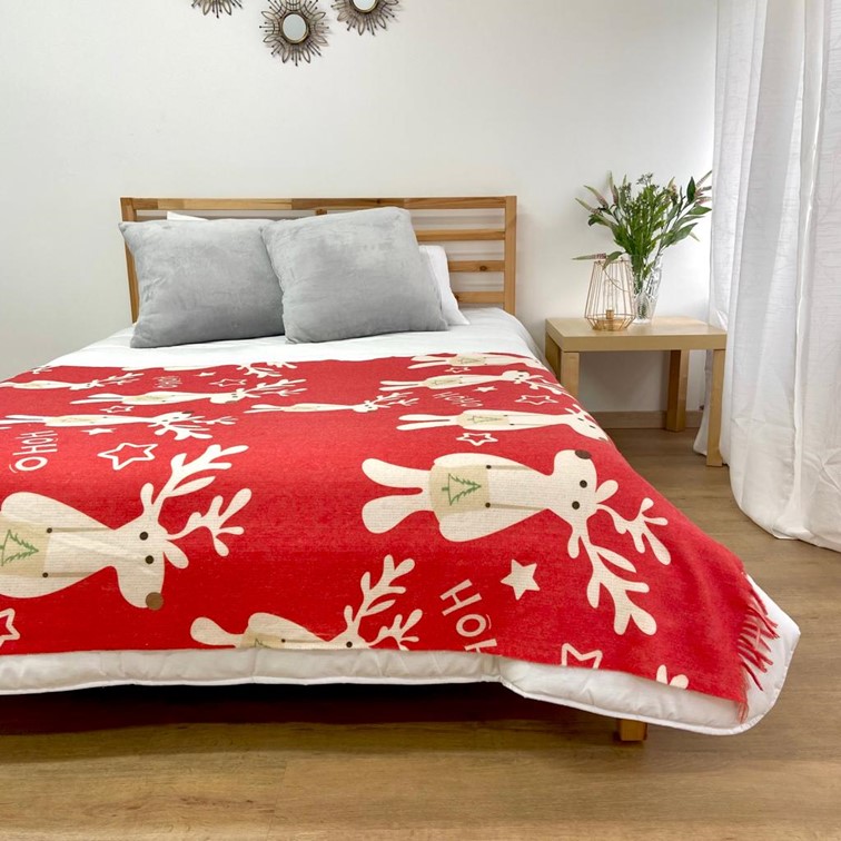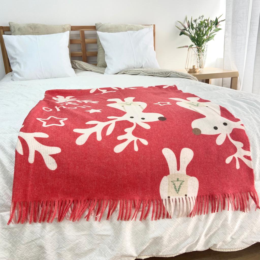 Cobertor natalício vermelho com renas brancas numa cama de madeira