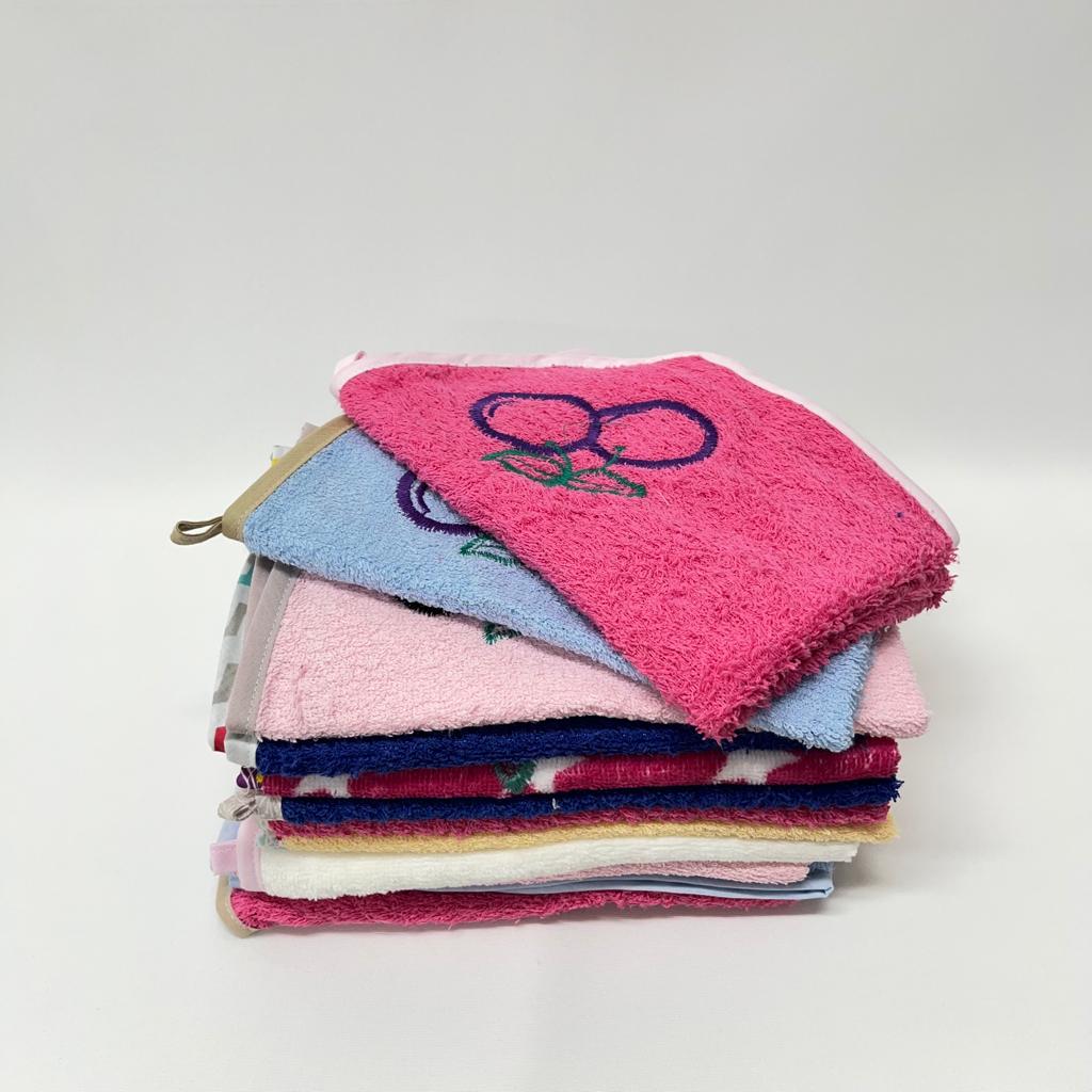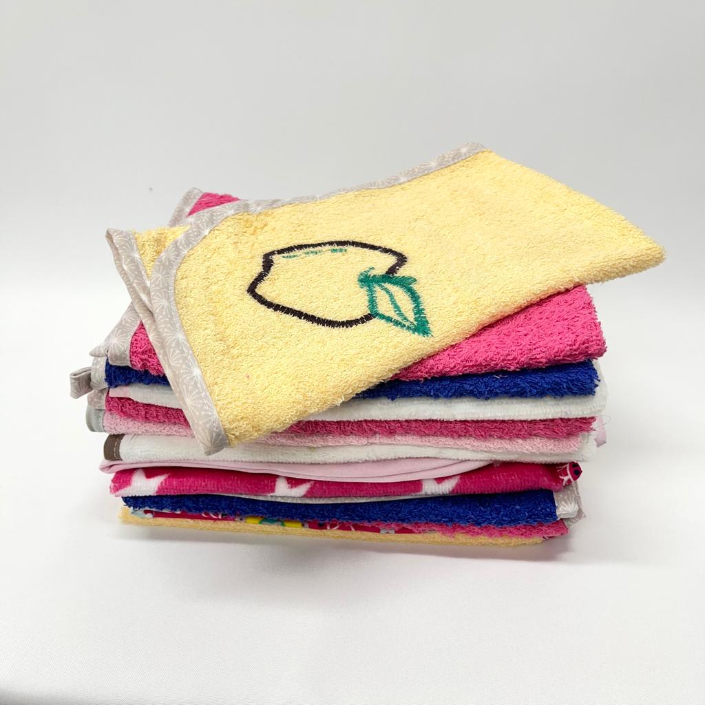 Conjunto de 6 e 12 panos de cozinha em felpo de algodão com bordado de fruta. Disponivel em várias cores.