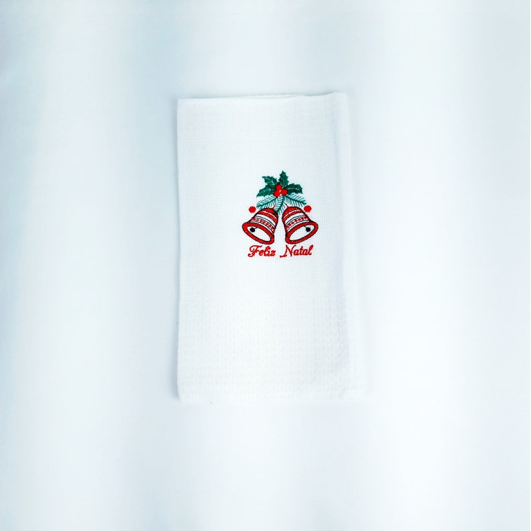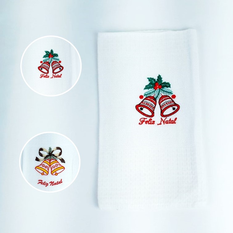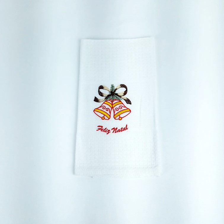 Pano de cozinha em algodão branco, com bordado natalicio de Sino