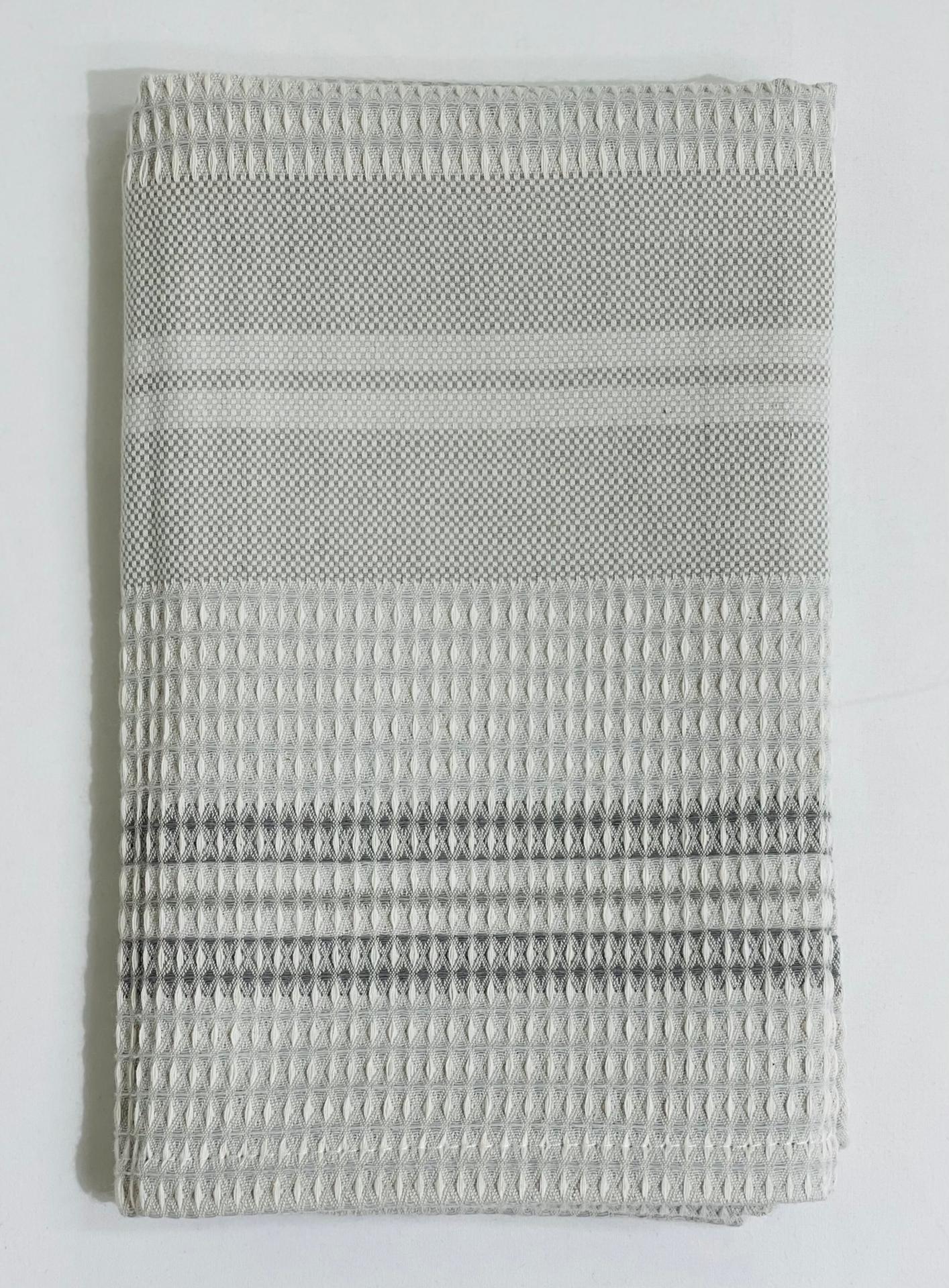 Pano de cozinha algodão cinza com riscas brancas.