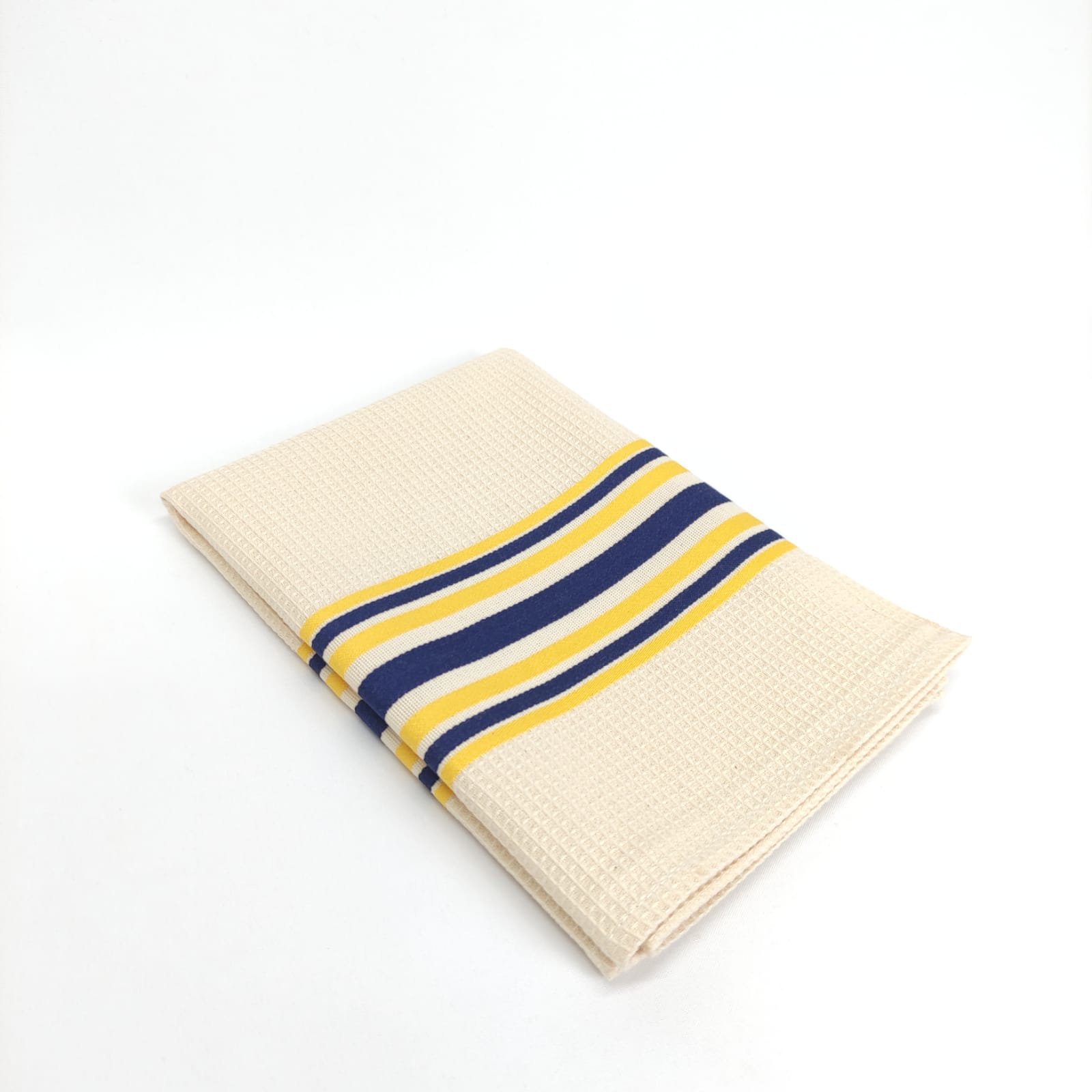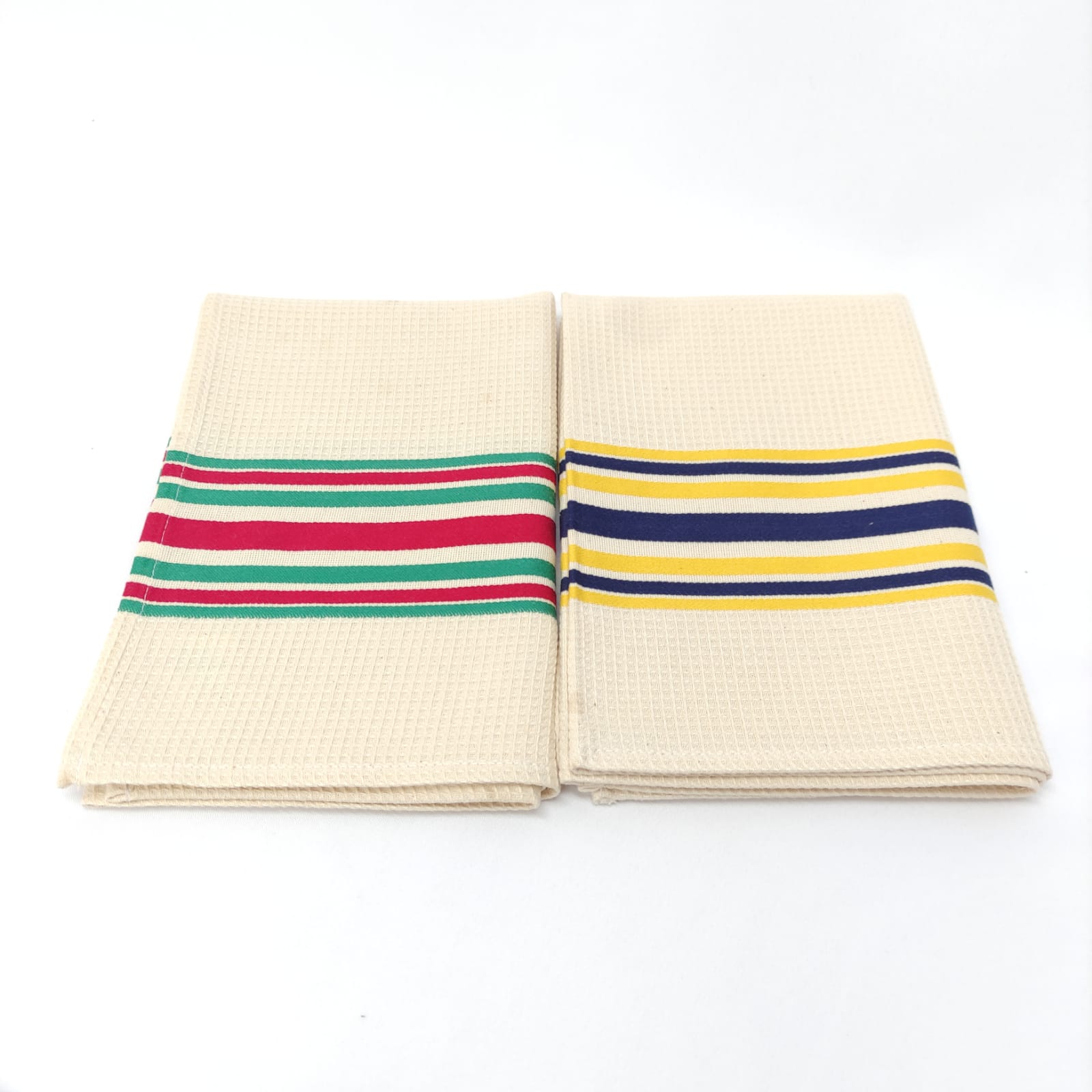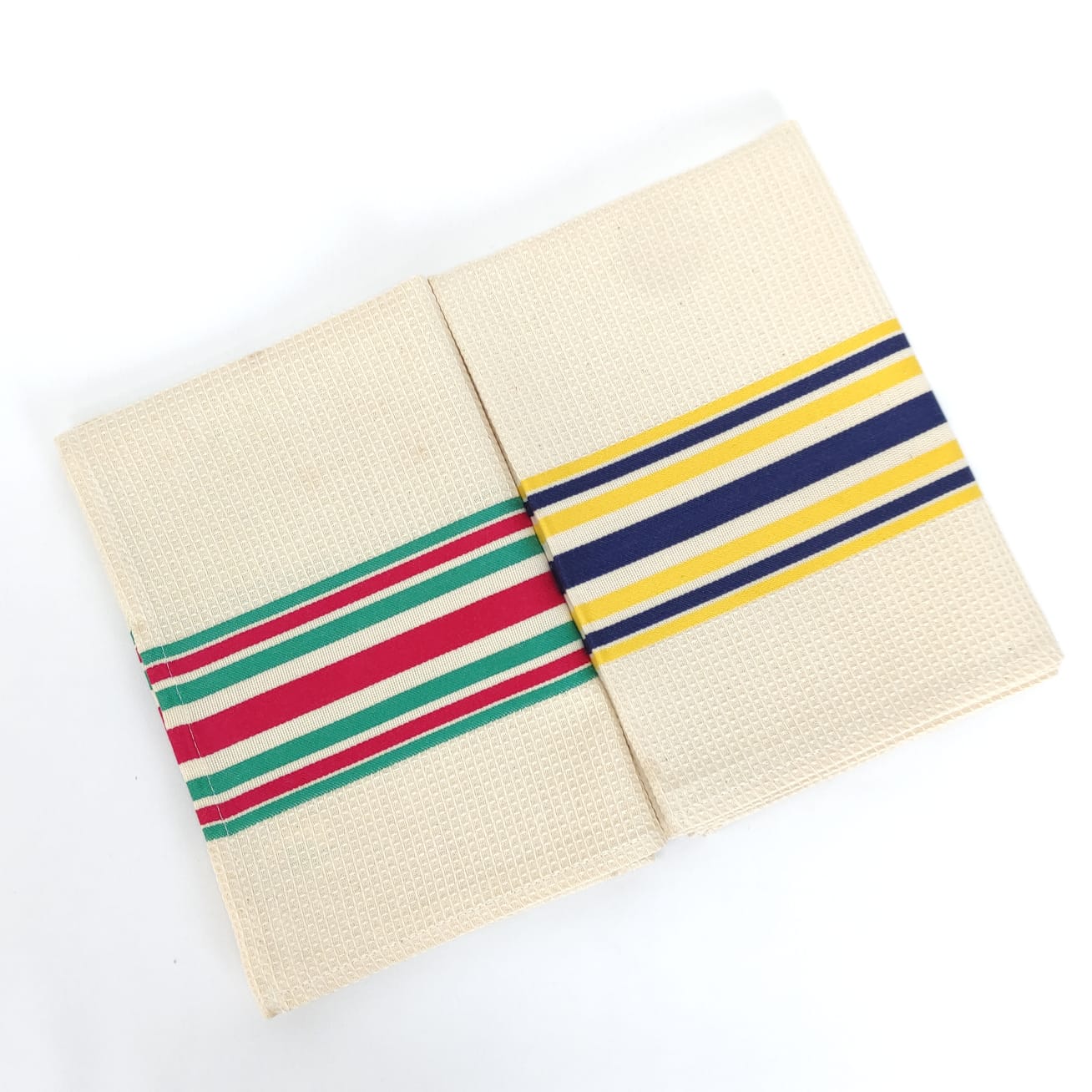 Pano de Cozinha de favo em algodão bege com riscas azul e amarelo ou verde e vermelho.