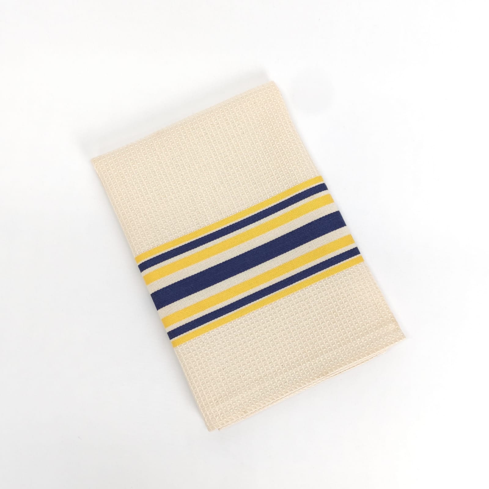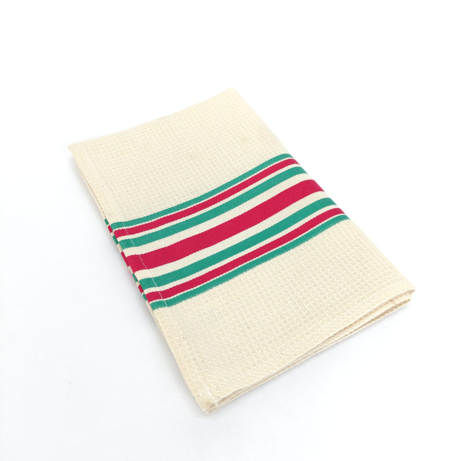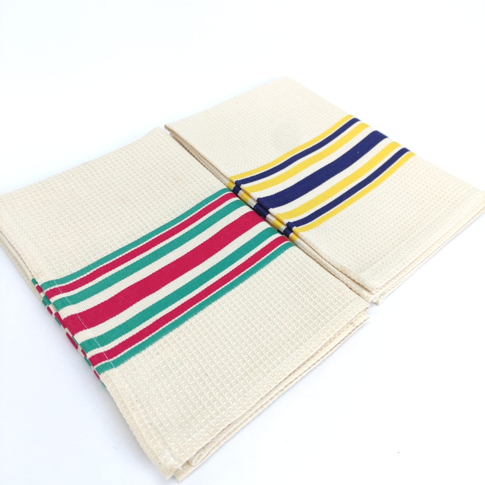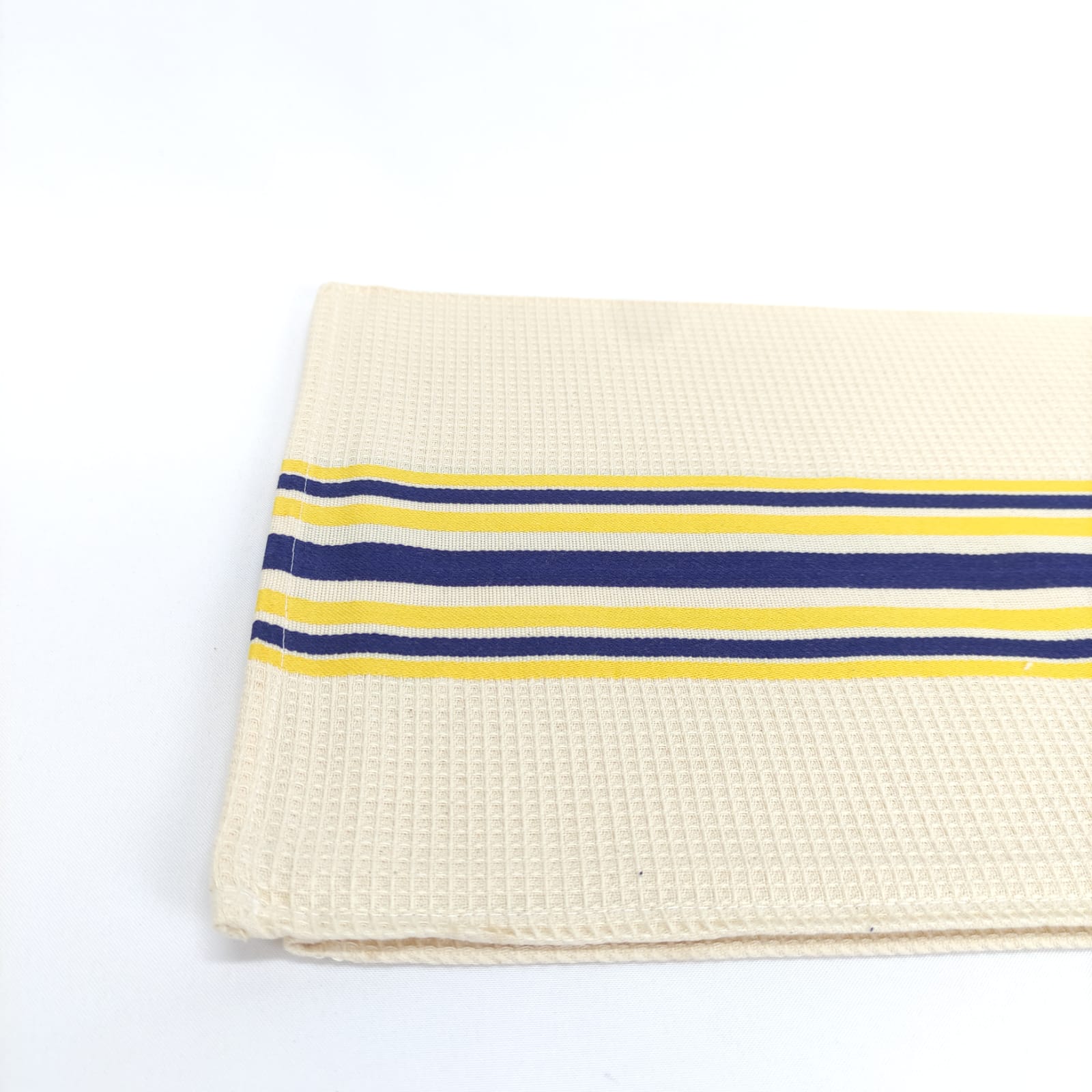 Pano de Cozinha de favo em algodão bege com riscas azul e amarelo ou verde e vermelho.