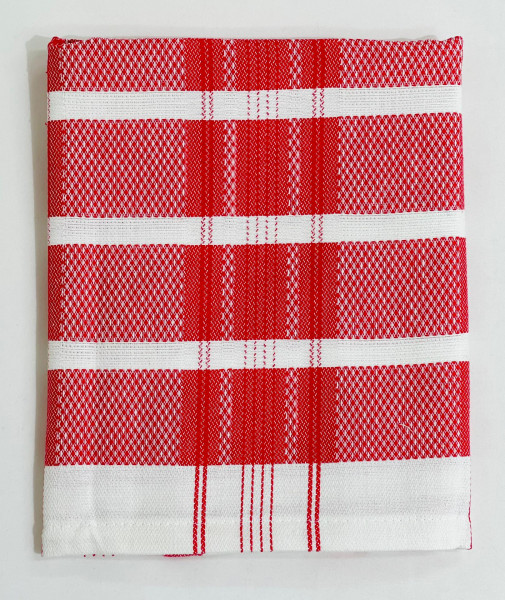 Pano de cozinha algodão vermelho com riscas brancas.