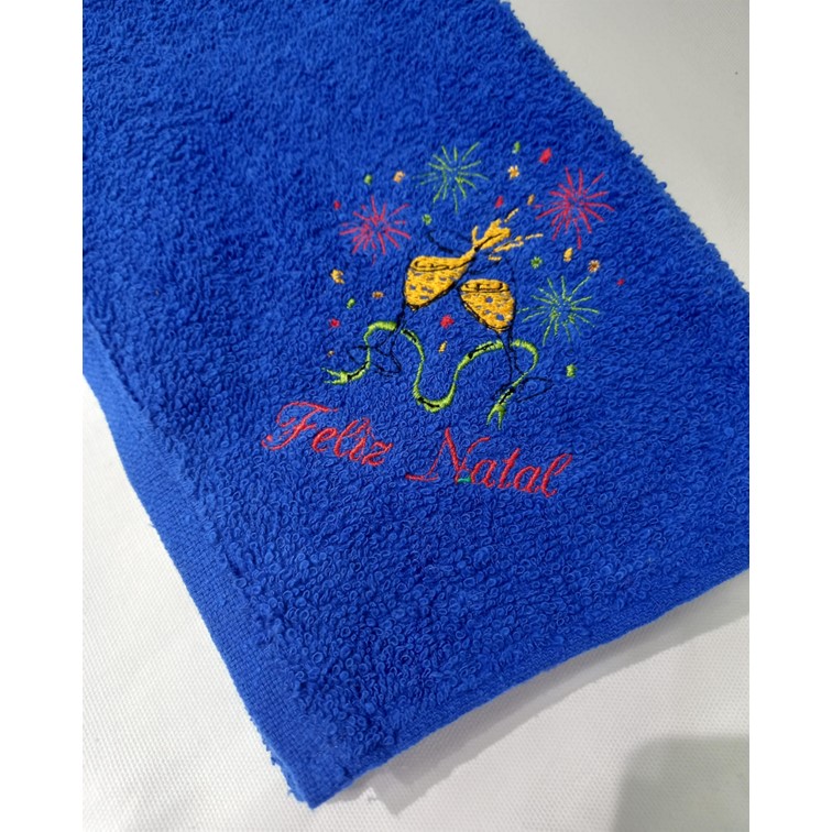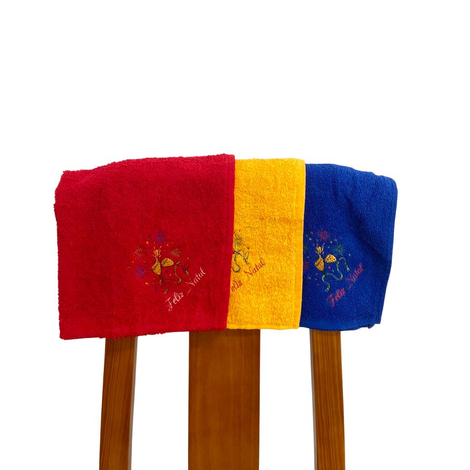 Pano de cozinha em felpo de algodão colorido com bordado natalicio,  Brinde Feliz Natal