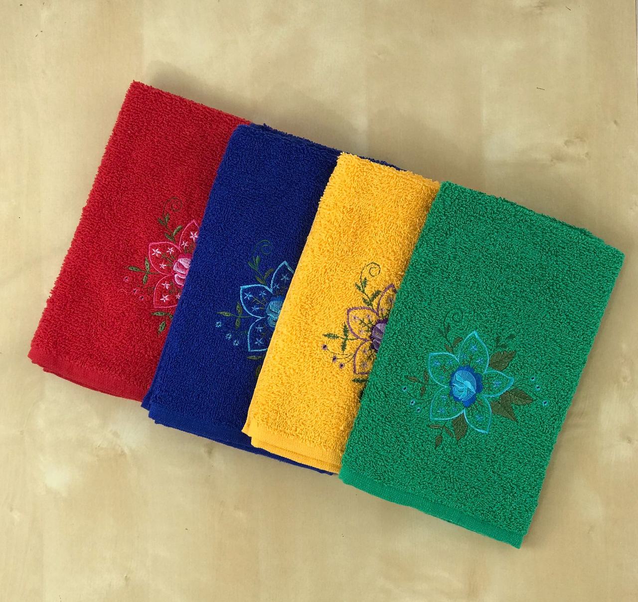 Pano de cozinha em felpo de algodão colorido com bordado.