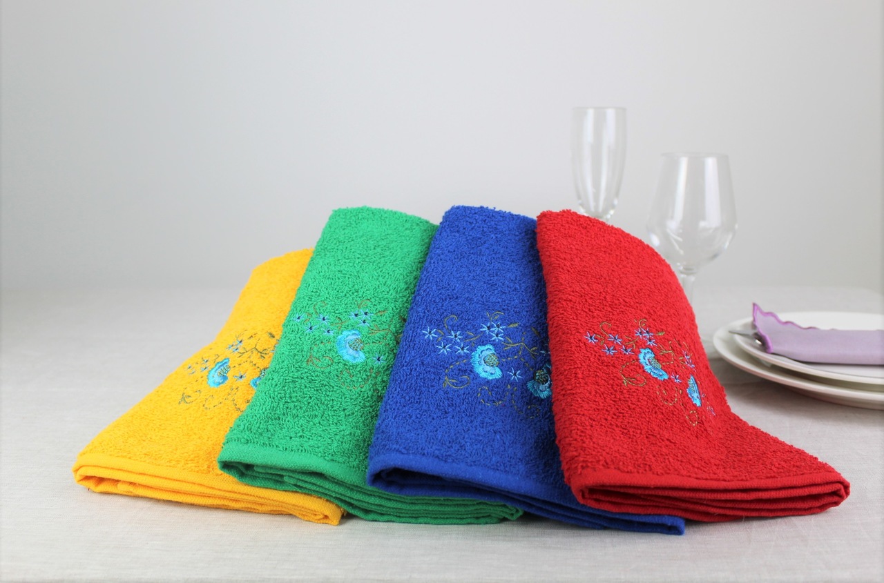 Pano de cozinha em felpo de algodão colorido com bordado.