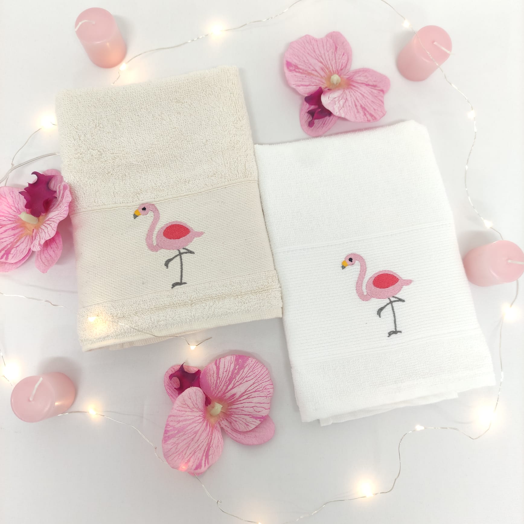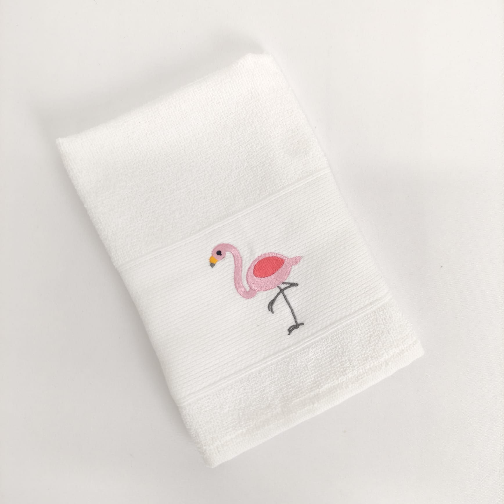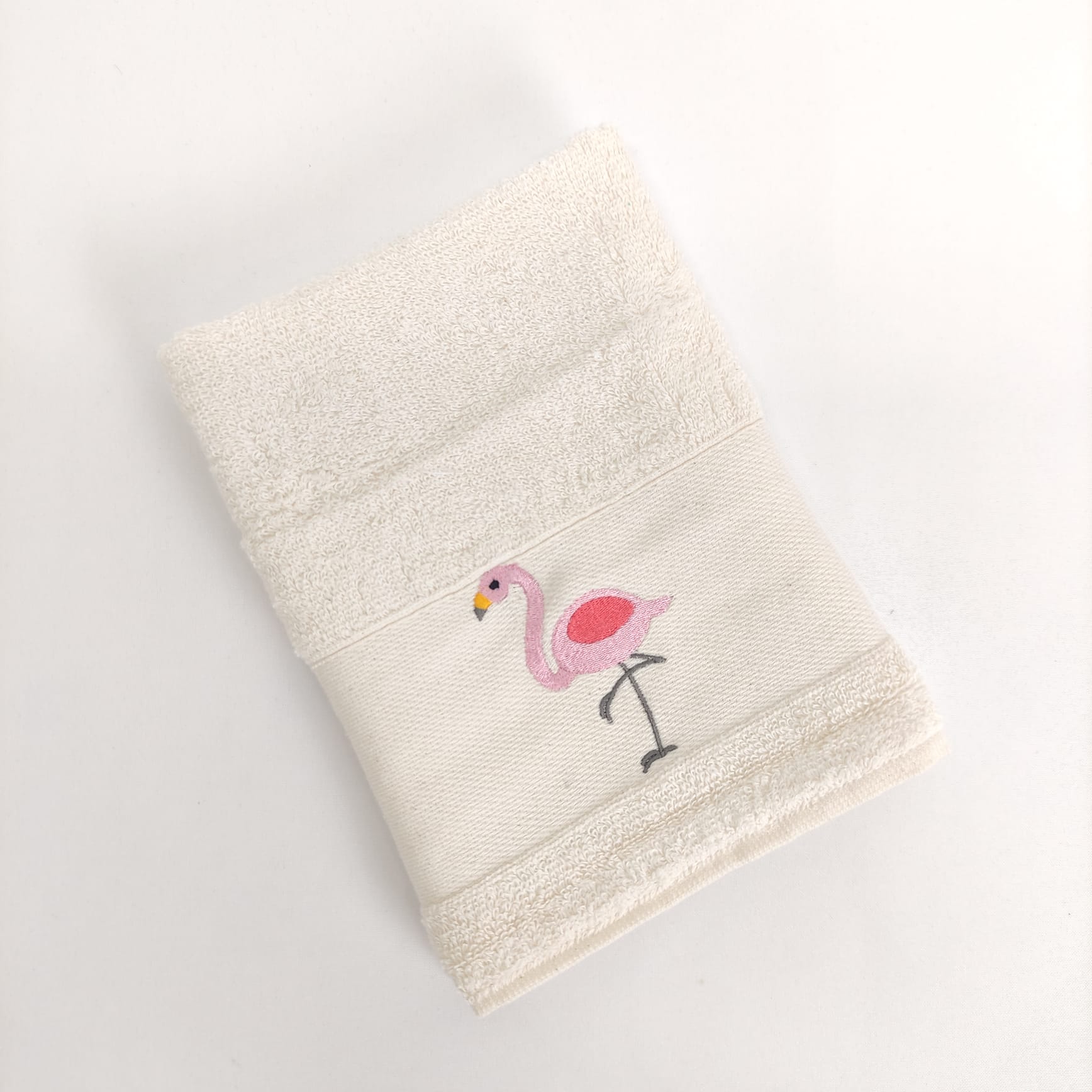 Pano de cozinha em felpo branco ou bege, com bordado de flamingo.