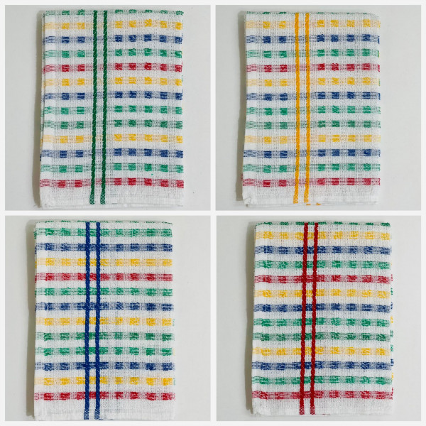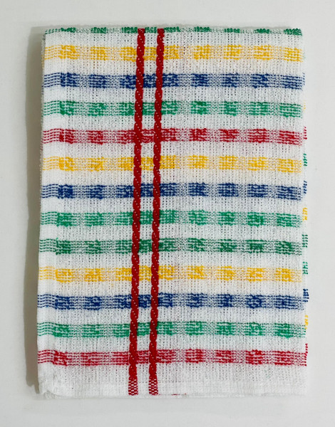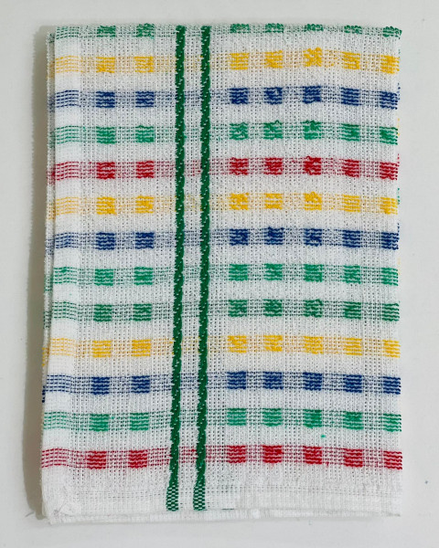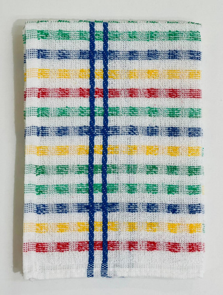 Modelo com riscas atravessadas nas cores Azul, amarelo, vermelho, verde.