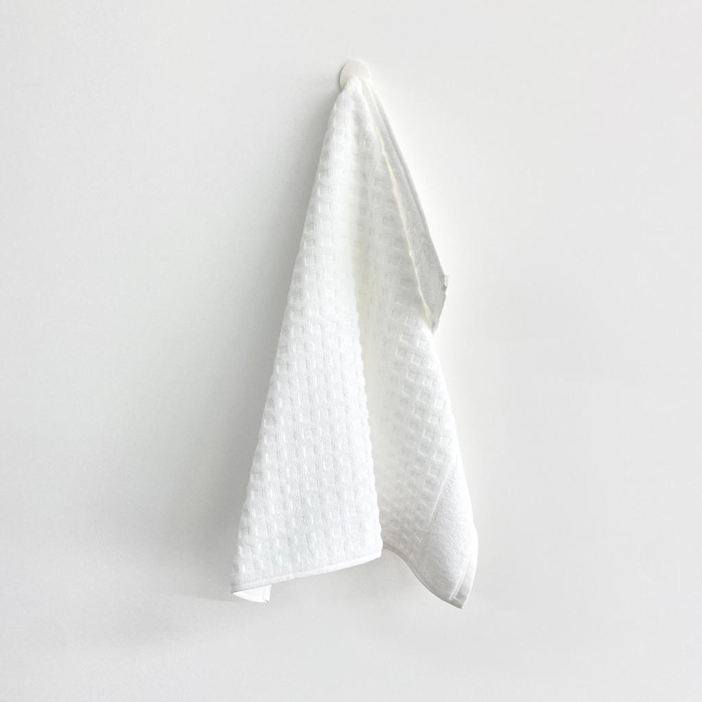 Pano de cozinha branco em algodão com padrão de relevo aos quadradinhos. Modelo muito macio e suave.