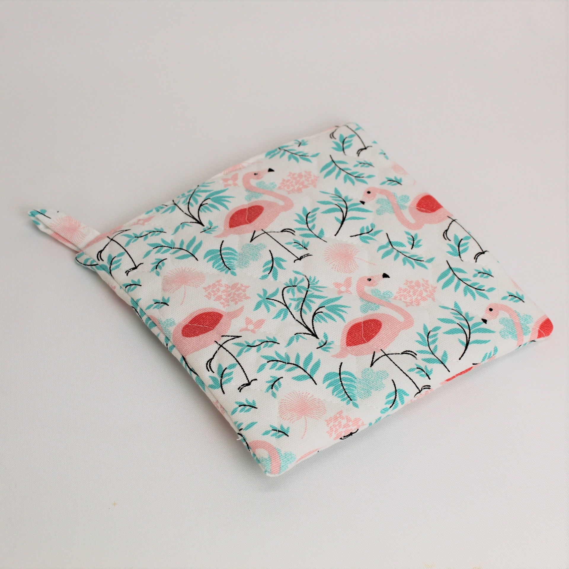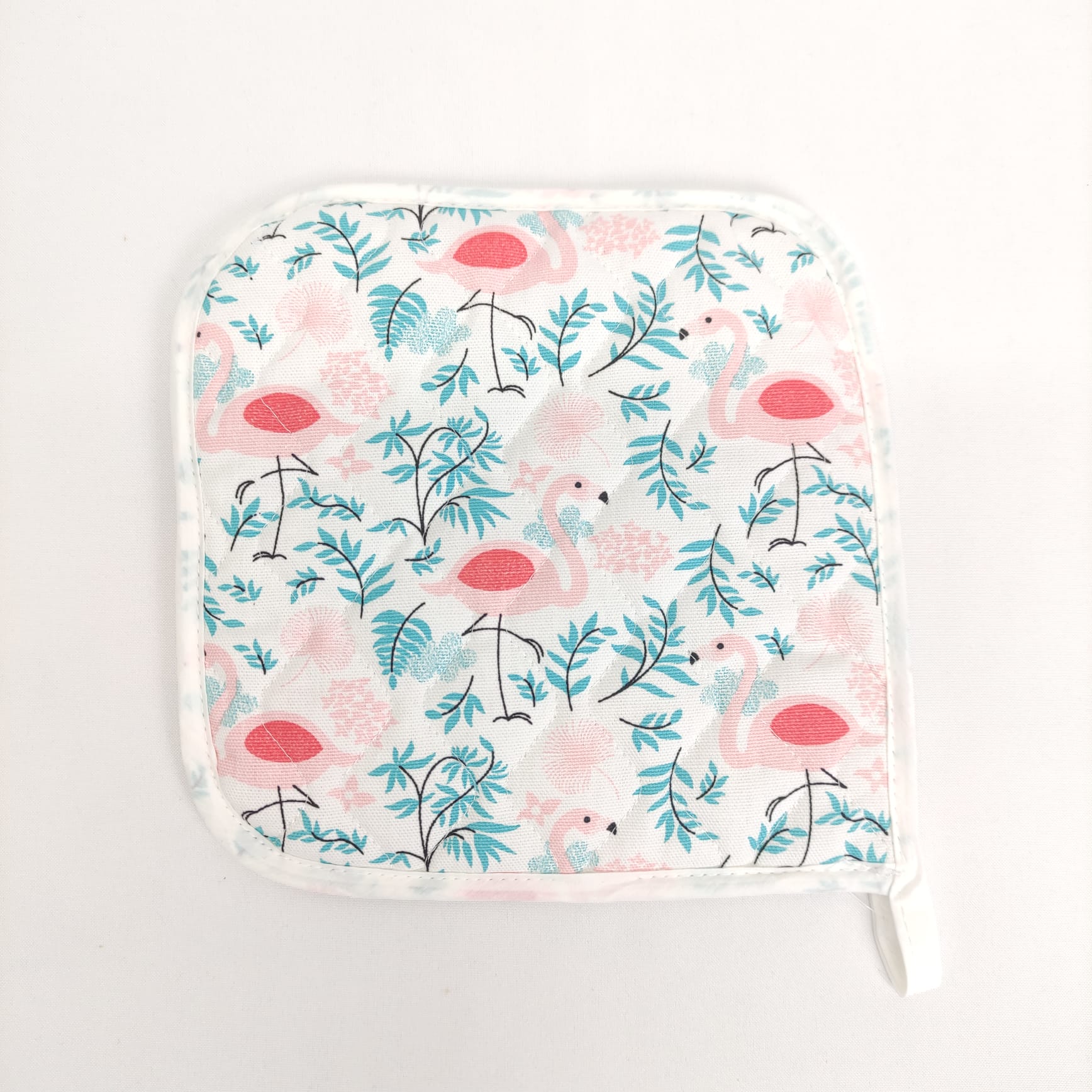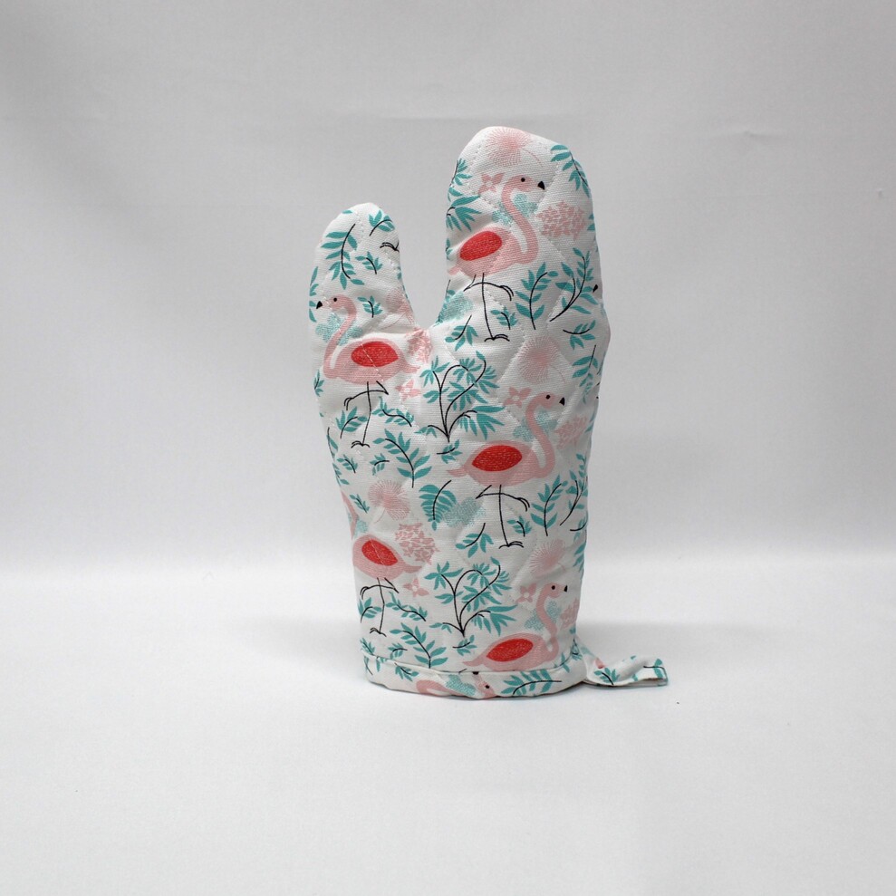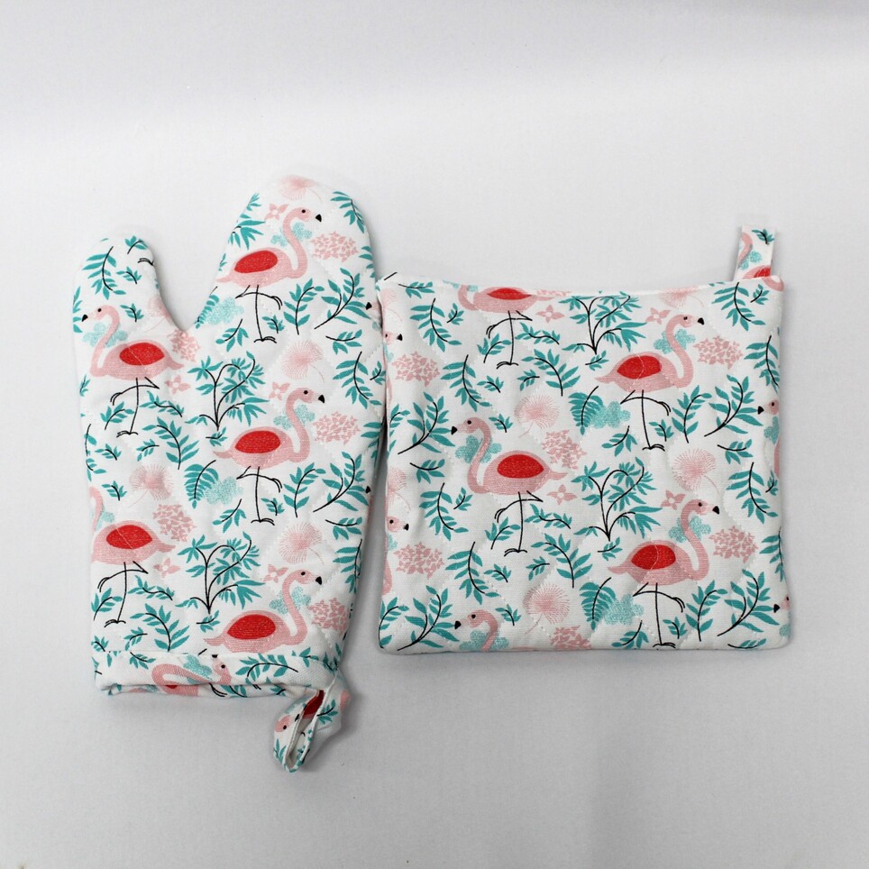 Pega e Luva acolchoada em algodão com estampado de flamingos.