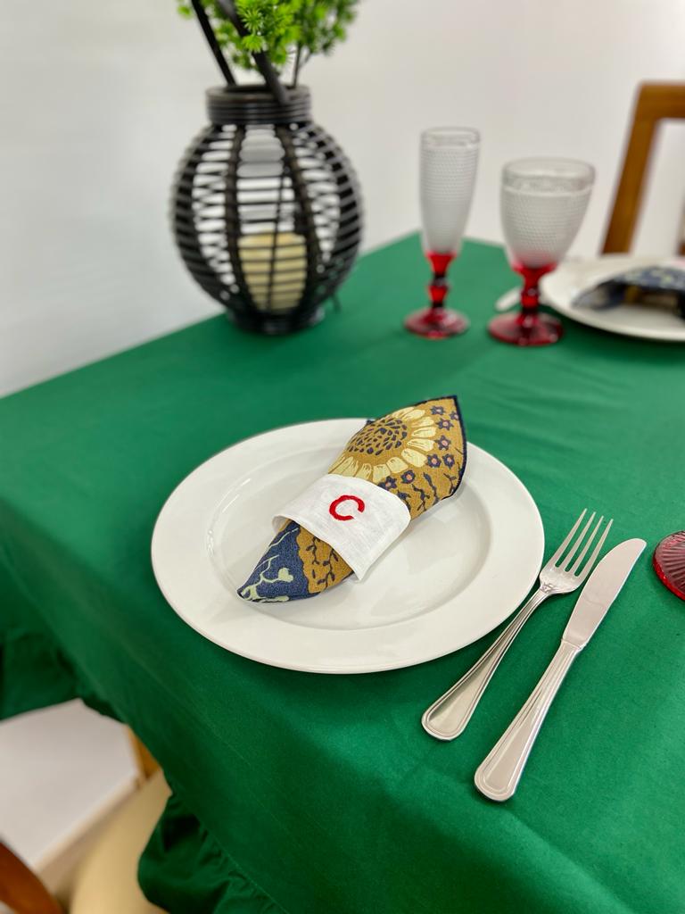 Porta Guardanapos em linho branco/pérola com fecho de molas e bordado de letra em vermelho.