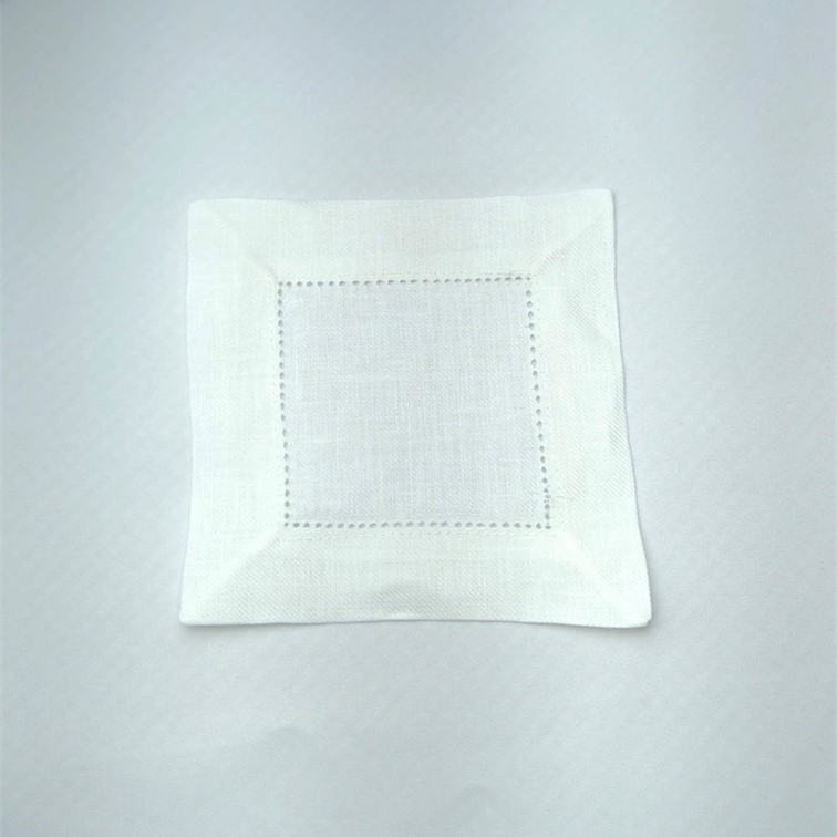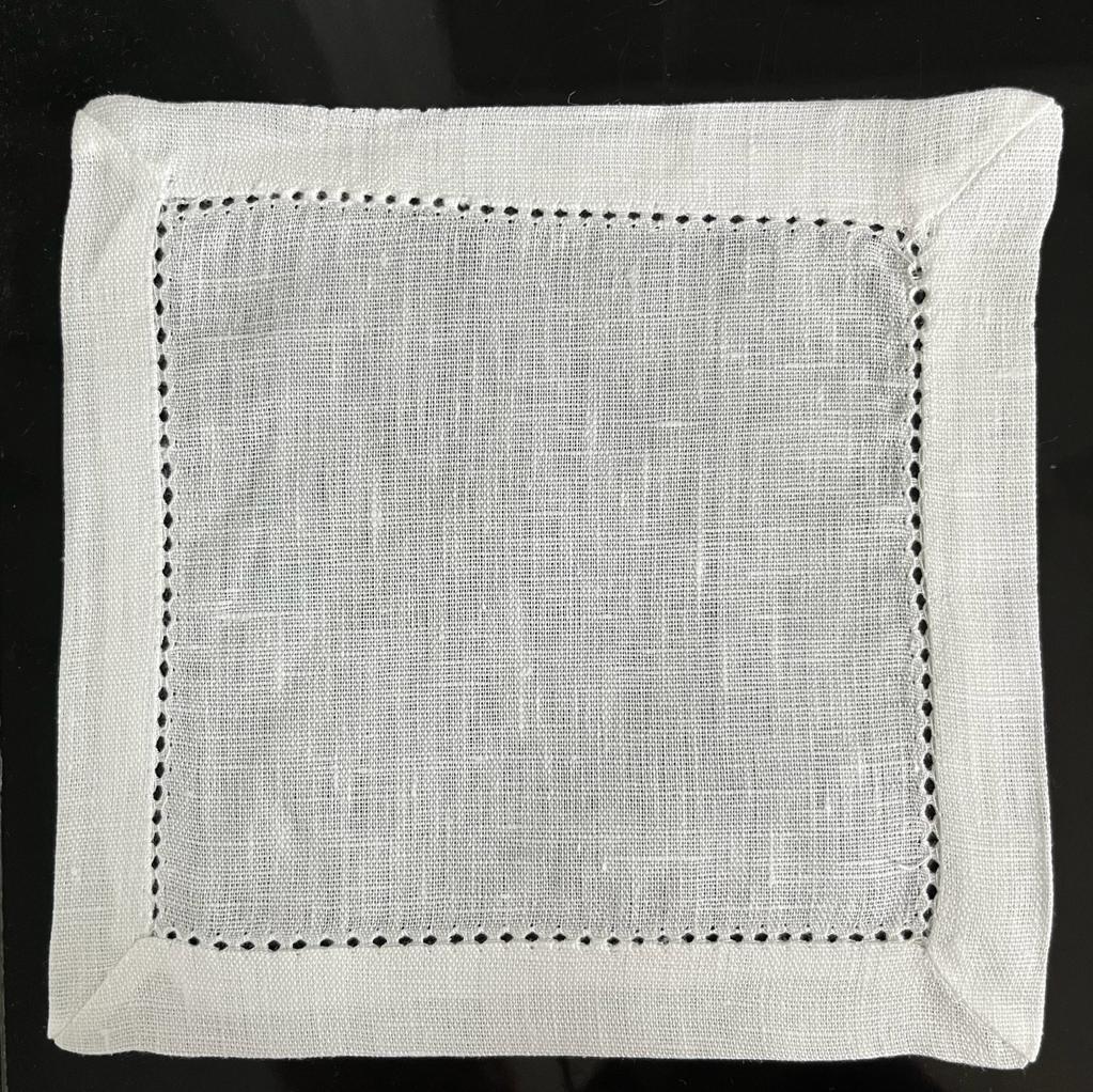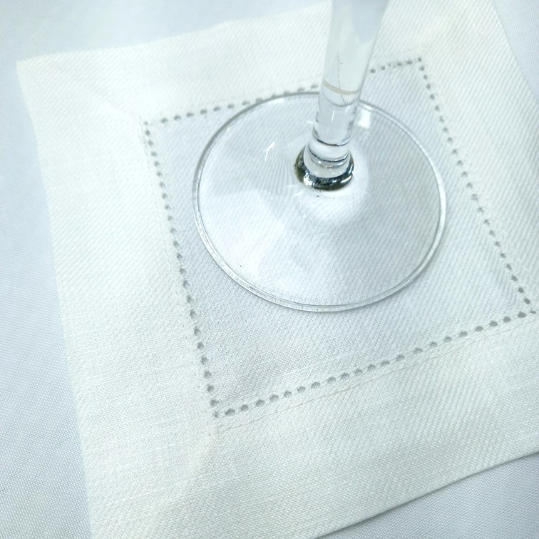 Base de copo em linho branco, bainha de 3 cm em ponto aberto. Também o podemos usar como guardanapo de coktail.